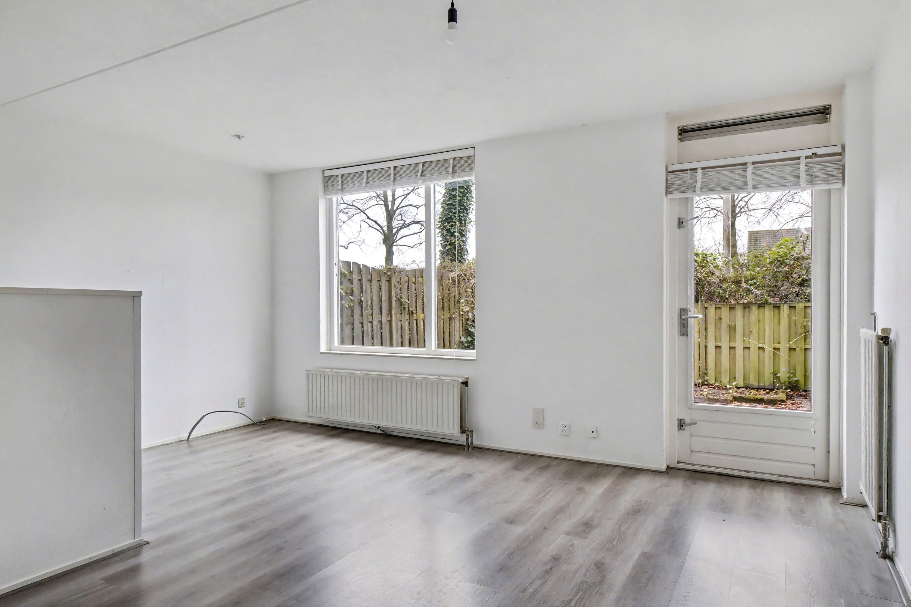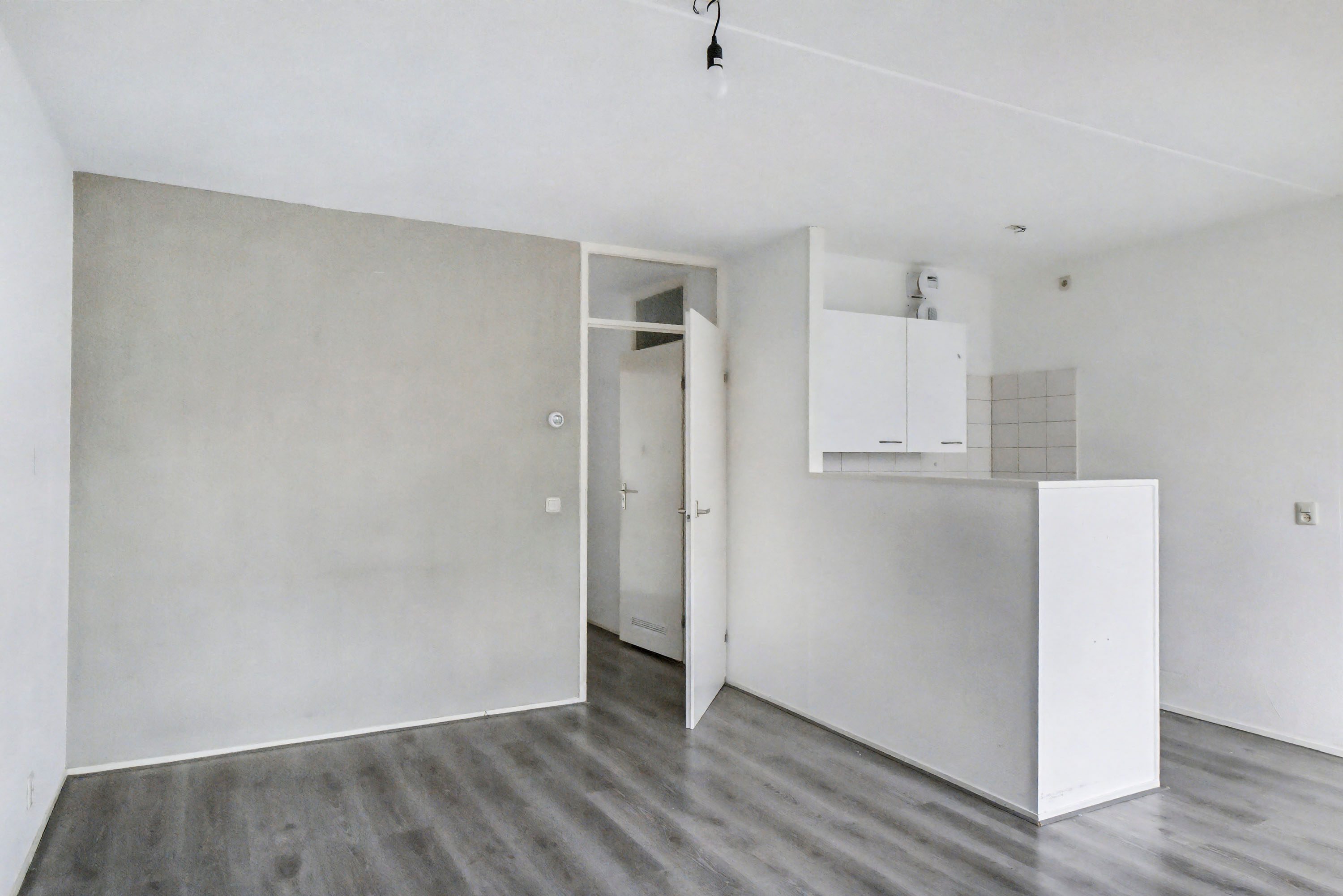 Je komt binnen in een ruime hal (ca. 3,8 m²) met toegang tot alle vertrekken. Aan de achterzijde ligt de lichte woonkamer met laminaatvloer en een eenvoudige open keuken.