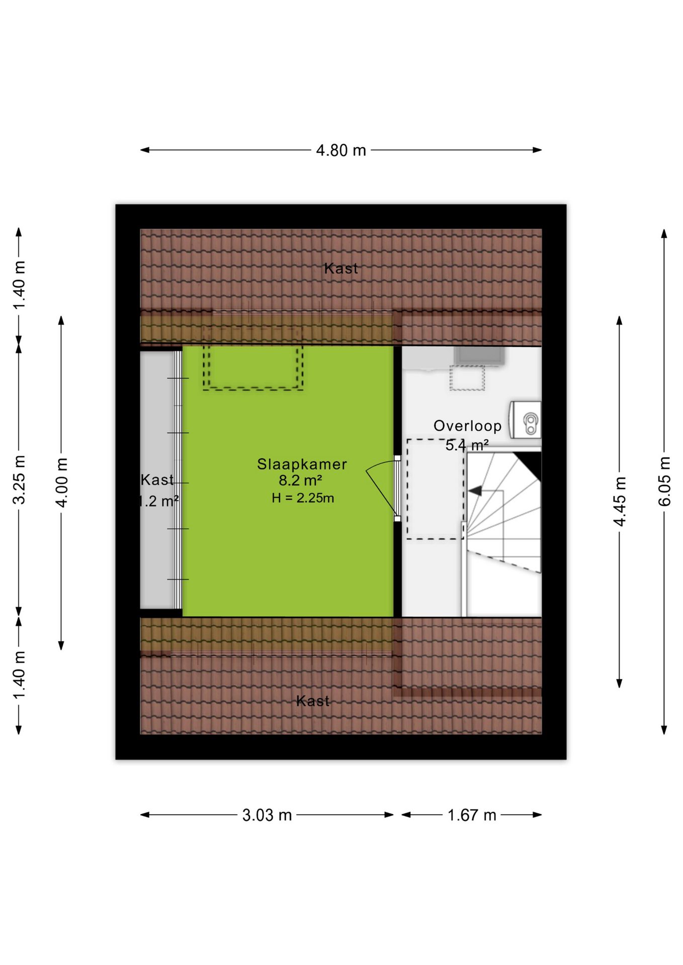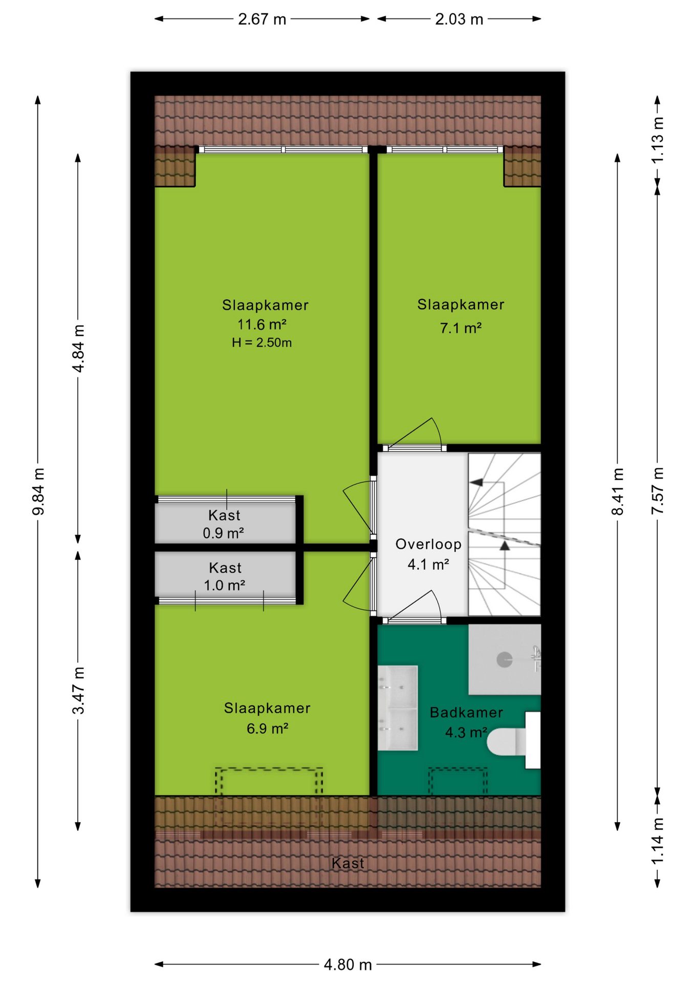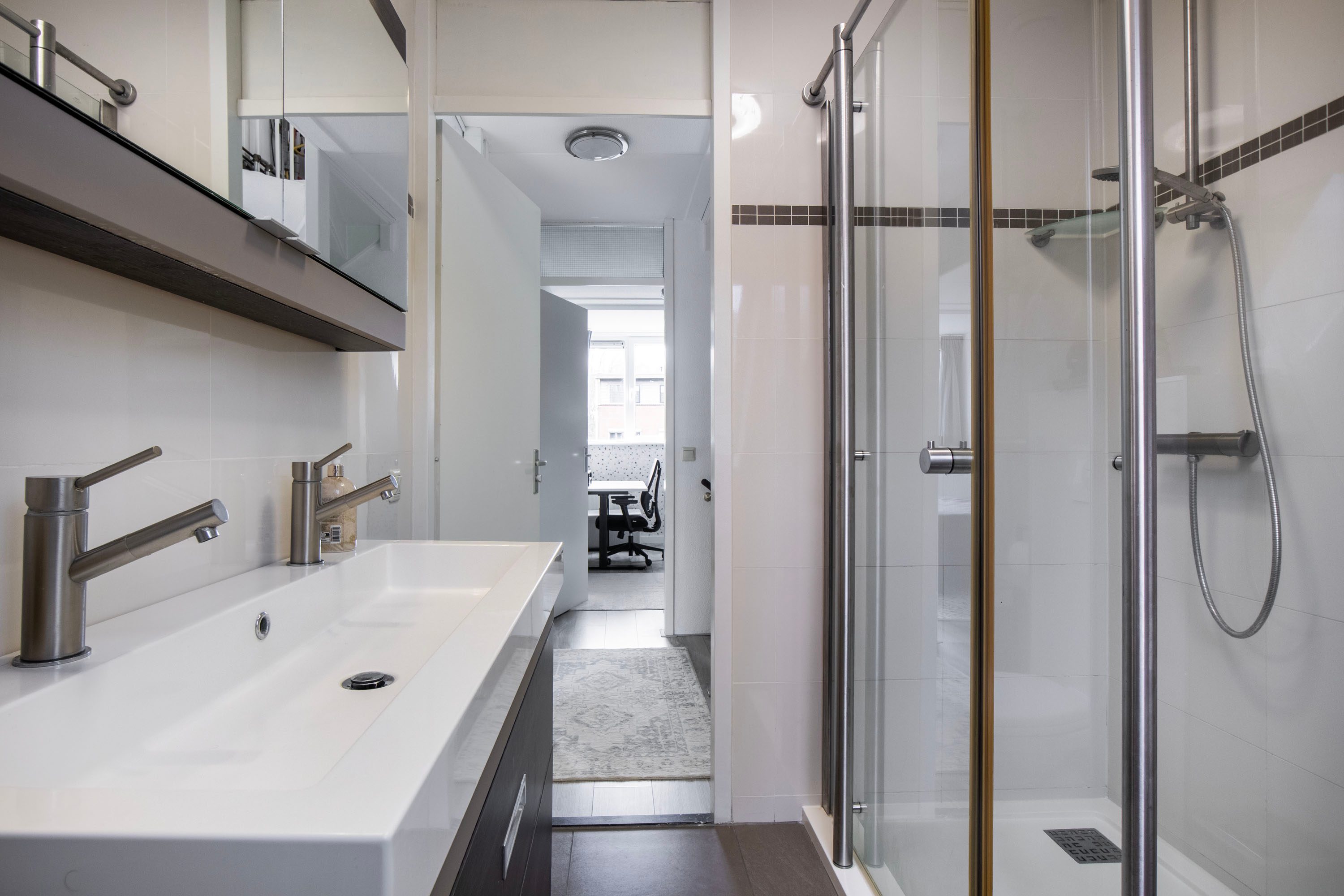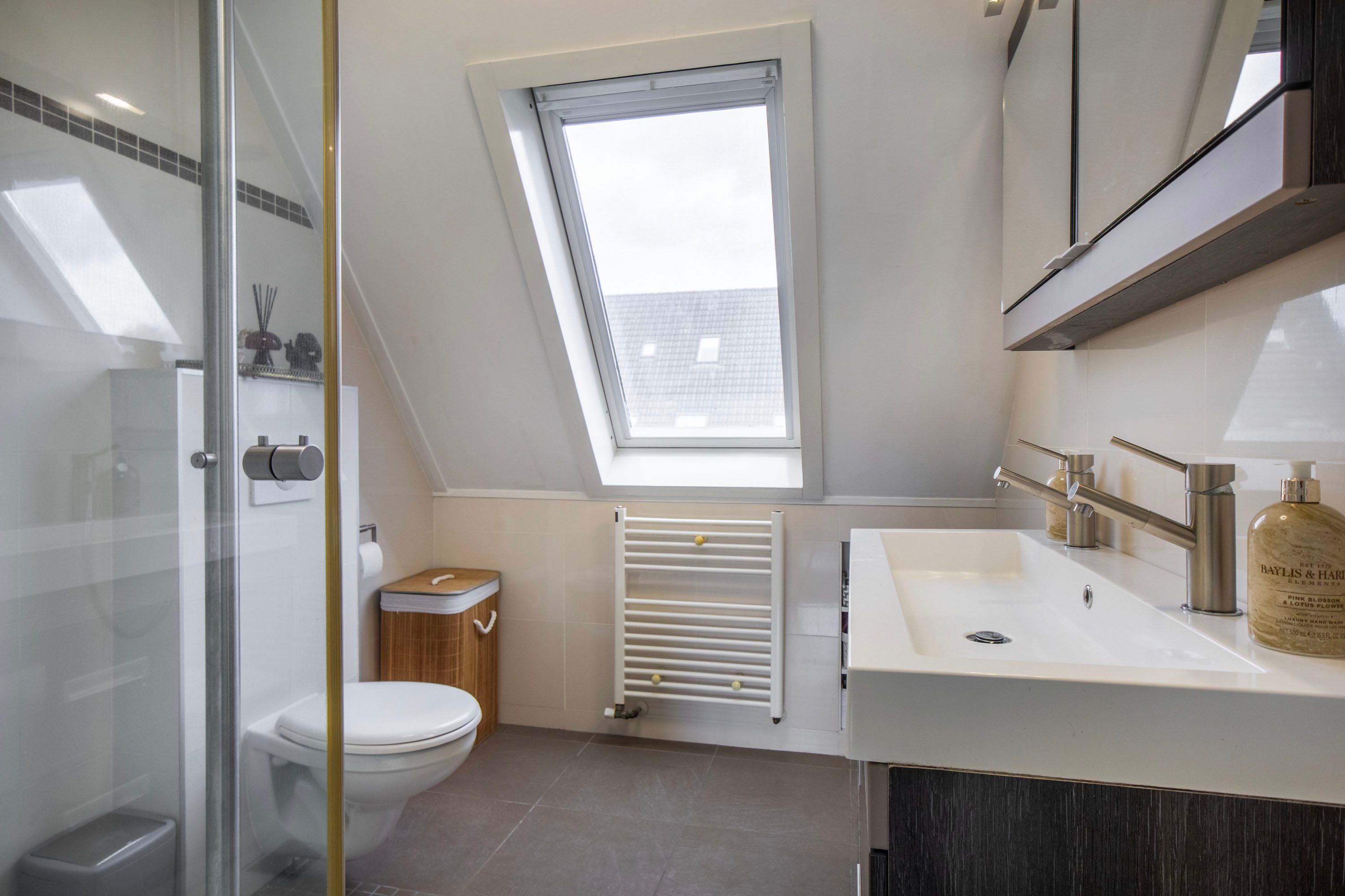 De badkamer is volledig betegeld en compleet uitgevoerd met een douchecabine, dubbele kranen, wastafelmeubel, tweede toilet en designradiator. Dankzij het dakraam komt hier ook prettig daglicht binnen.