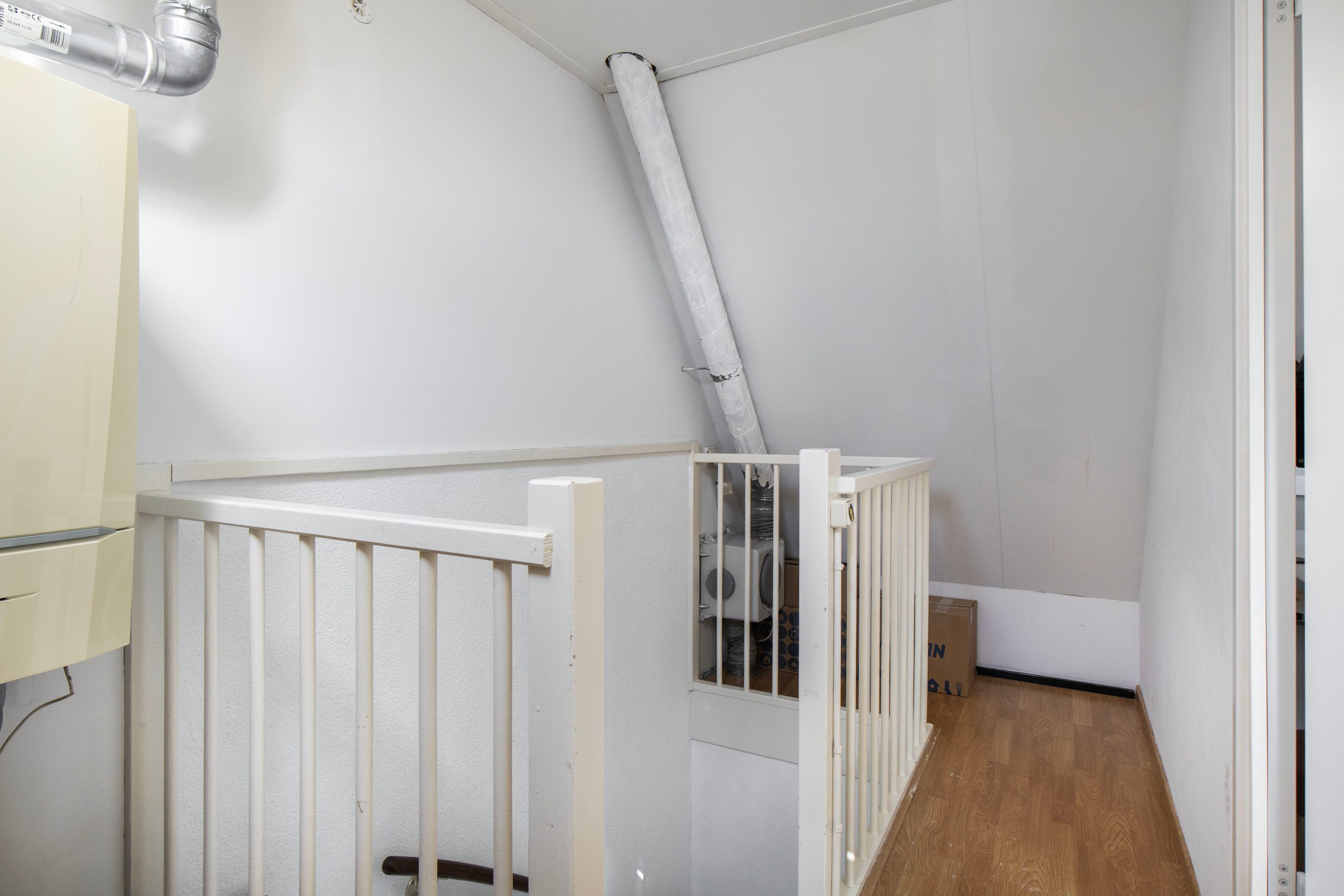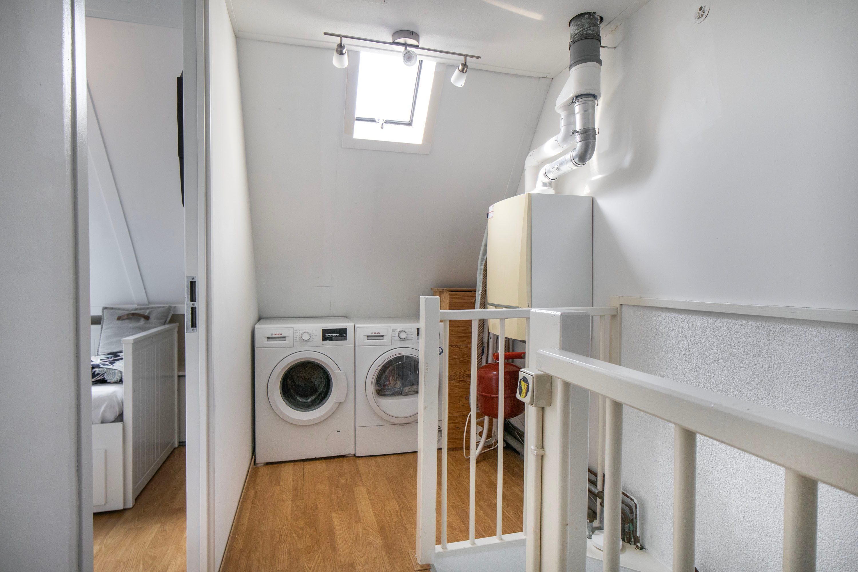 Via een vaste trap bereik je de tweede verdieping. Op de voorzolder vind je de cv-ketel (Remeha Calenta, 2011) en de wasmachineaansluiting. Daarnaast is hier een volwaardige vierde slaapkamer gerealiseerd. Deze kamer is licht dankzij het dakraam en beschikt over een vaste kast en bergruimte achter de knieschotten. Extra handig is de aanwezige vliering voor nog meer opslagruimte.
