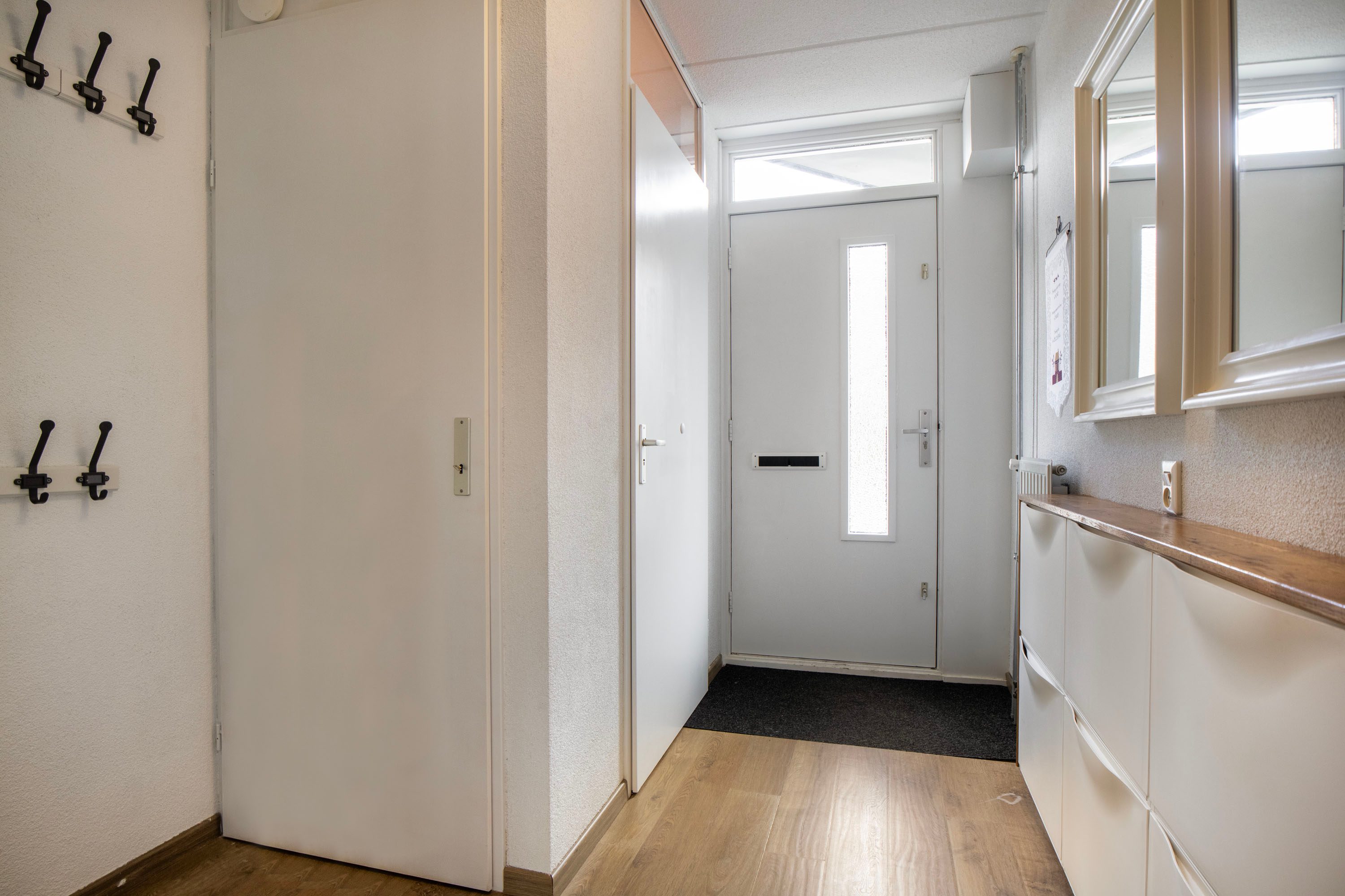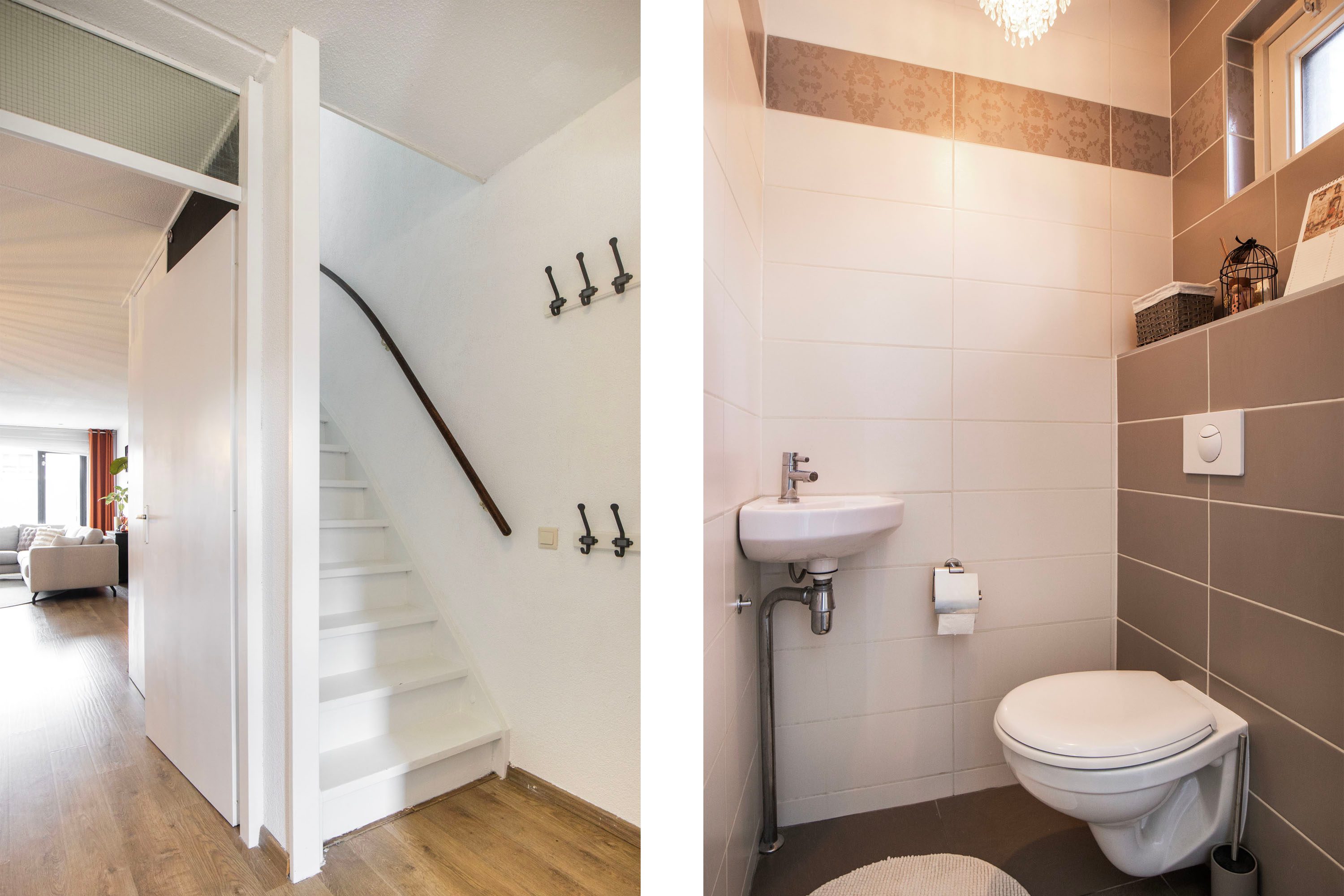 Je komt binnen in de hal met moderne meterkast en een nette toiletruimte met zwevend toilet en fonteintje.