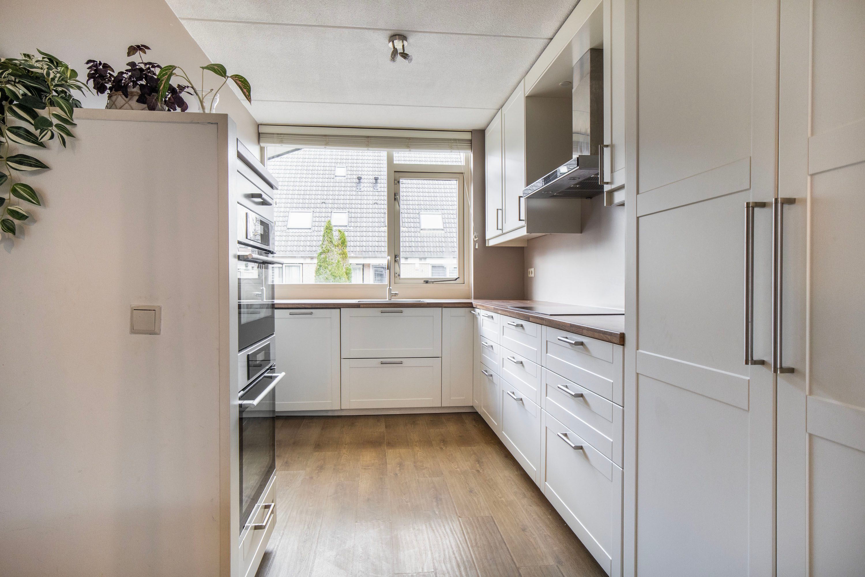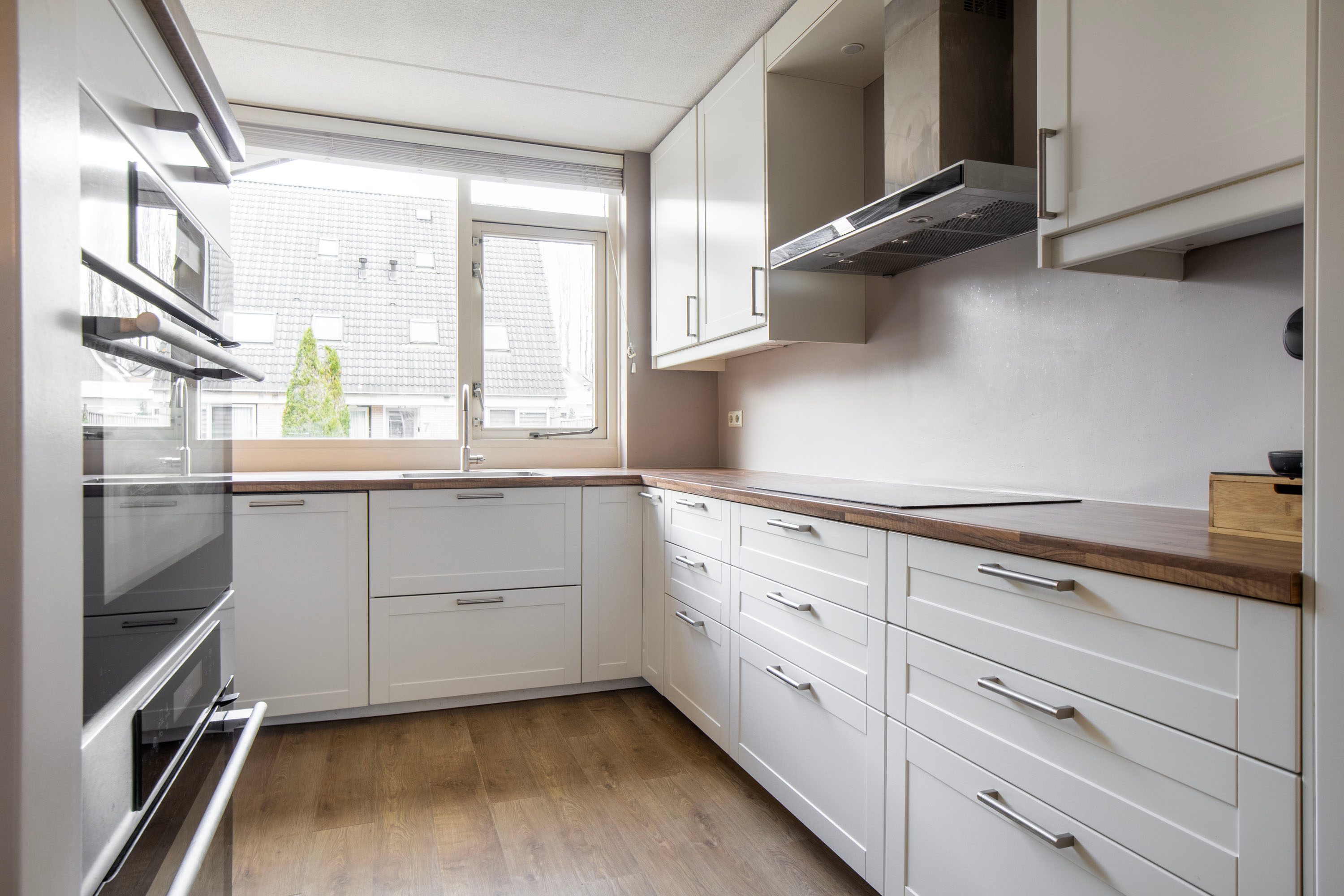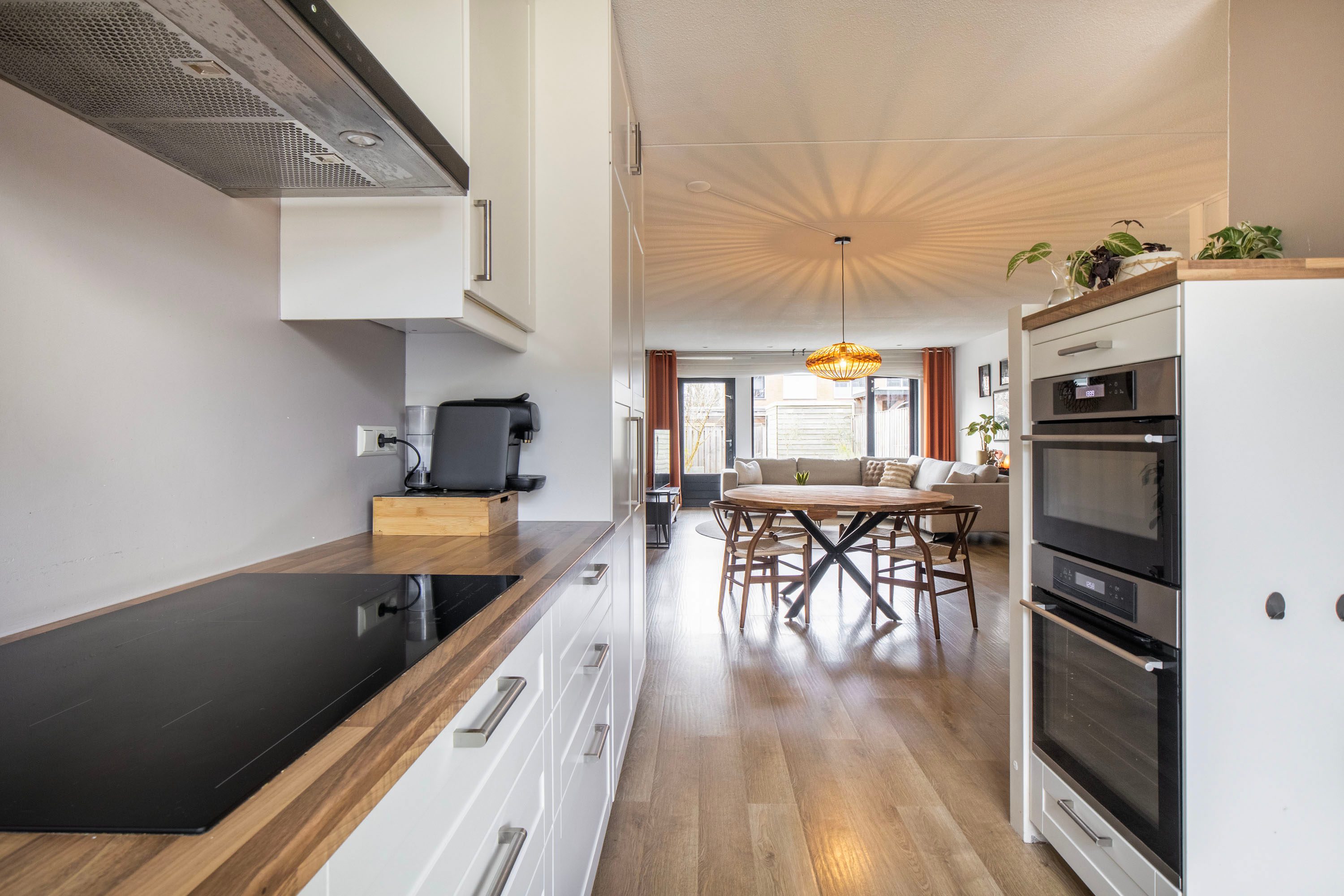 De open keuken, vernieuwd in 2016, is uitgevoerd in een L-opstelling met een extra keukenblok. Hier beschik je over alles wat je nodig hebt: inductiekookplaat, afzuigkap, vaatwasser, koelkast, vriezer, oven en combimagnetron. De slimme indeling zorgt voor veel werkruimte én opbergruimte.
