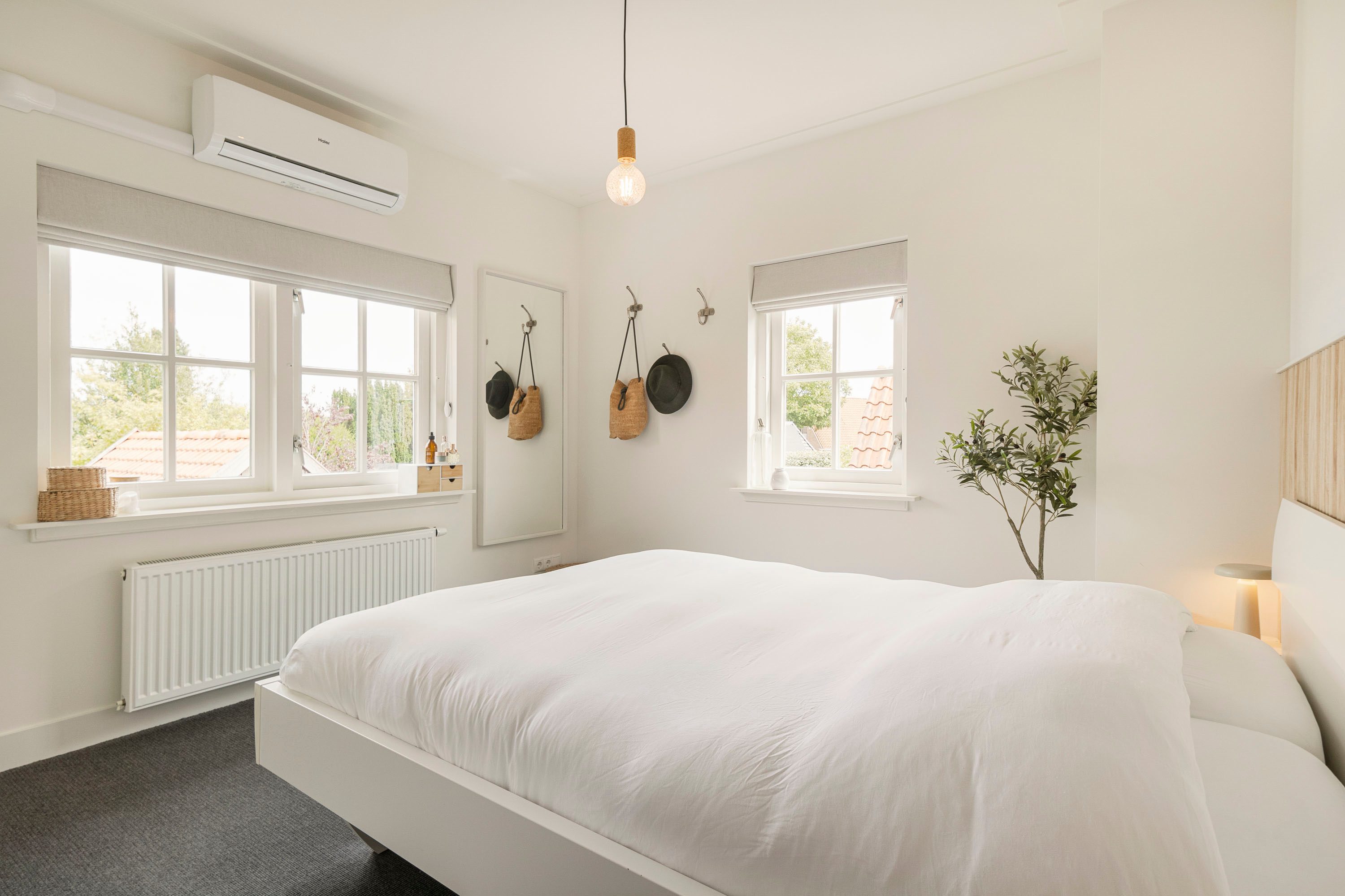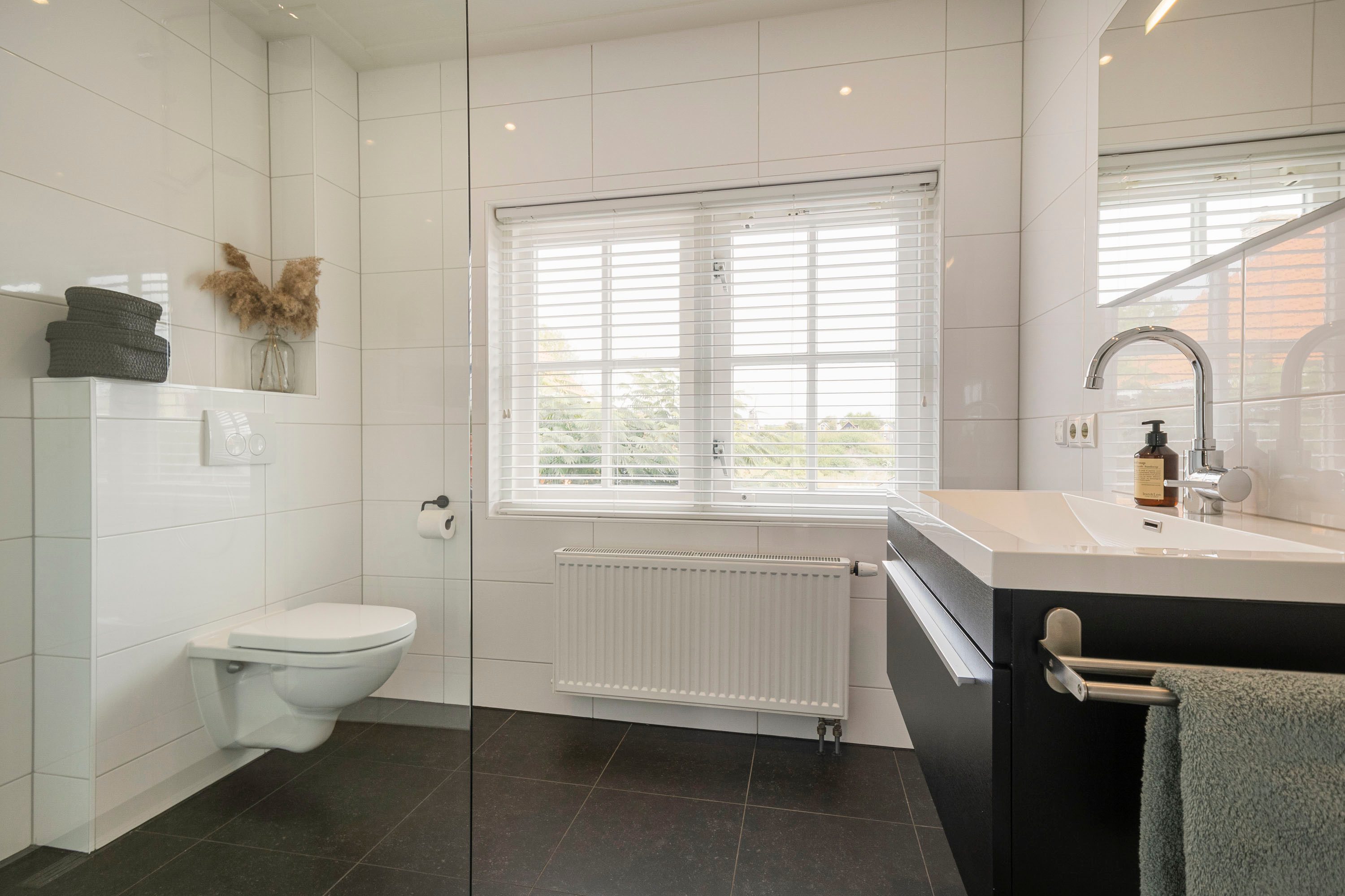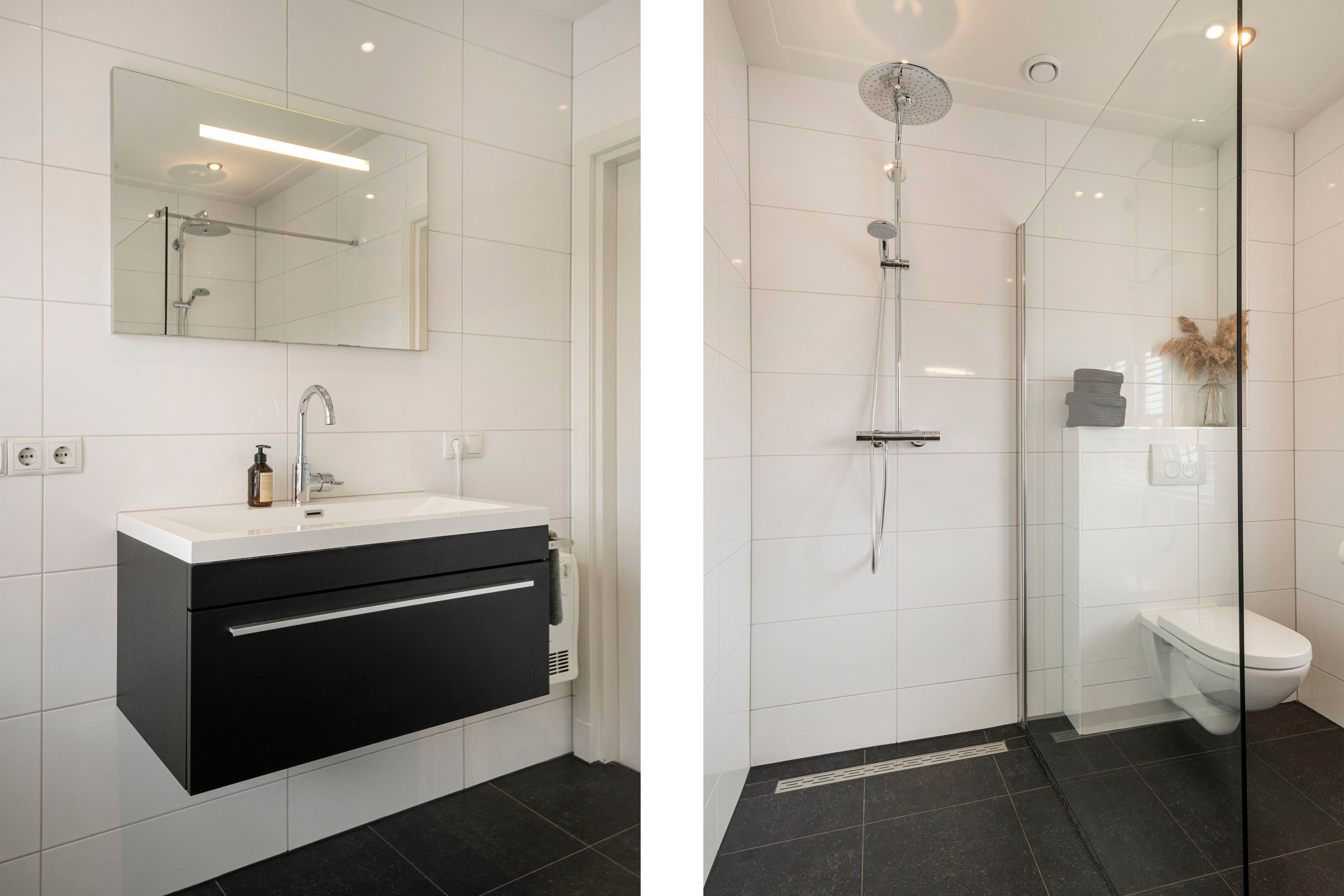 Op de eerste verdieping liggen drie slaapkamers van circa 12 m², 11 m² en 5 m². De slaapkamer aan de achterzijde beschikt over airconditioning en een vaste kastenwand. De moderne badkamer is uitgerust met een inloopdouche, toilet en wastafel met meubel.