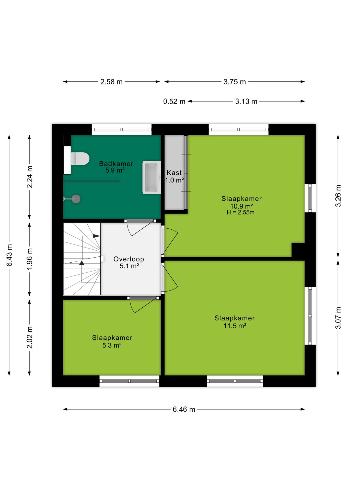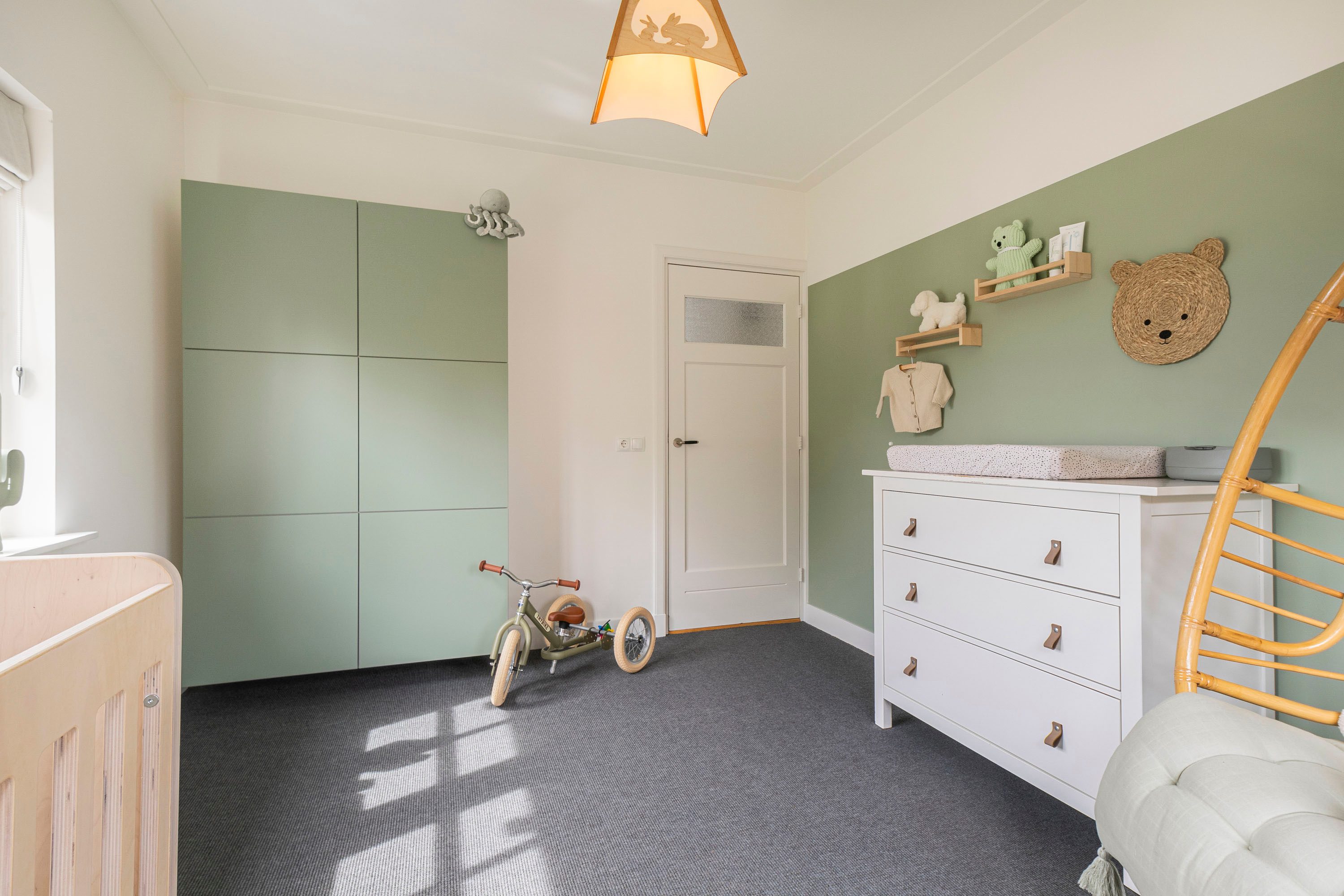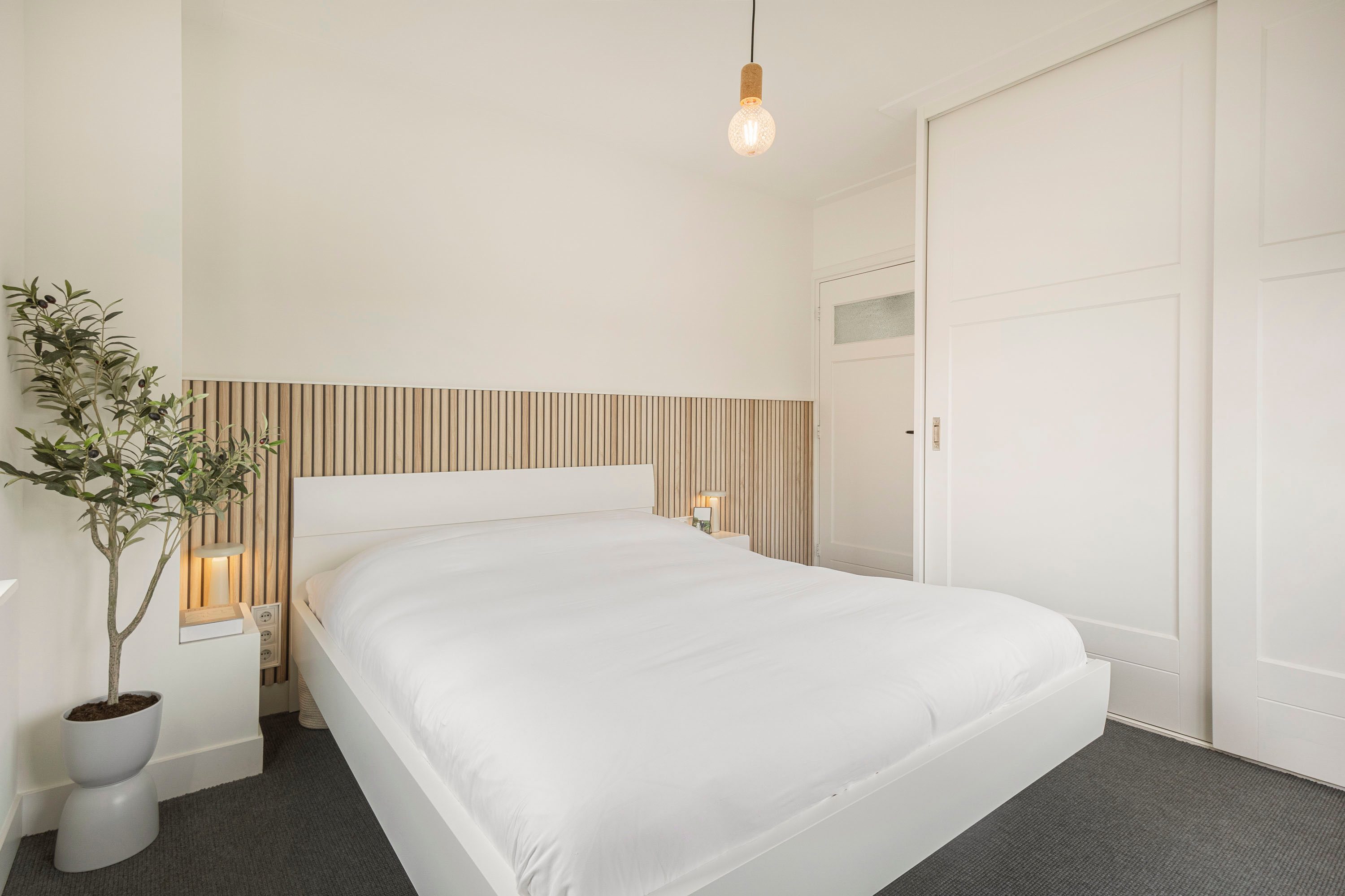 Op de eerste verdieping liggen drie slaapkamers van circa 12 m², 11 m² en 5 m². De slaapkamer aan de achterzijde beschikt over airconditioning en een vaste kastenwand. De moderne badkamer is uitgerust met een inloopdouche, toilet en wastafel met meubel.