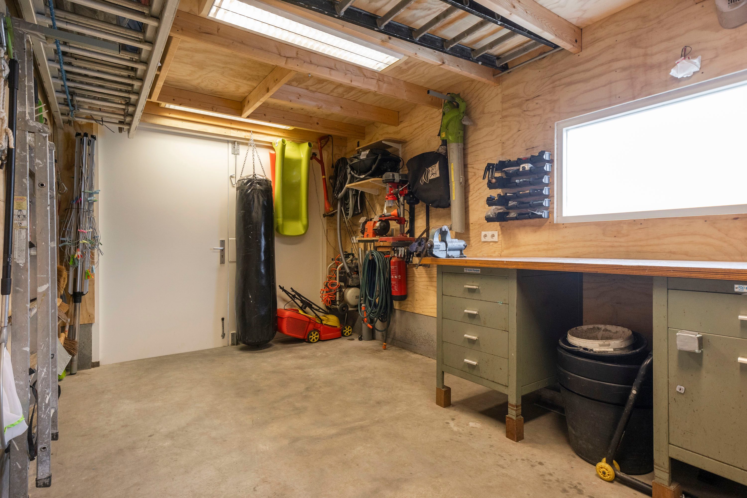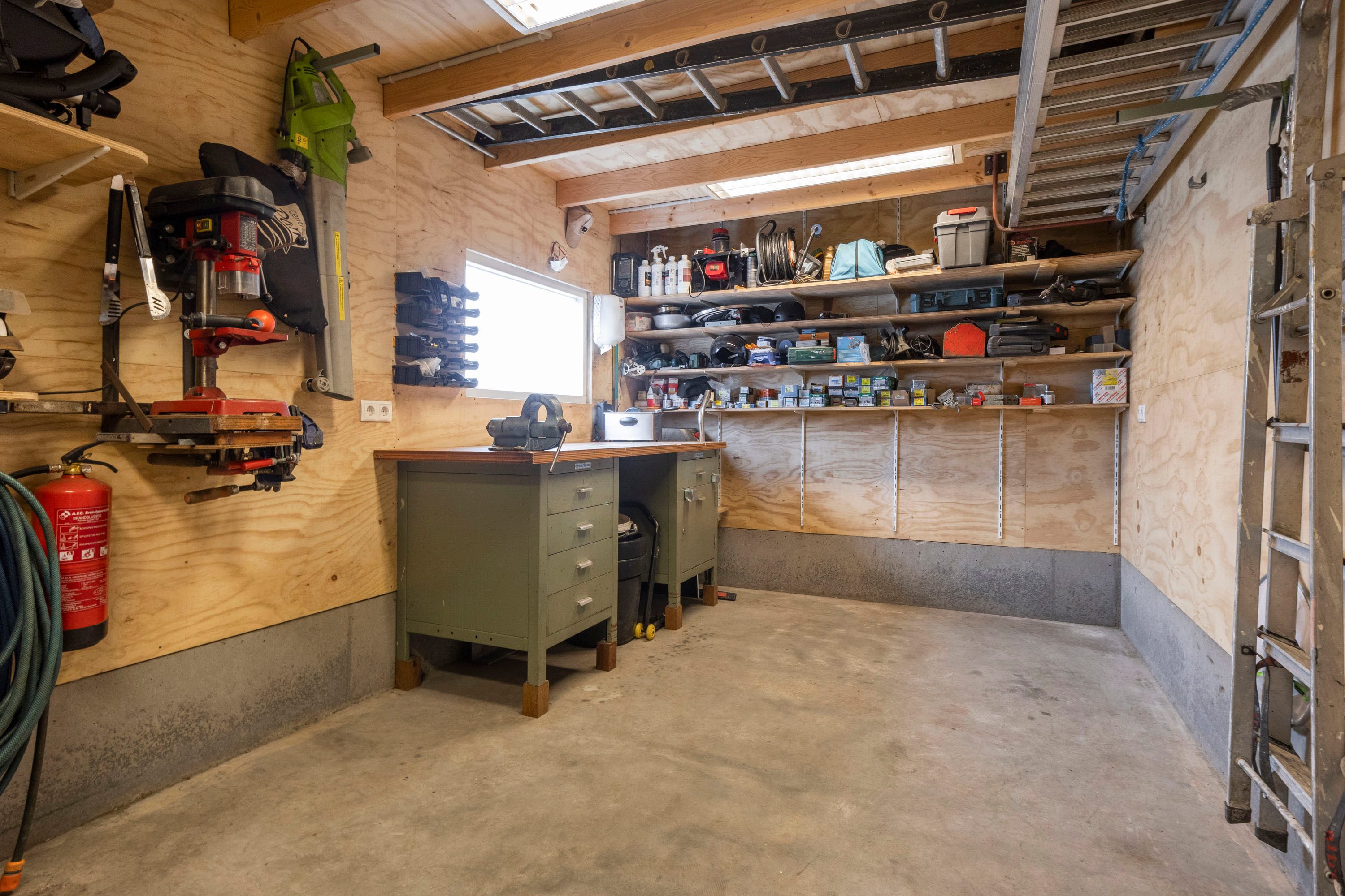 De vrijstaande houten berging met vliering (gebouwd in 2017) is de ideale ruimte voor hobby-, werk- en/of praktijkruimte of voor het stallen van fietsen en tuingereedschap.