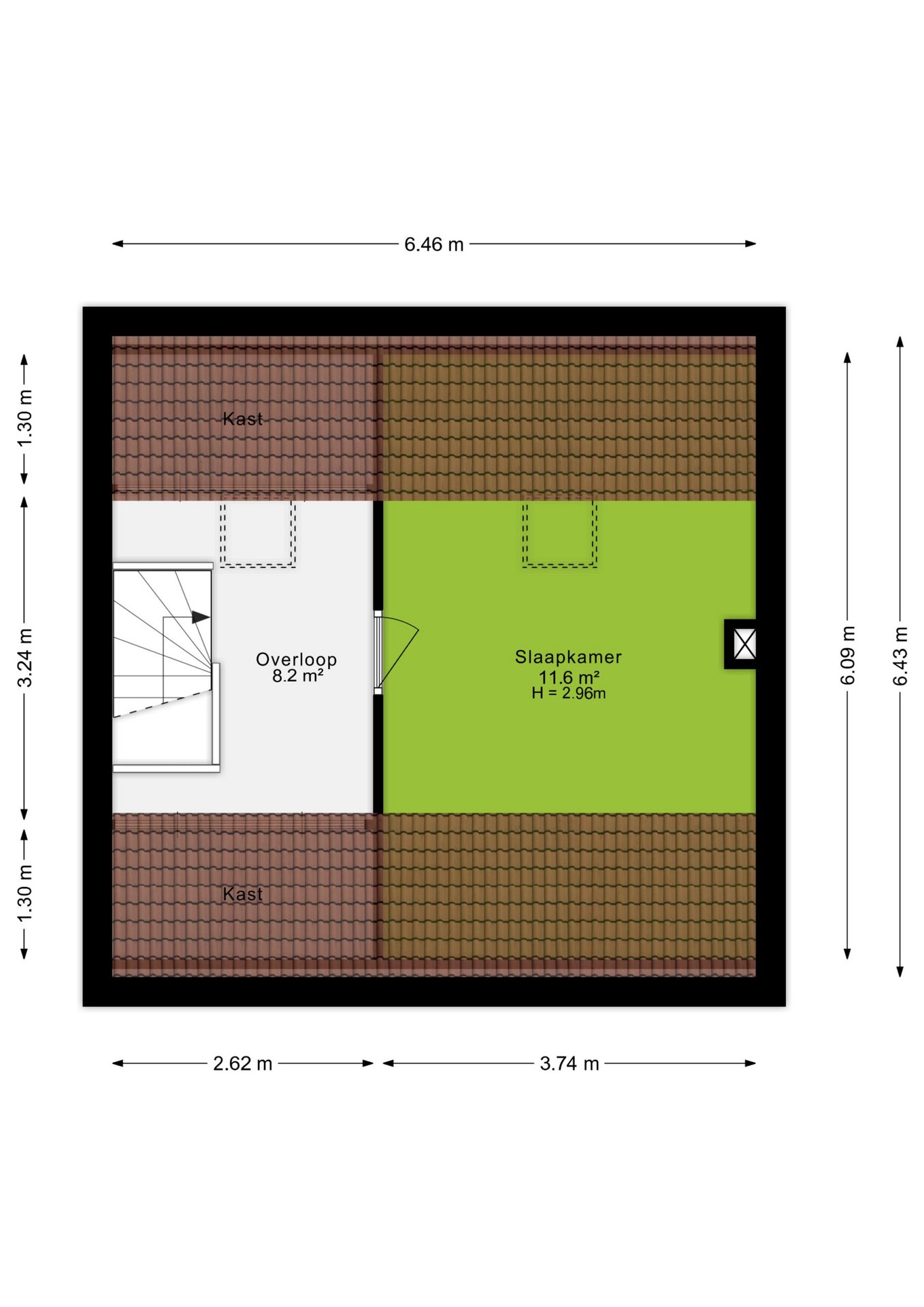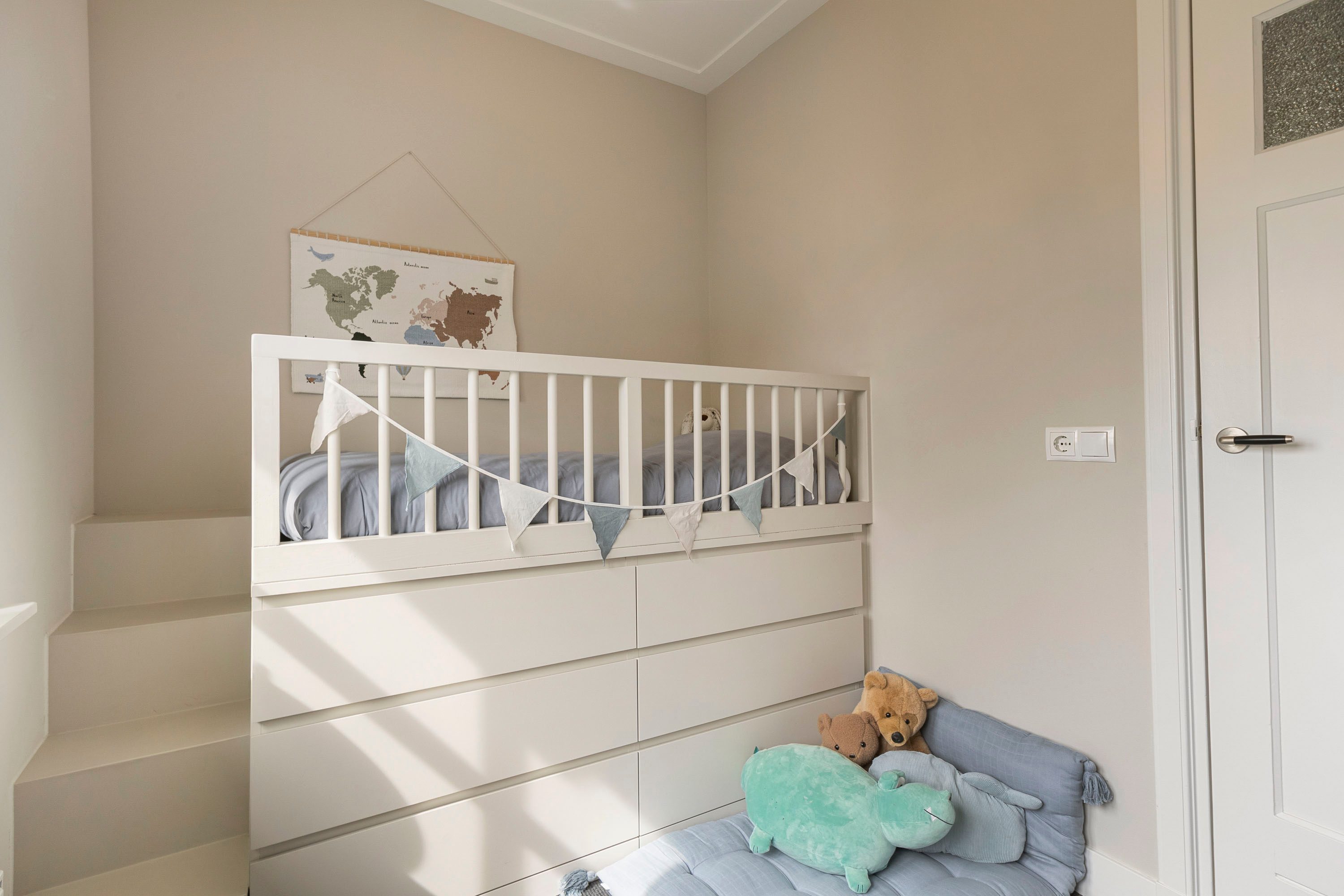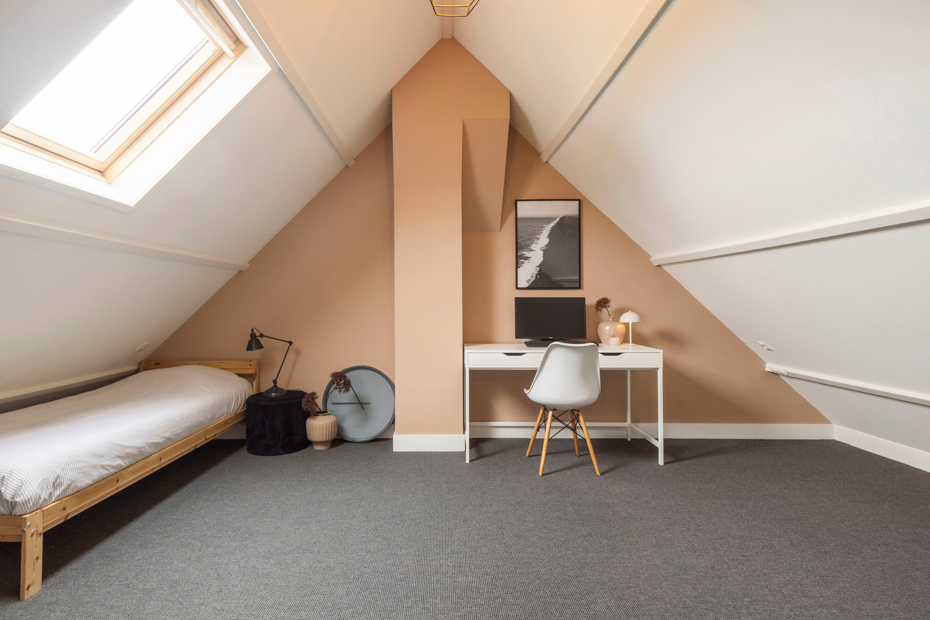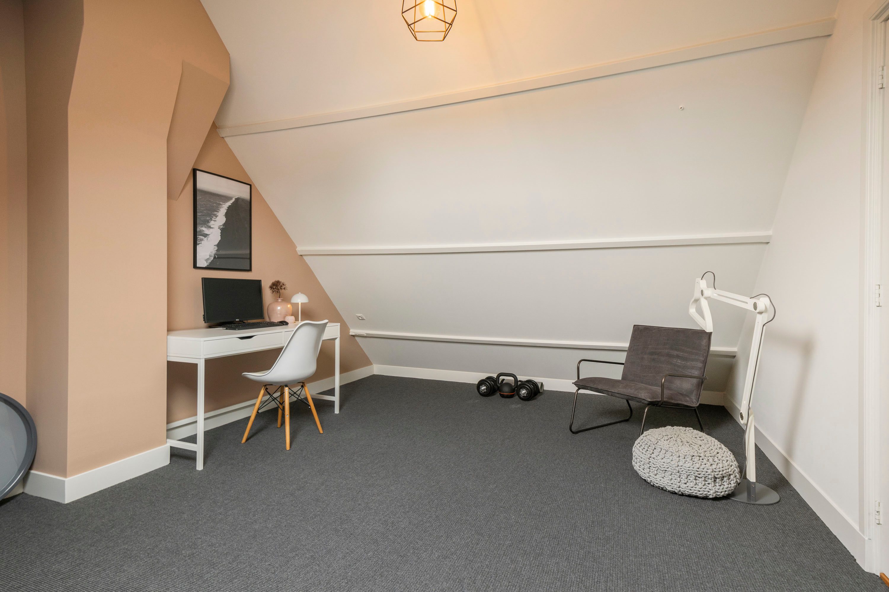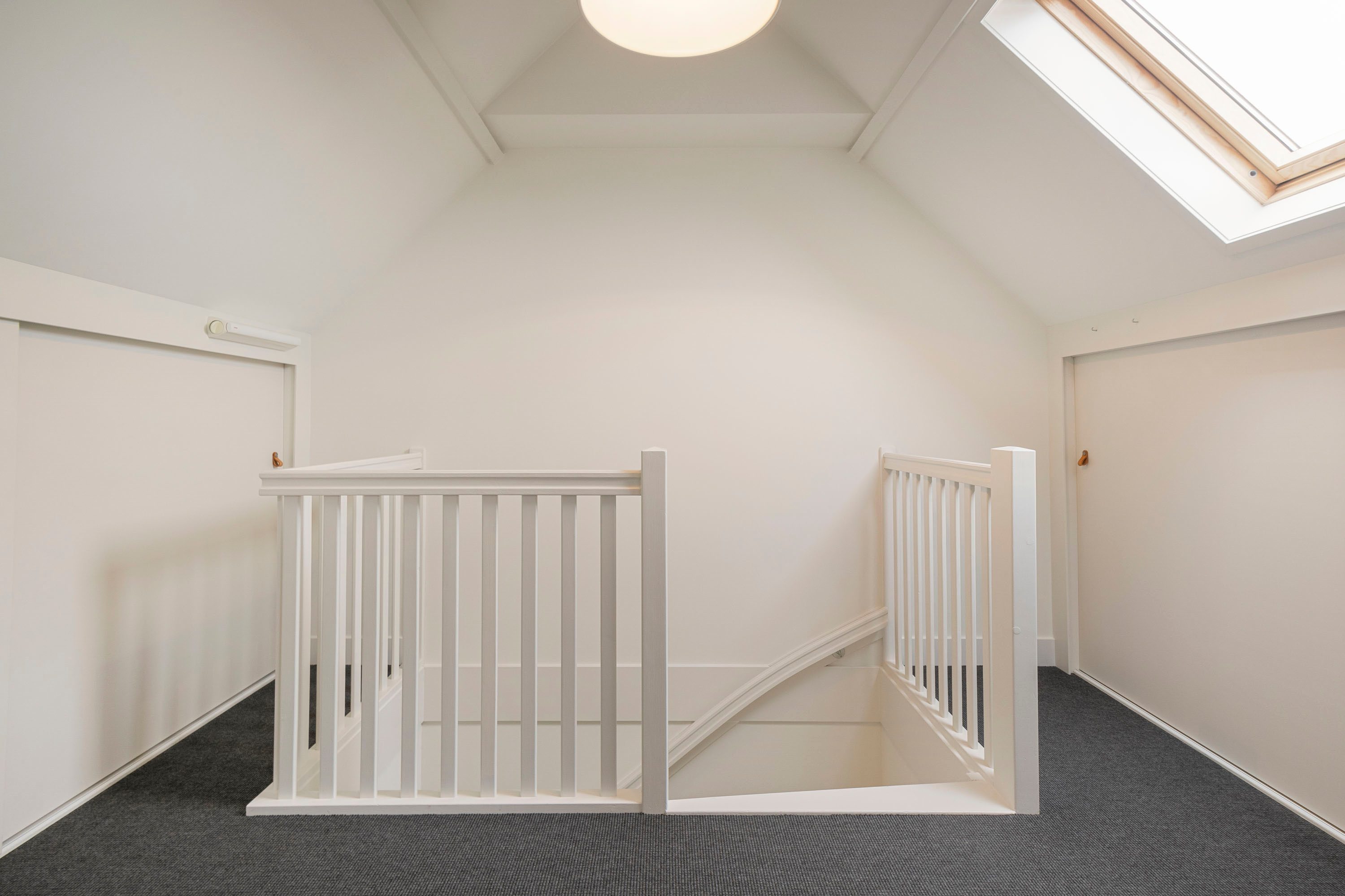 Via de vaste trap bereik je de tweede verdieping met overloop, opbergruimte achter de schotten en een slaapkamer van circa 12 m². Beide ruimtes hebben een dakraam en voorbereidingen voor warm- en koudwateraansluitingen en afvoer zijn al aanwezig.
