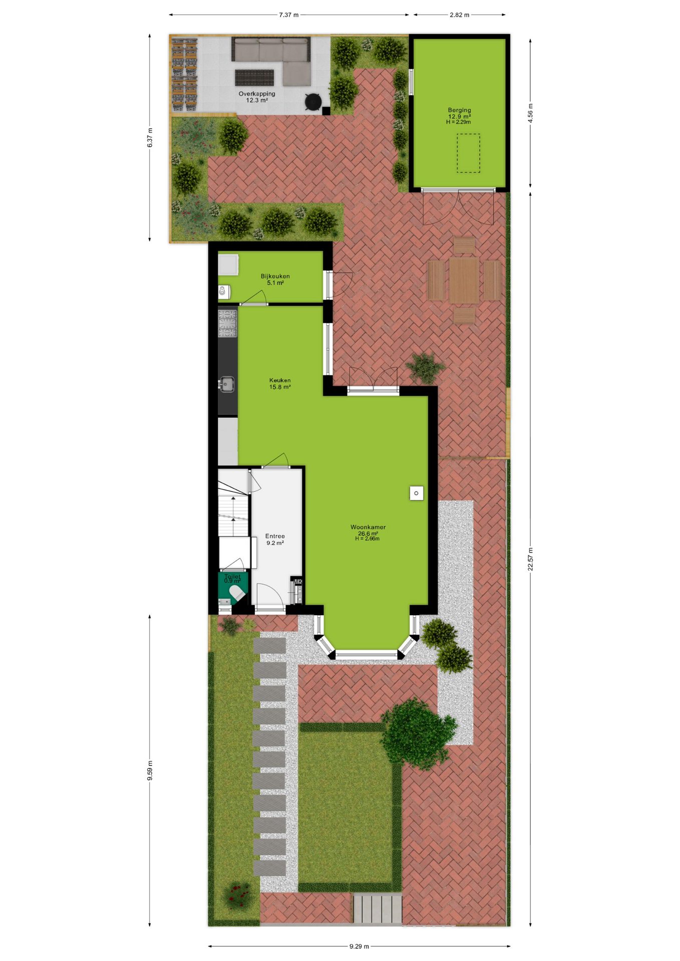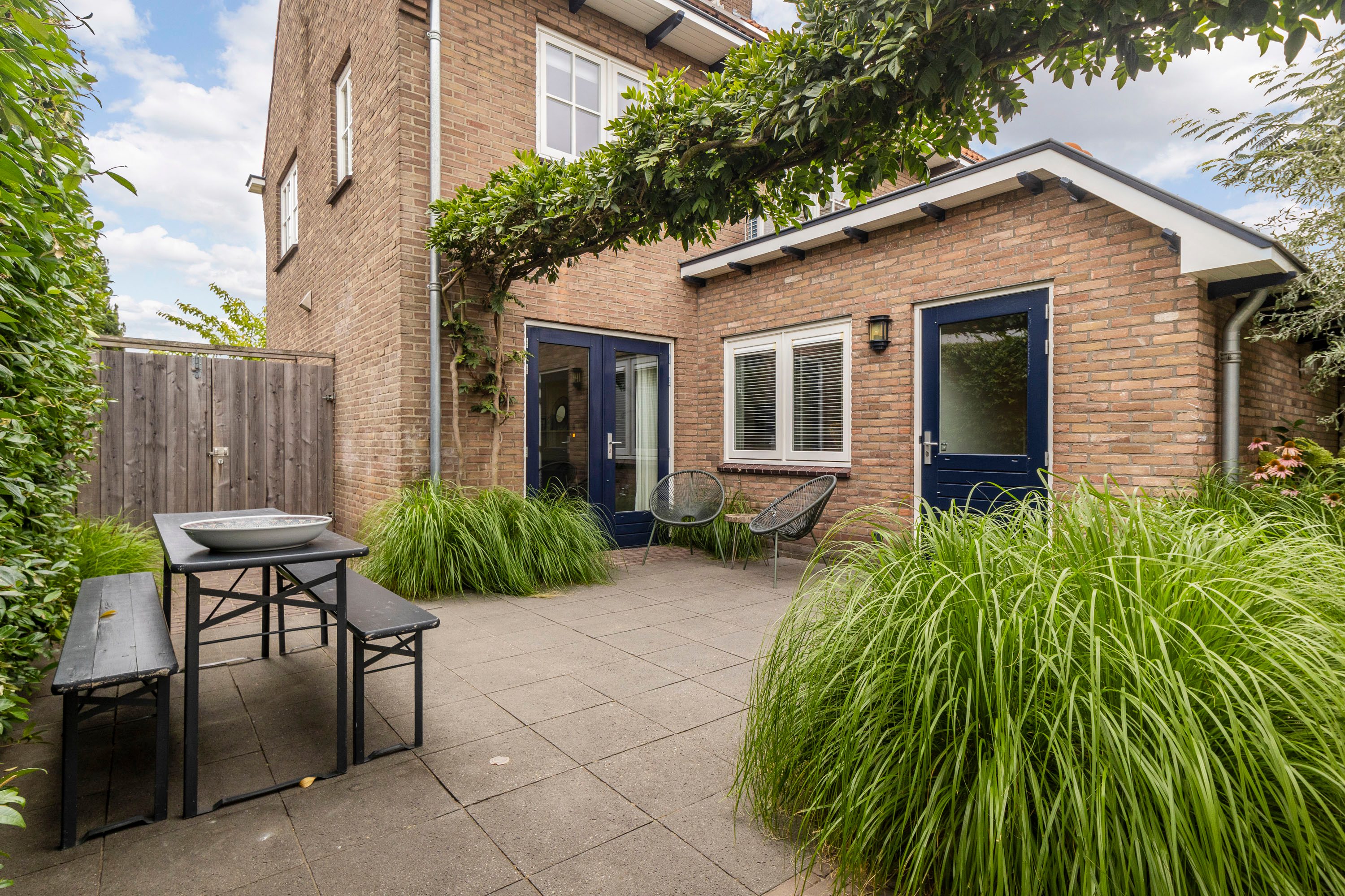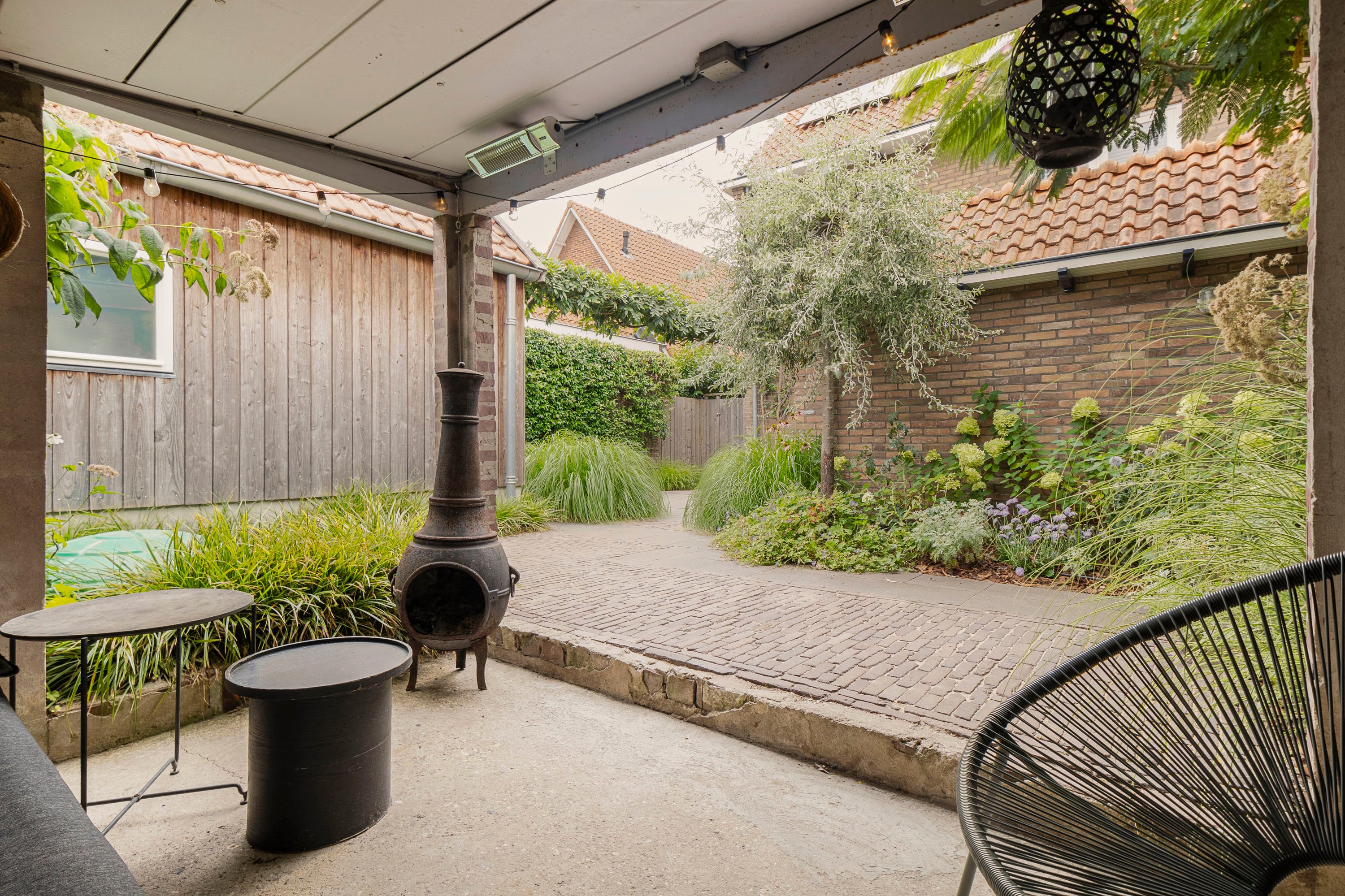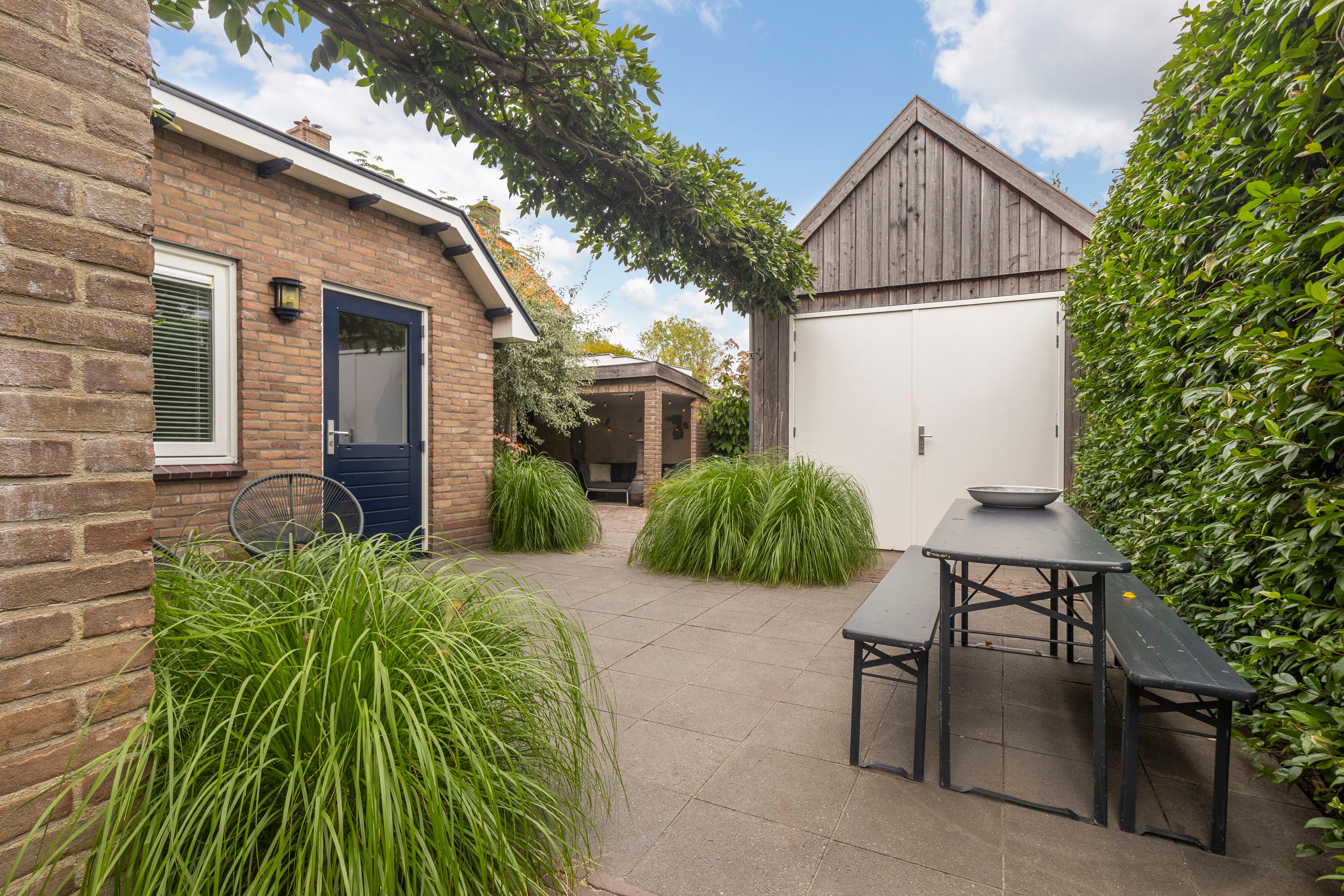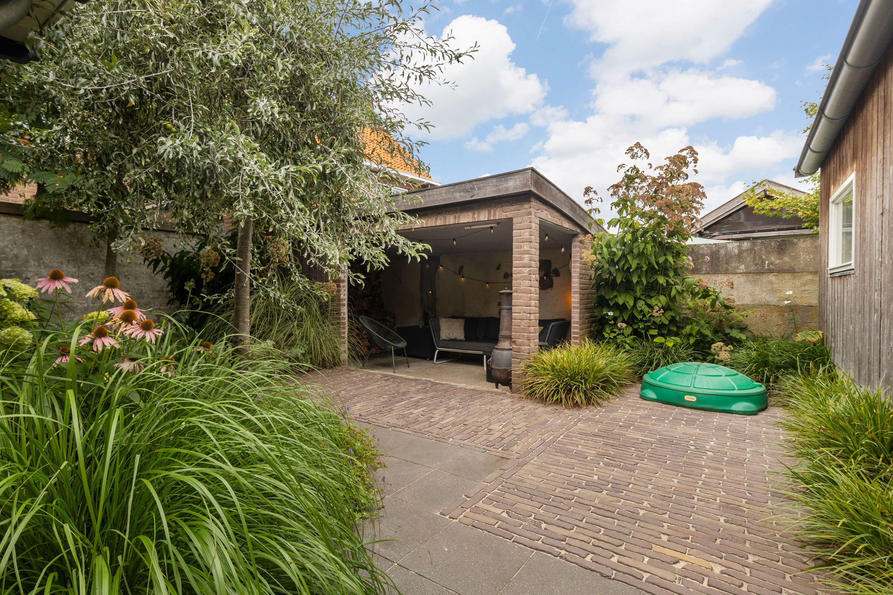 De achtertuin is georiënteerd op het noordoosten en beschikt over een overkapping van ongeveer 12m². De voortuin is zo ingericht dat je er zowel over voldoende privacy als ruimte beschikt om buiten te zitten en te genieten van de avondzon. Zo heb je altijd een fijn plekje: 's ochtends voor het keukenraam, 's middags onder de overkapping en 's avonds bij de erker. In zowel de voortuin als de achtertuin zijn druppelslangen en sproeiers aangelegd in het gras.