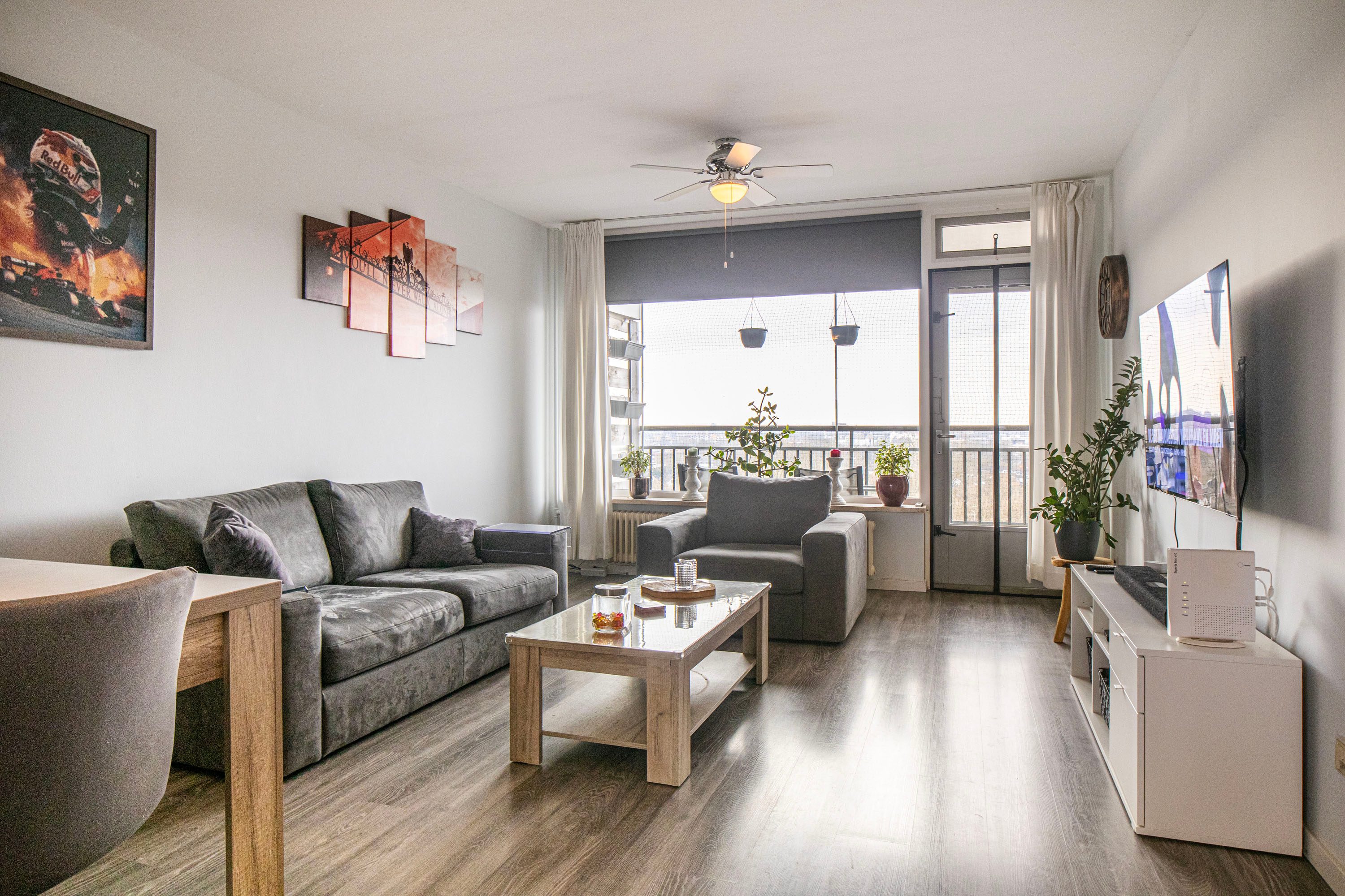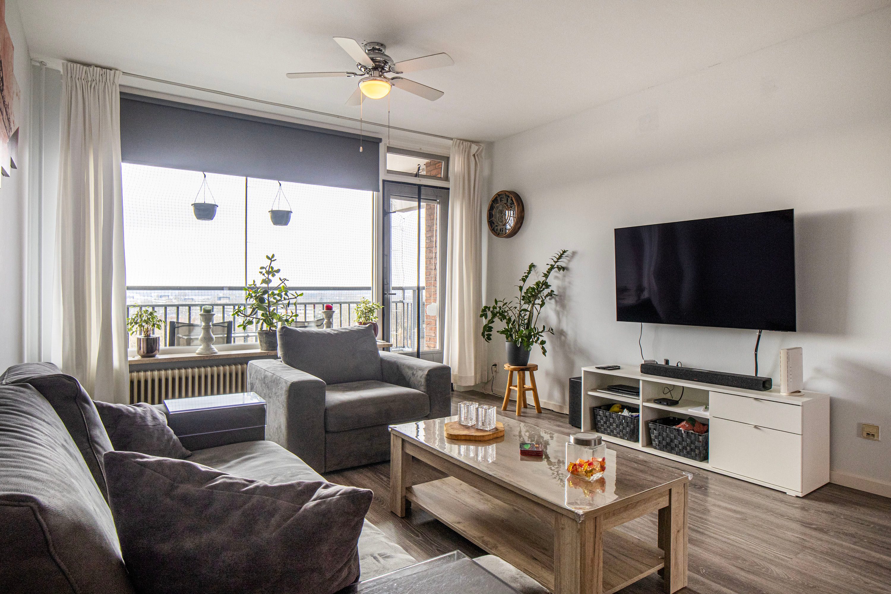 De woonkamer biedt voldoende ruimte voor een comfortabele zithoek en een gezellige eethoek. Vanuit hier heb je direct toegang tot het balkon op het zuiden.