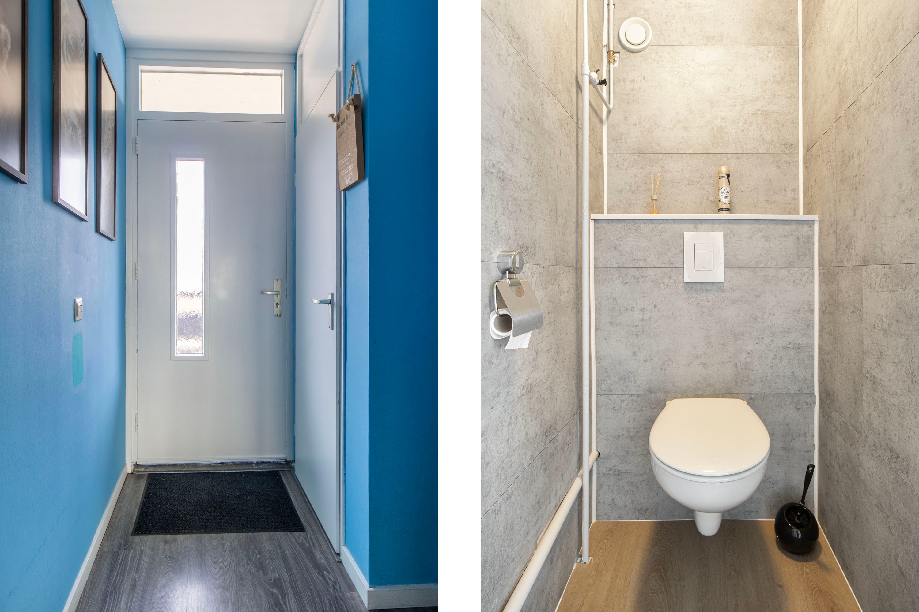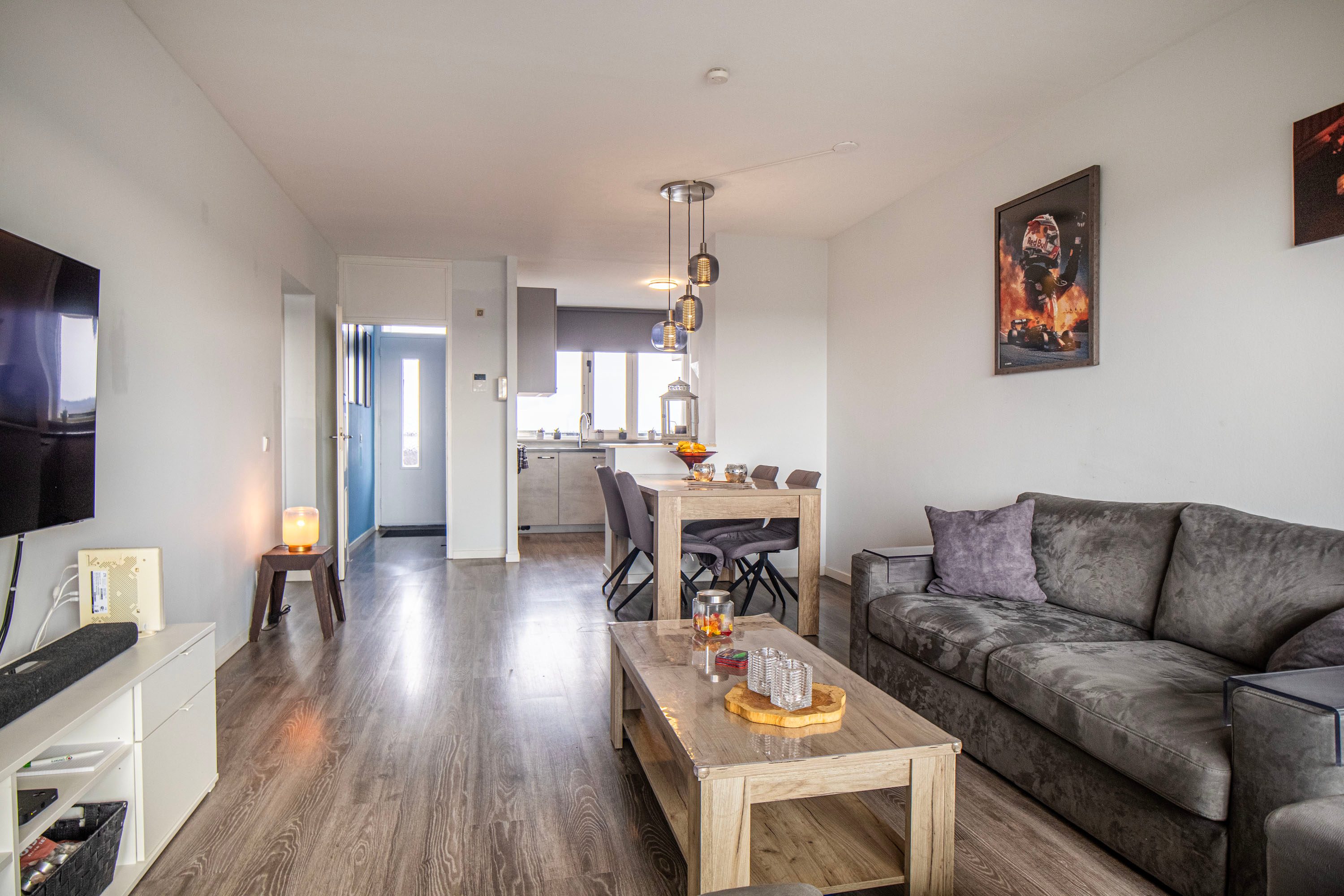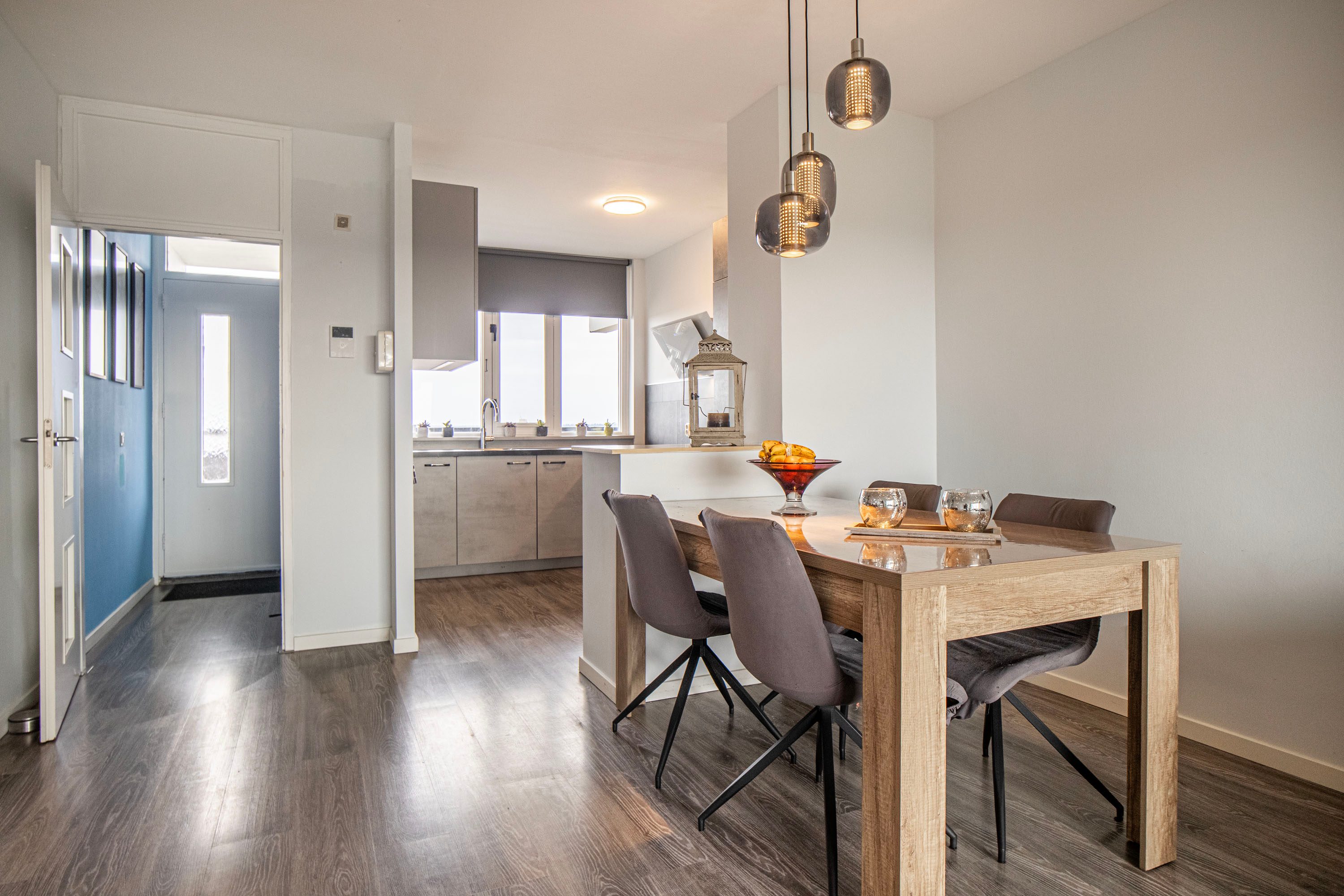 Bij binnenkomst in de entree tref je de meterkast. Vanuit de hal loop je de lichte leefruimte in. Dankzij de open indeling en de grote raampartijen aan zowel de voor- als achterzijde geniet je hier van veel natuurlijk daglicht.