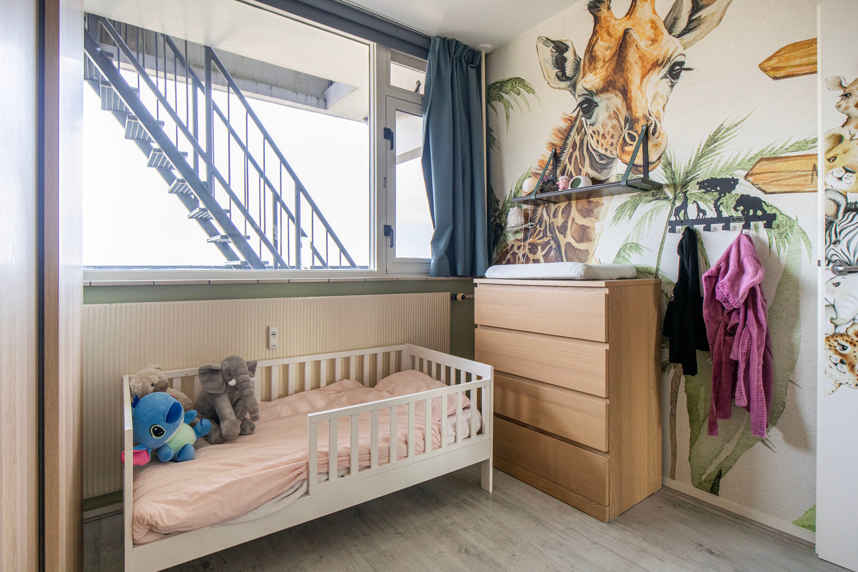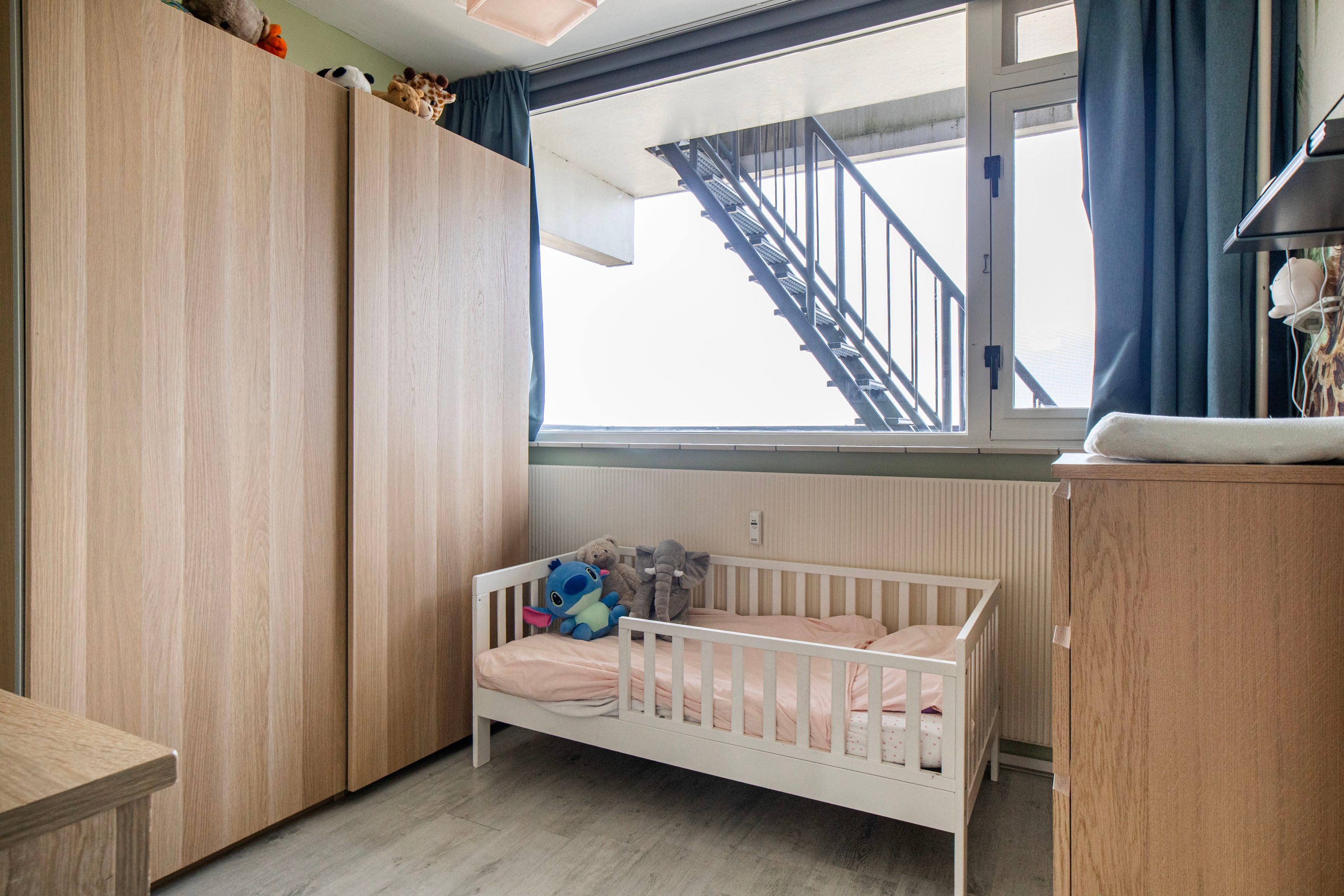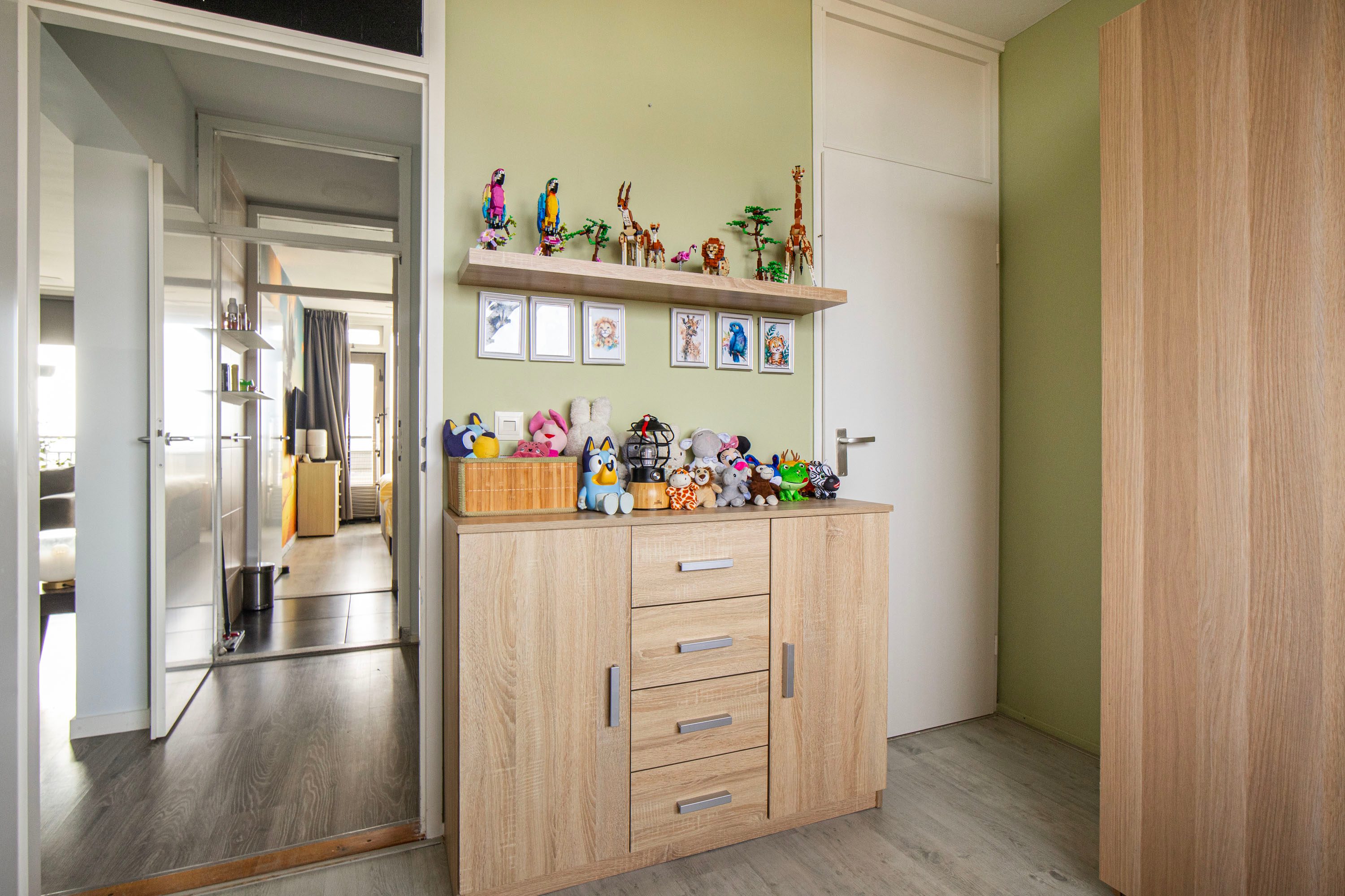 Via de hal bereik je de eerste slaapkamer aan de voorzijde van circa 8 m². Deze kamer is ideaal als slaapkamer of thuiswerkplek. Hier bevindt zich tevens een vaste kast met de wasmachineaansluiting.
