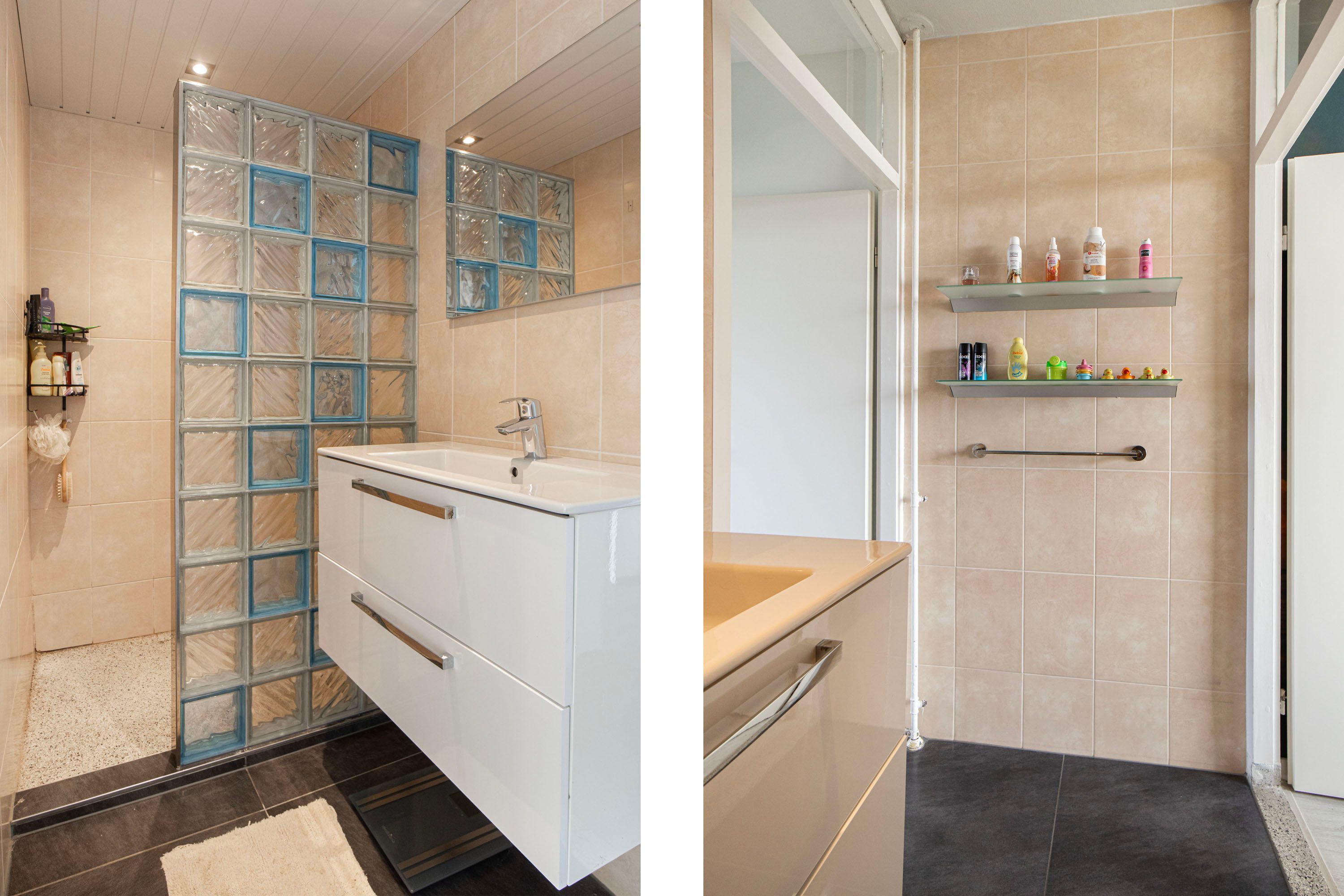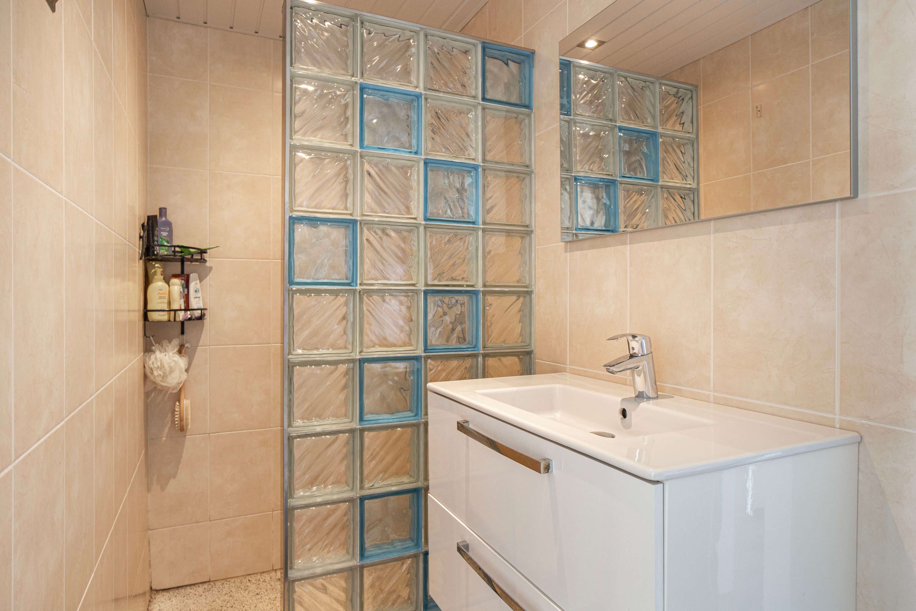 De badkamer (ca. 4 m²) is uitgerust met een inloopdouche en een wastafel met meubel. Het toilet is separaat.
