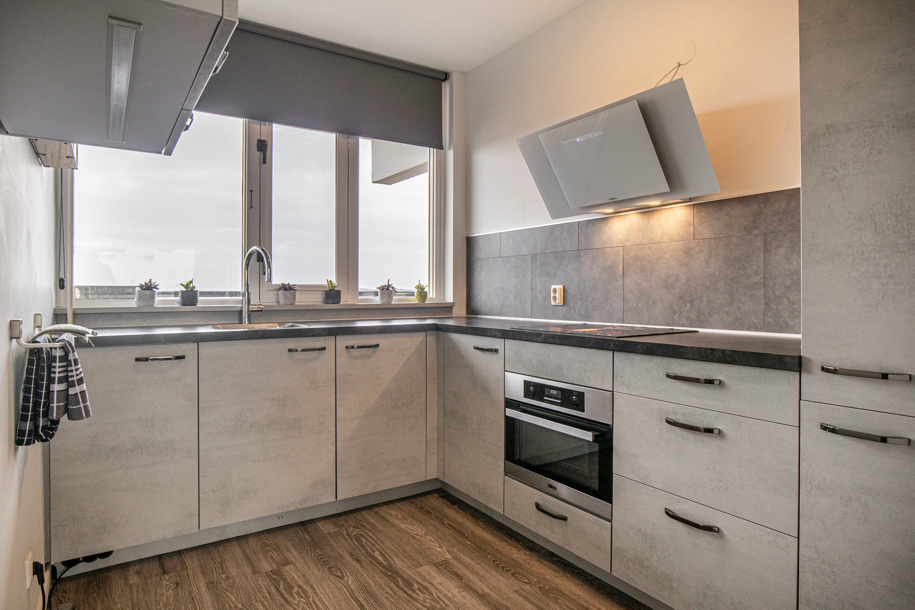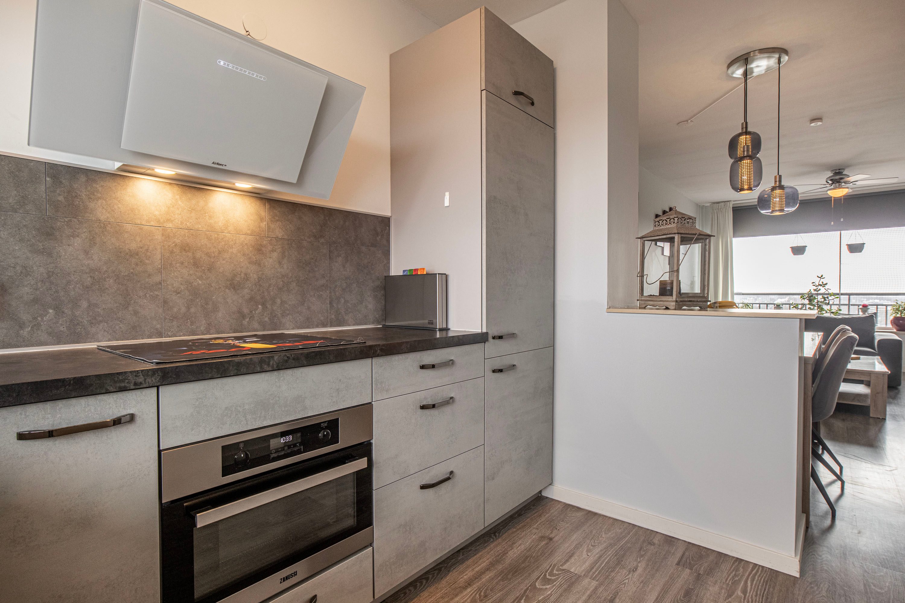 De moderne keuken is voorzien van diverse inbouwapparatuur, waaronder een inductiekookplaat, afzuigkap, combi-oven en een koel-vriescombinatie.