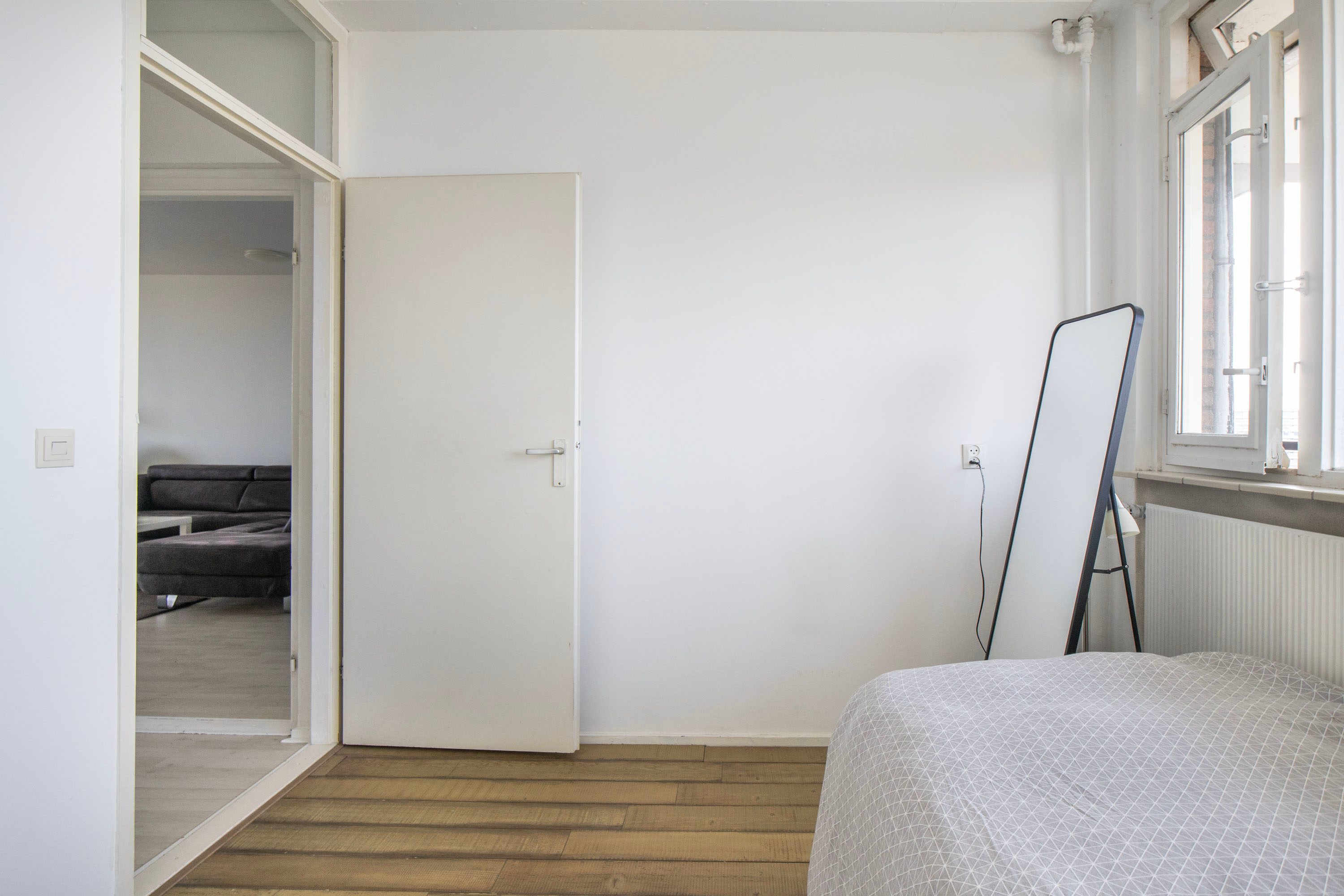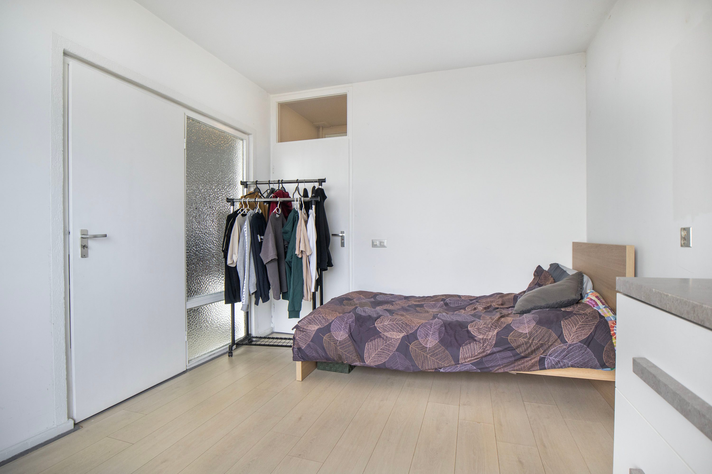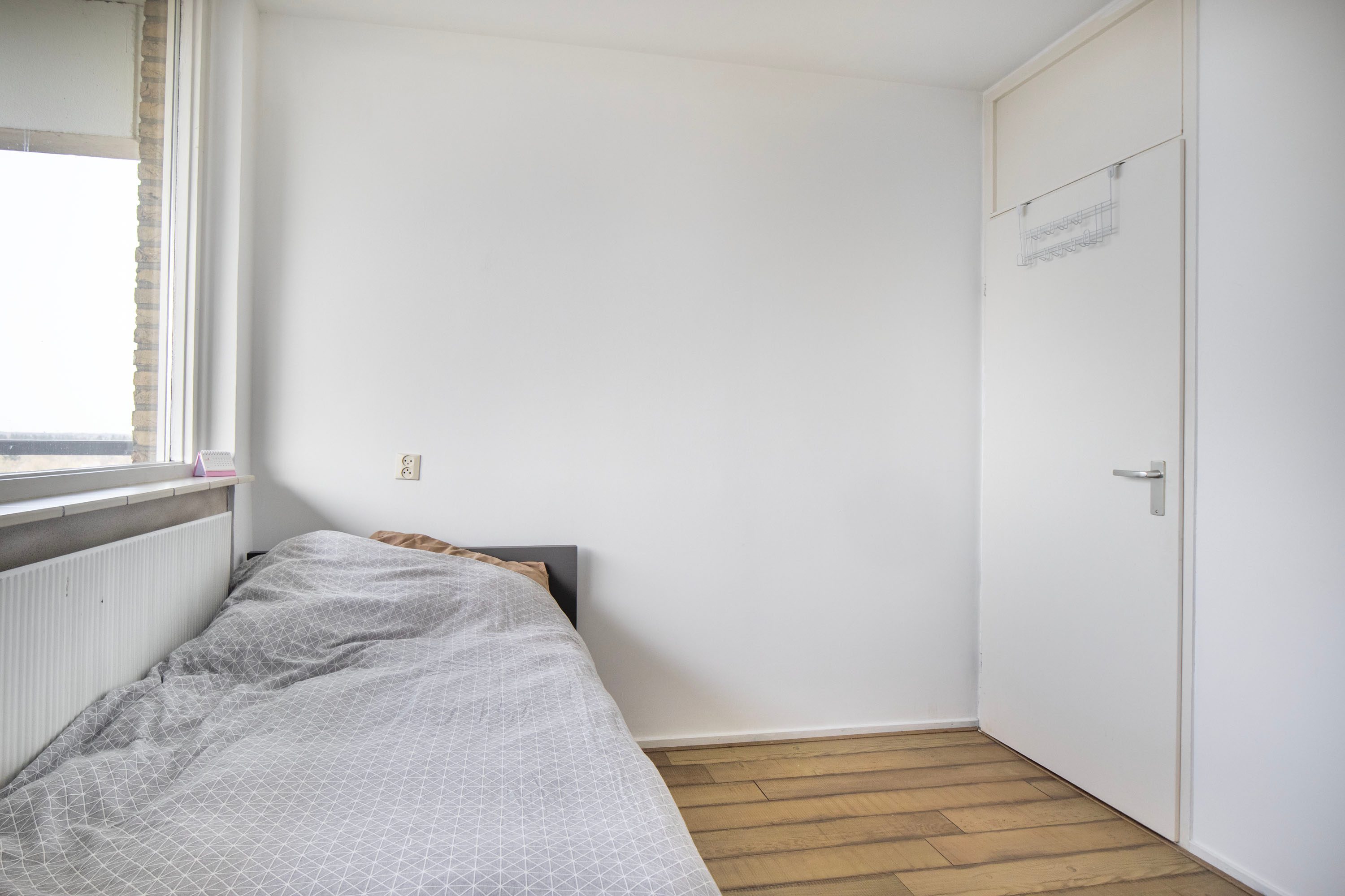 Via de woonkamer bereik je de grootste slaapkamer van circa 12 m². Deze bevindt zich aan de achterzijde van de woning, waardoor de kamer rustig is gelegen. De slaapkamer beschikt over twee deuren: één naar de woonkamer en één naar de badkamer. Daarnaast heb je vanuit deze kamer eveneens toegang tot het balkon.