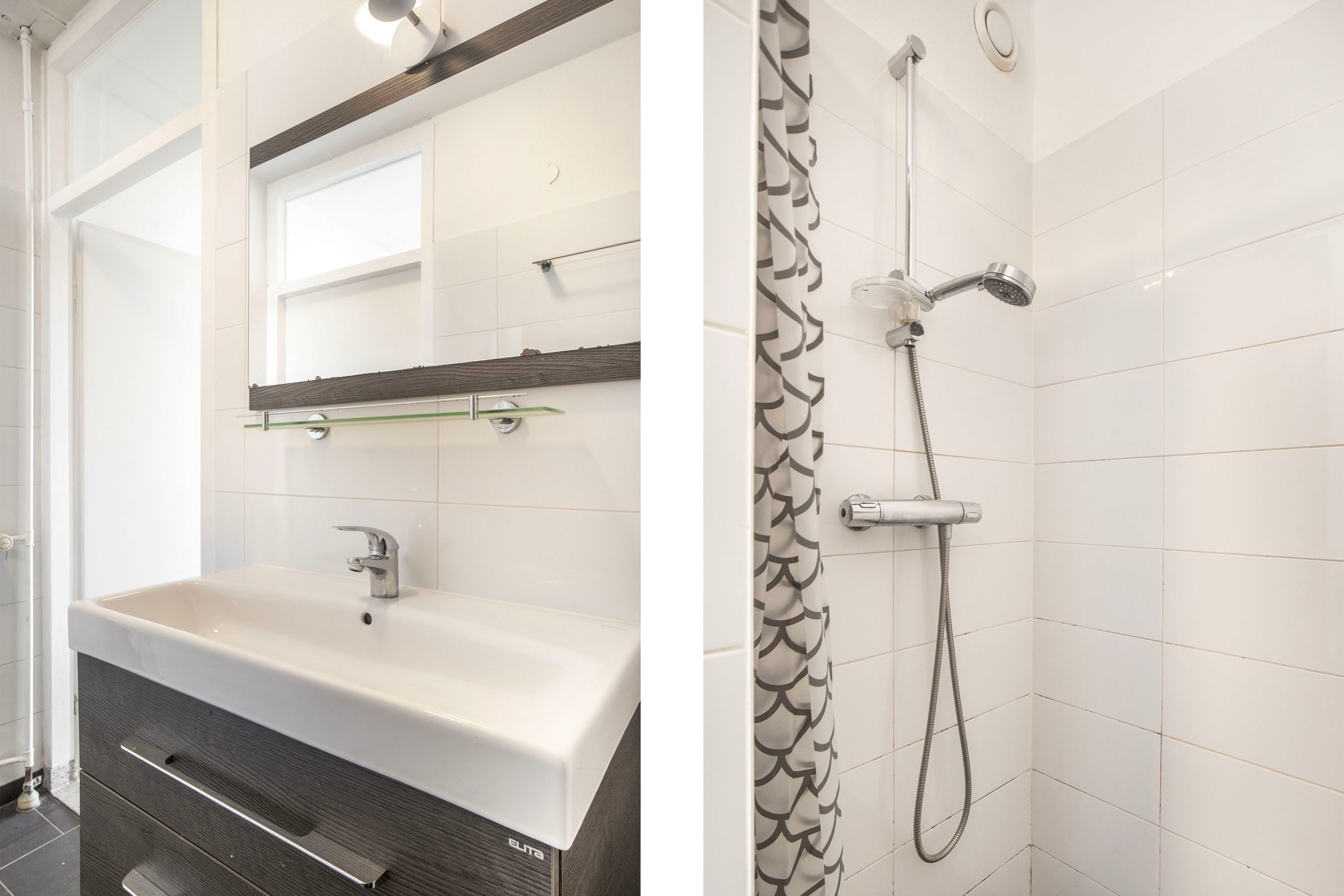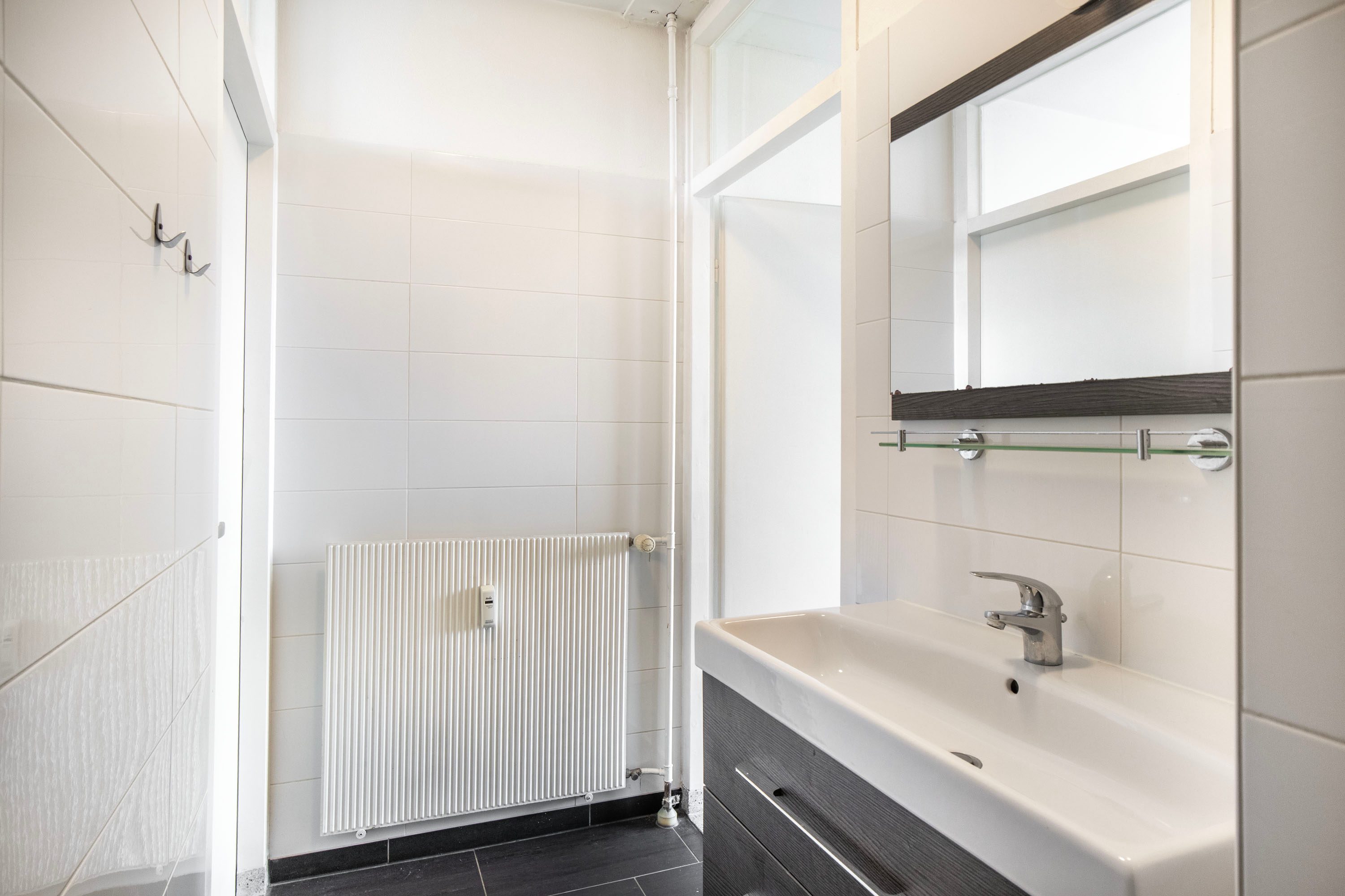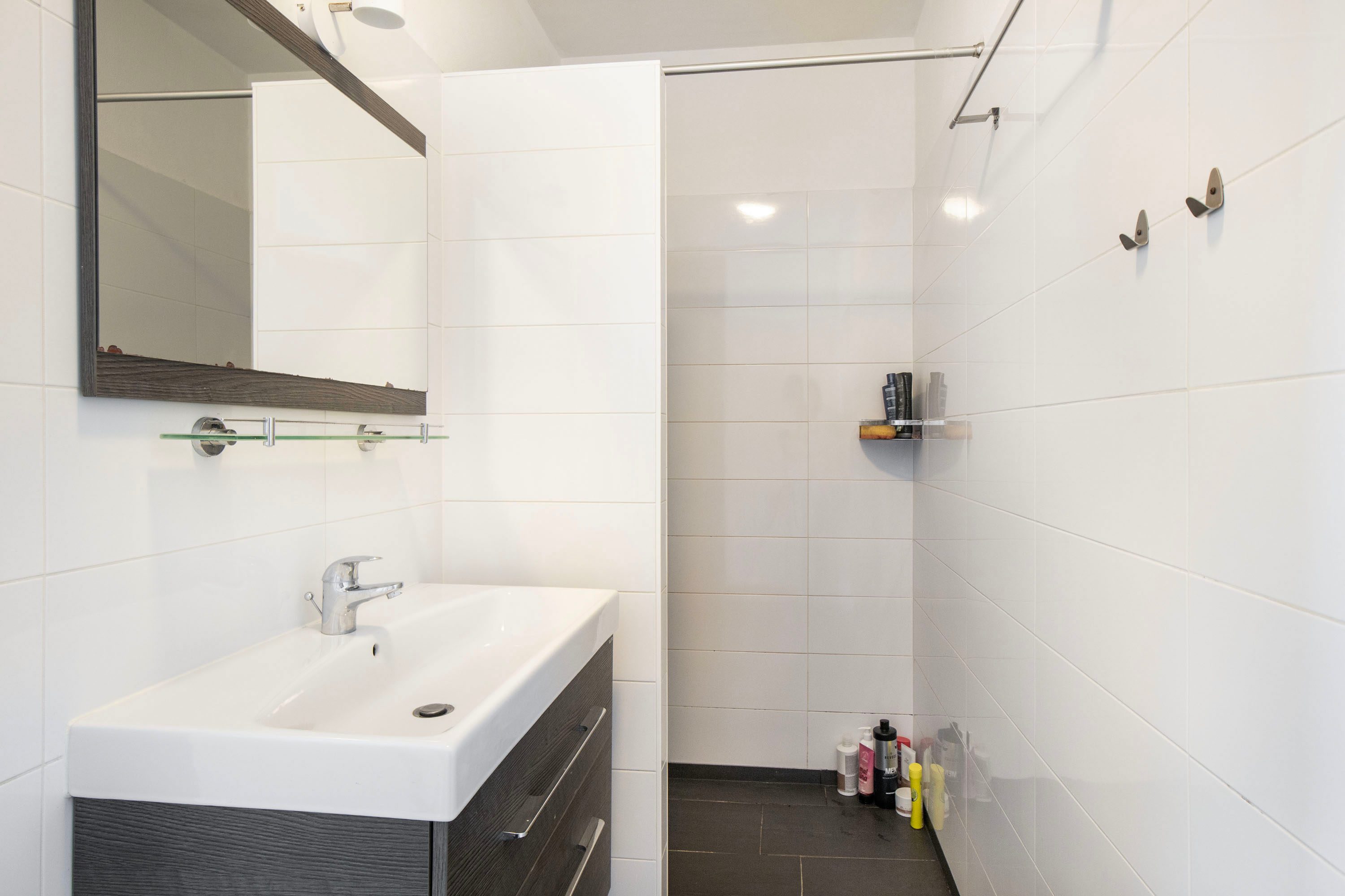 De badkamer is circa 4 m² groot en voorzien van een inloopdouche en een wastafel met meubel. De ruimte is volledig betegeld, wat zorgt voor een nette uitstraling en eenvoudig onderhoud.