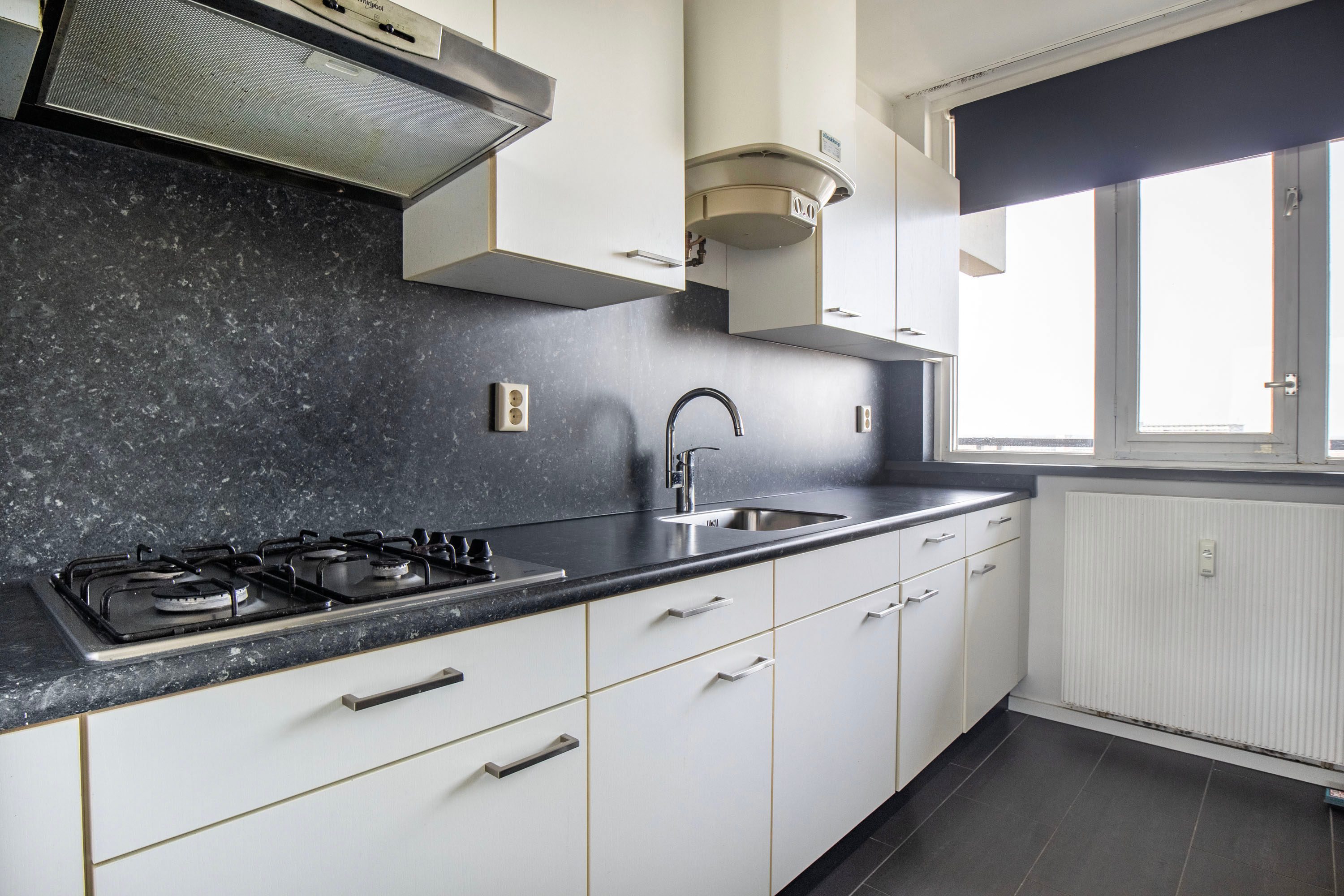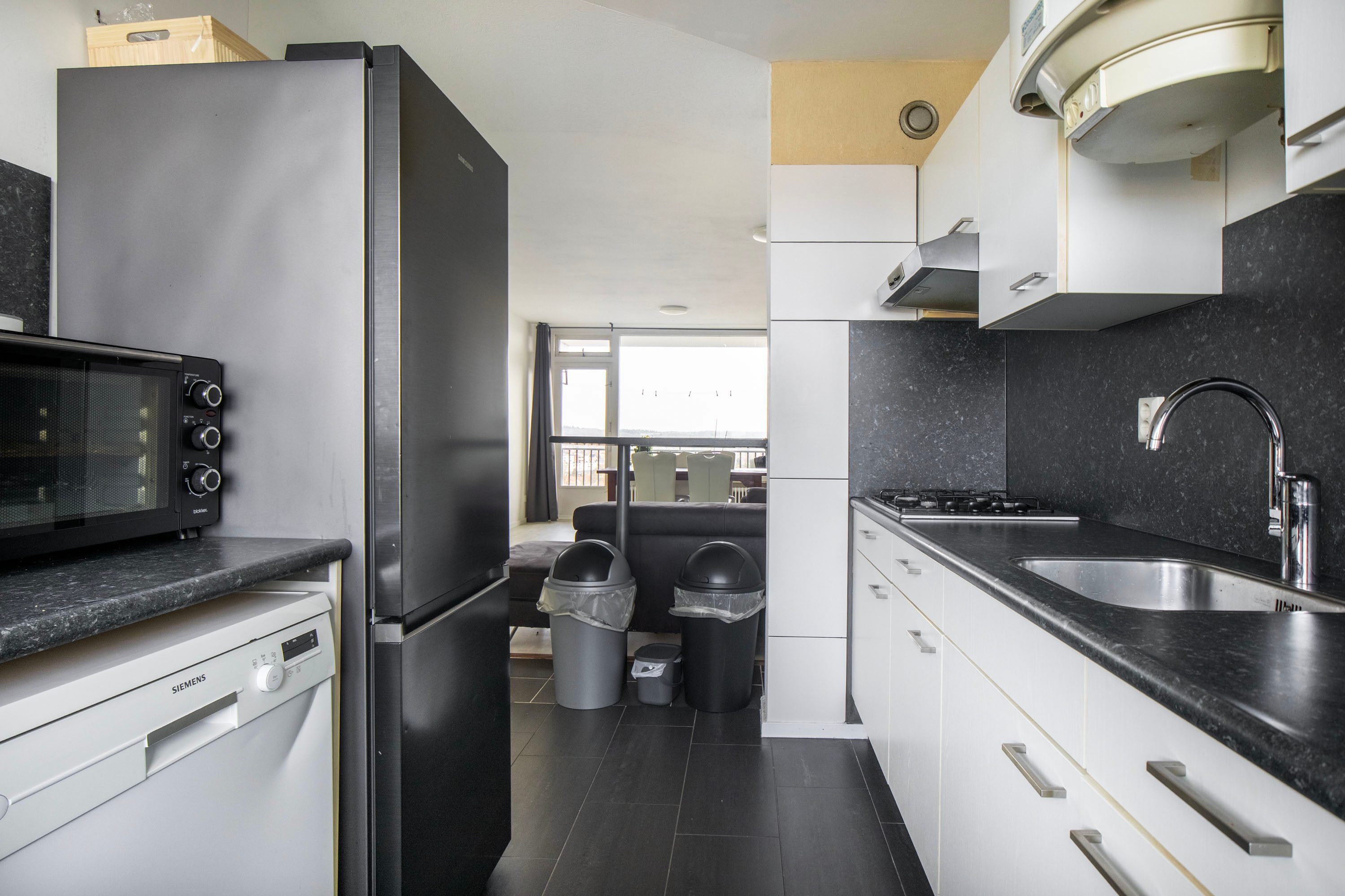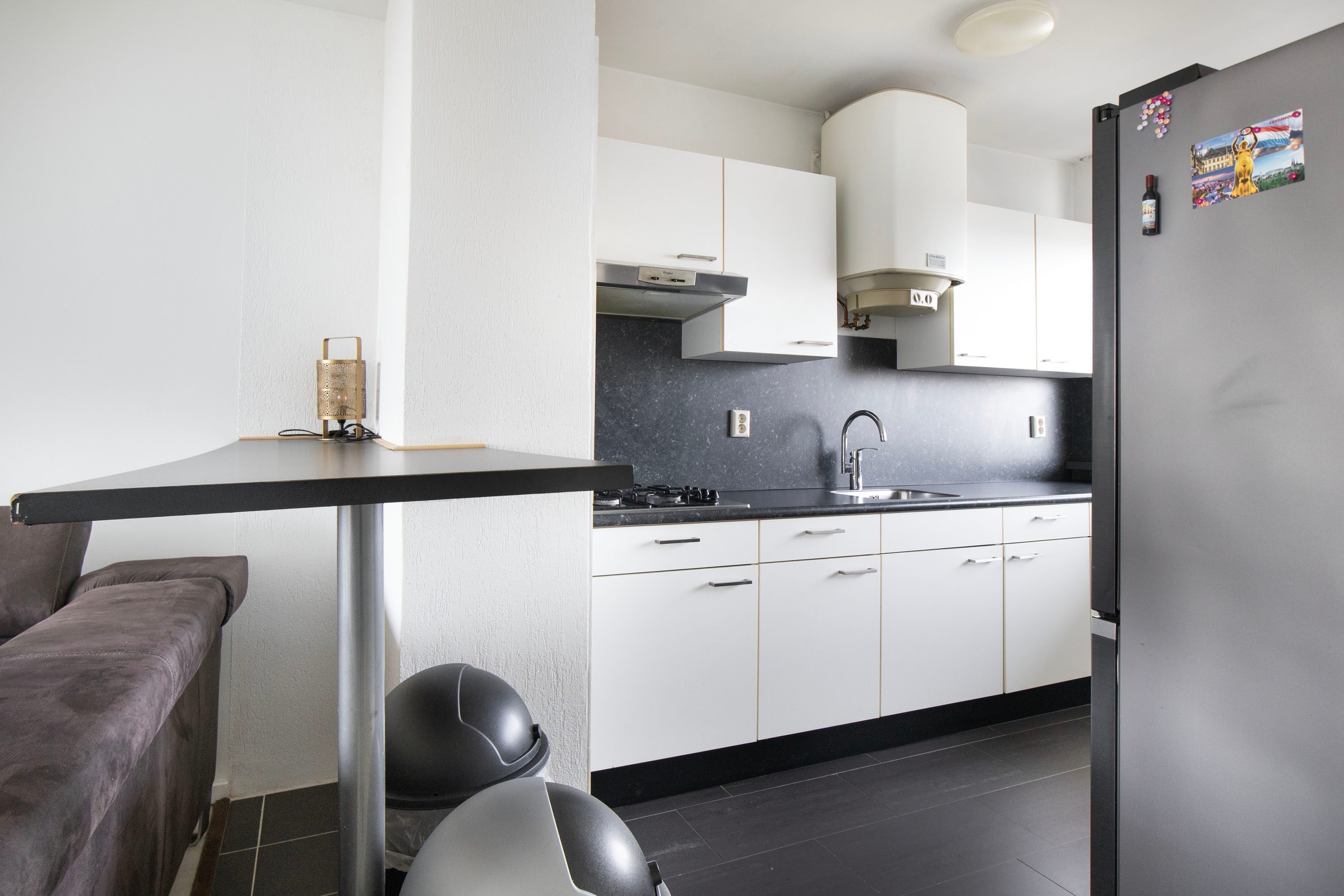 De keuken bevindt zich aan de voorzijde van de woning en is praktisch opgesteld in een hoekopstelling. De keuken staat in open verbinding met de woonkamer, wat zorgt voor een prettige sfeer. Er is volop kastruimte aanwezig, ideaal voor het opbergen van keukenspullen. De keuken is uitgerust met een gasfornuis, afzuigkap, oven en een aansluiting voor de wasmachine. De koel-vriescombinatie, vaatwasser en wasmachine kunnen eventueel worden overgenomen. Dankzij werkbladen aan beide zijden is er bovendien een fijne en ruime werkplek om te koken.