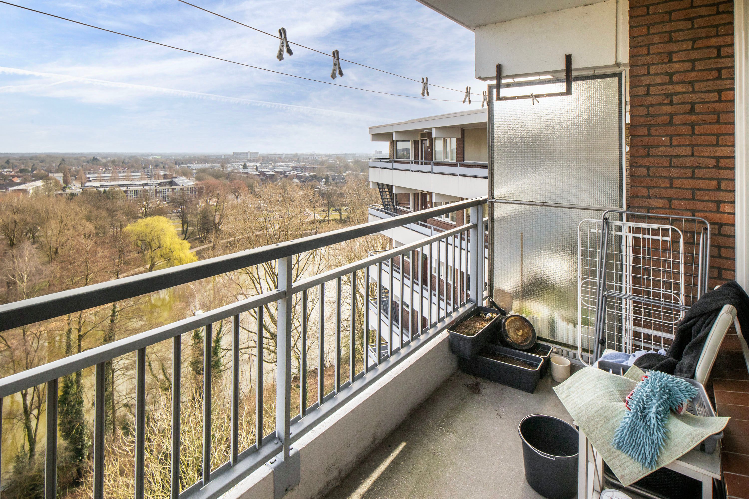 Vanuit de woonkamer heb je via de balkondeur toegang tot het balkon. Het balkon van circa 9 m² strekt zich uit over de volledige breedte van de woning en biedt een prachtig uitzicht over een deel van het Victoria Vesta Park en een groot deel van Ede. Door de ligging op hoogte kijk je hier heerlijk vrij weg en geniet je, mede dankzij de hoekligging, van veel privacy.