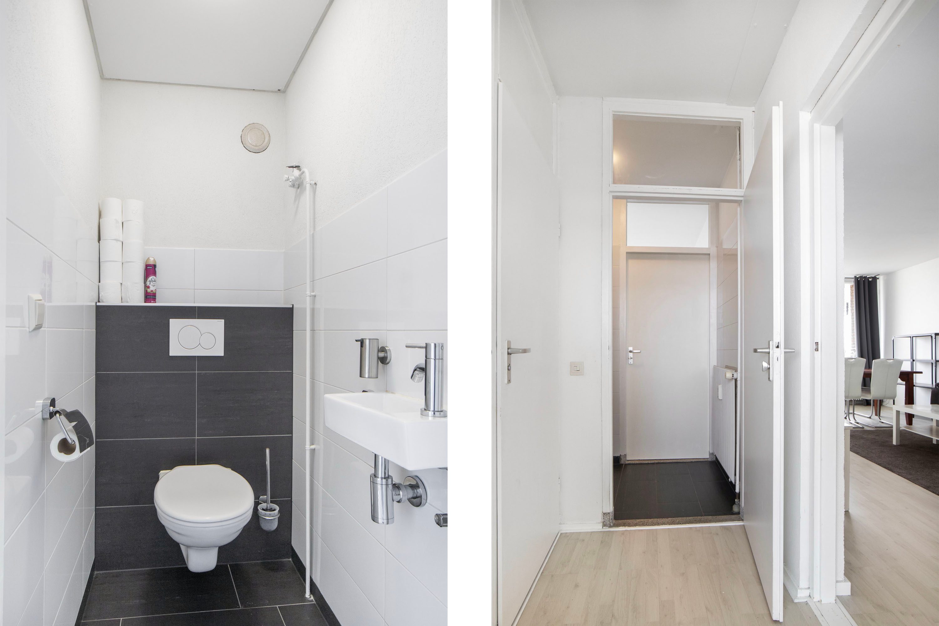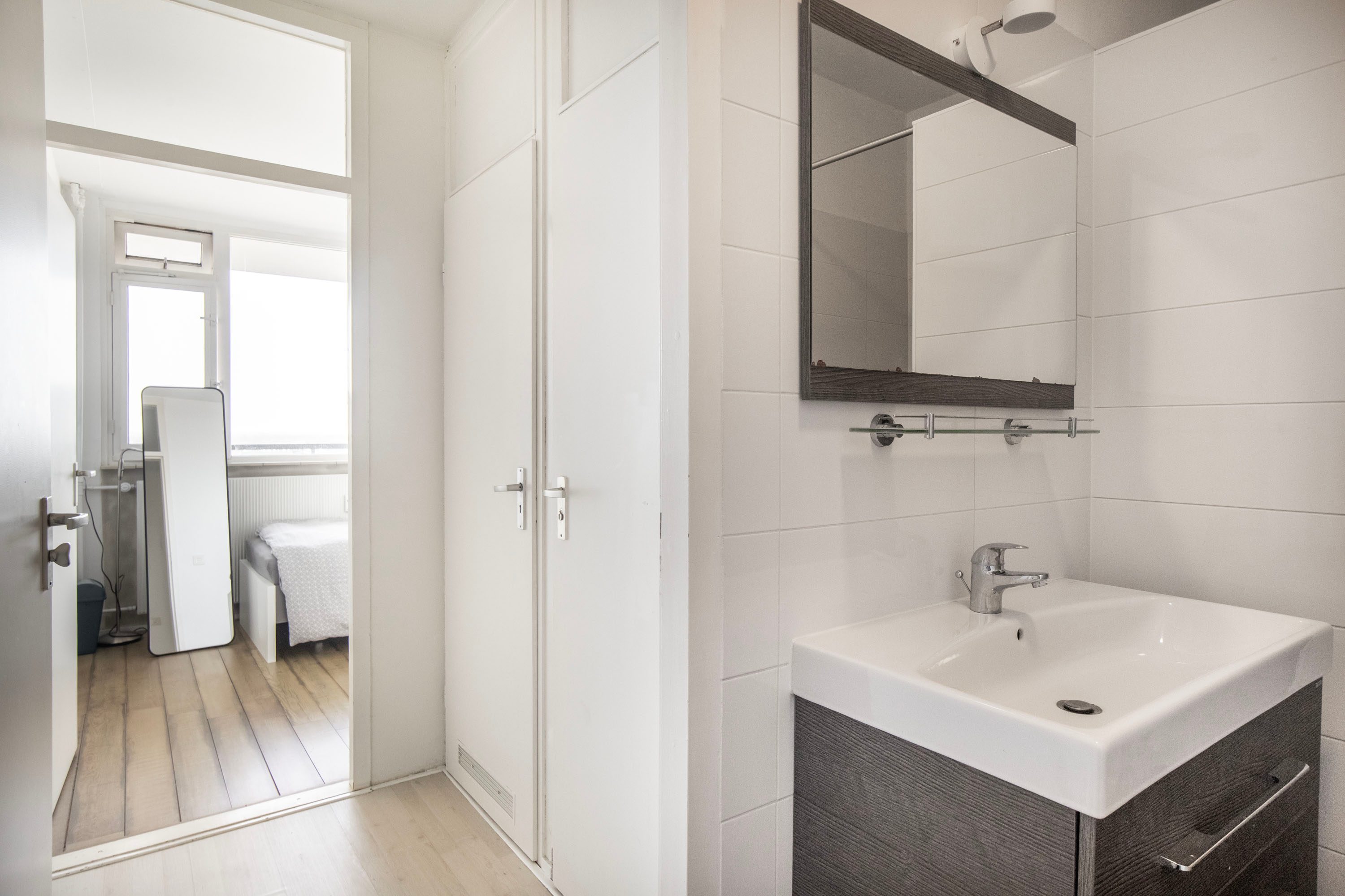 Terug in de woonkamer bereik je via een hal het separate toilet, een praktische kastruimte en de toegang tot de tweede slaapkamer en de badkamer. De tweede slaapkamer van circa 8 m² ligt aan de voorzijde van de woning. Ook deze kamer is rustig gelegen dankzij de hoekpositie van het appartement, waardoor er geen voorbijgangers langs de woning lopen. De kamer beschikt bovendien over een handige inbouwkast.