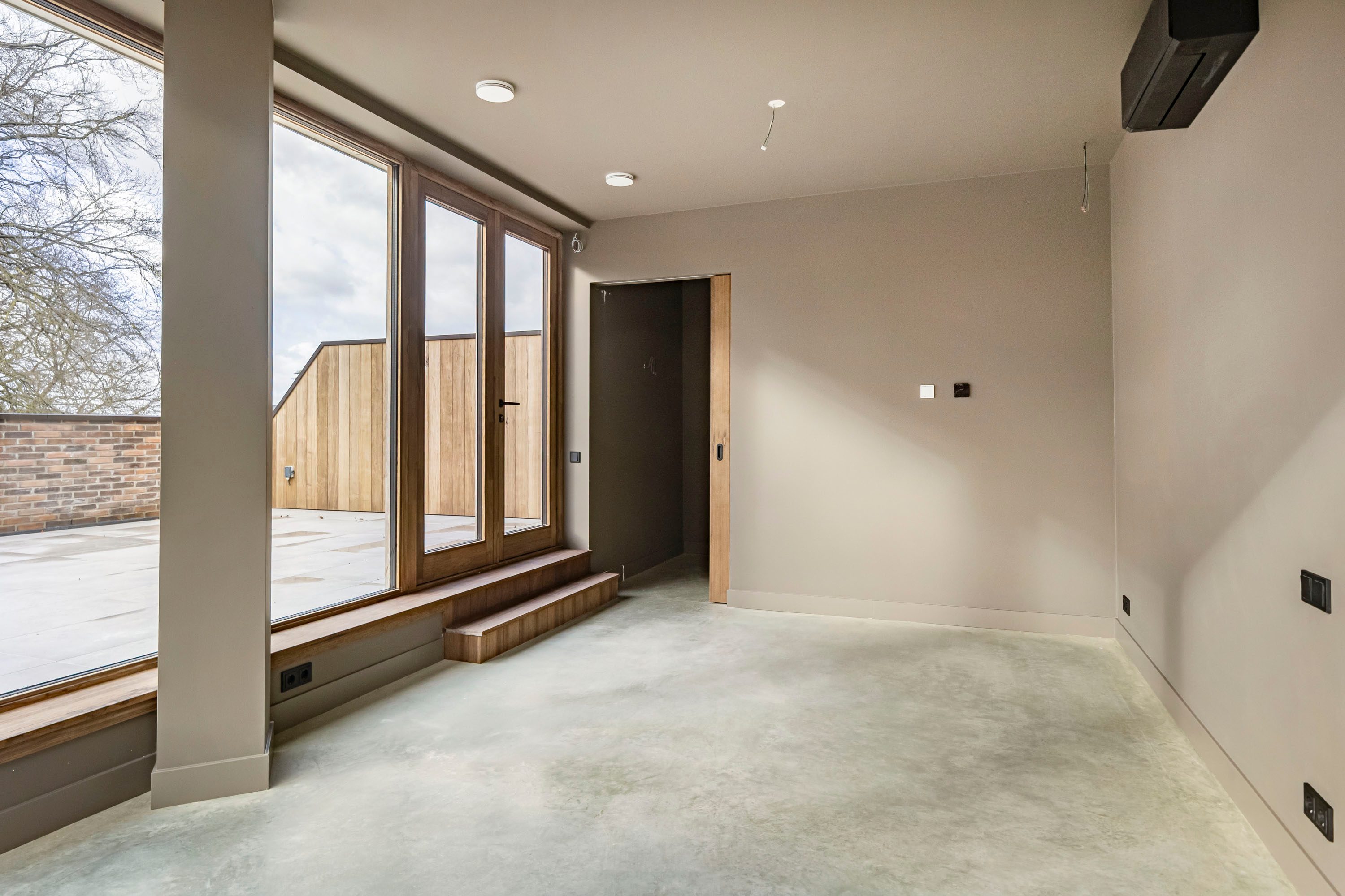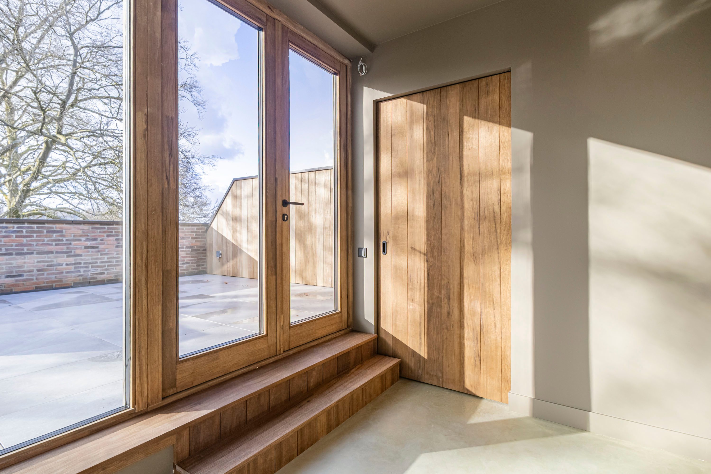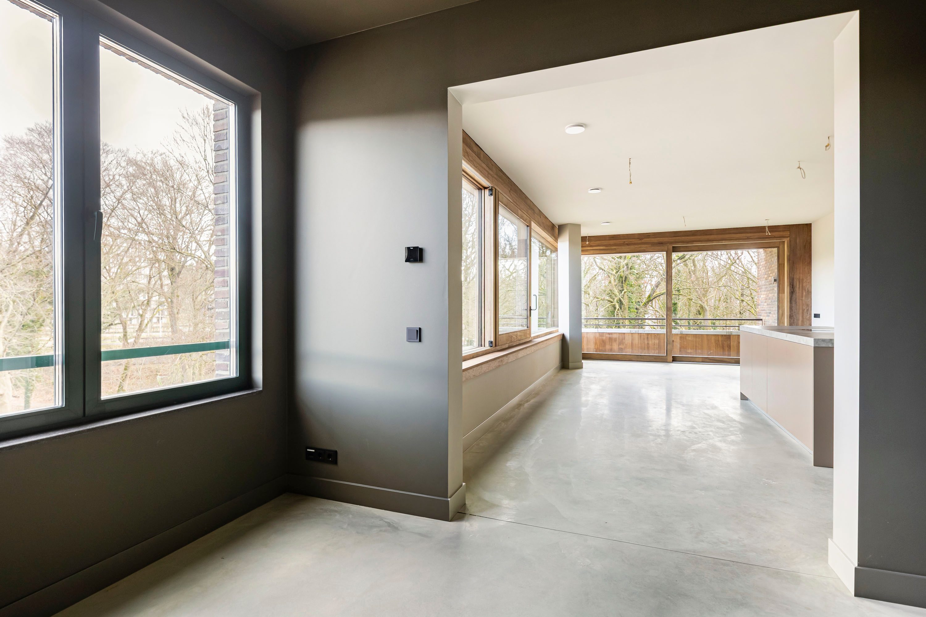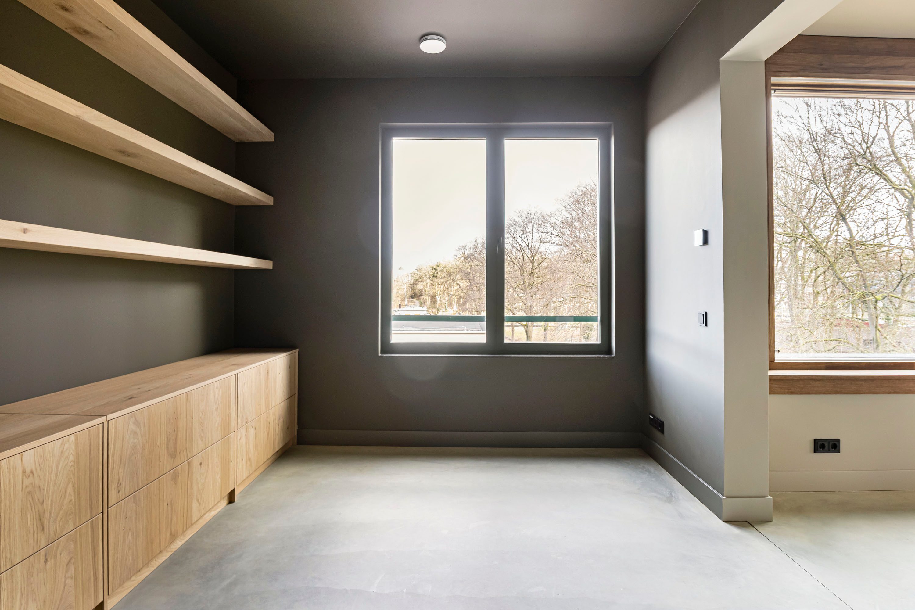 De vloer is afgewerkt middels een gevlinderde betonvloer, de kozijnen zijn van Fraké hout en voorzien van HR+++ beglazing.