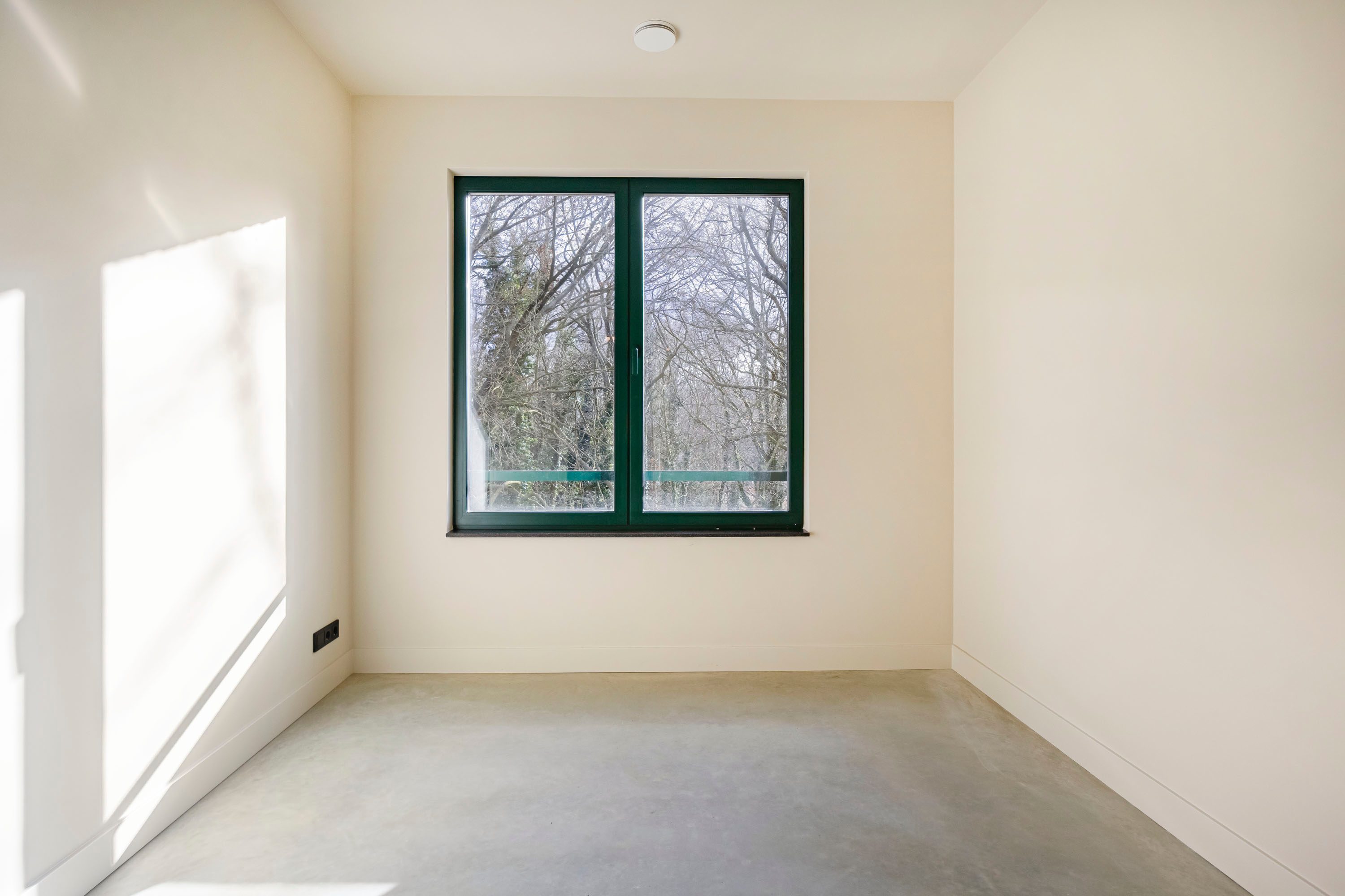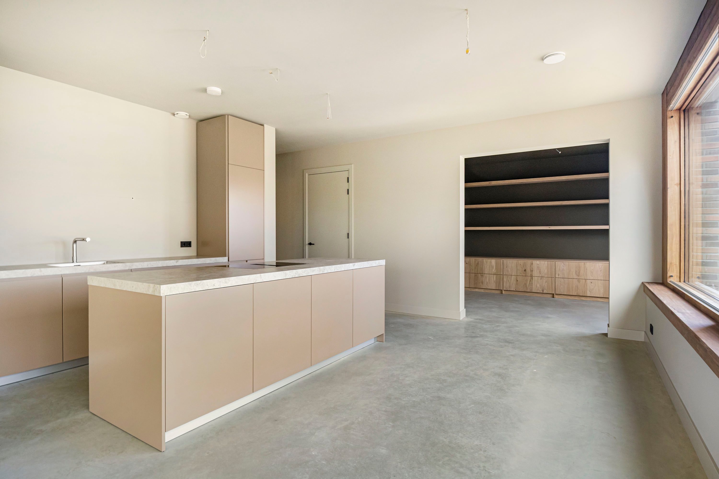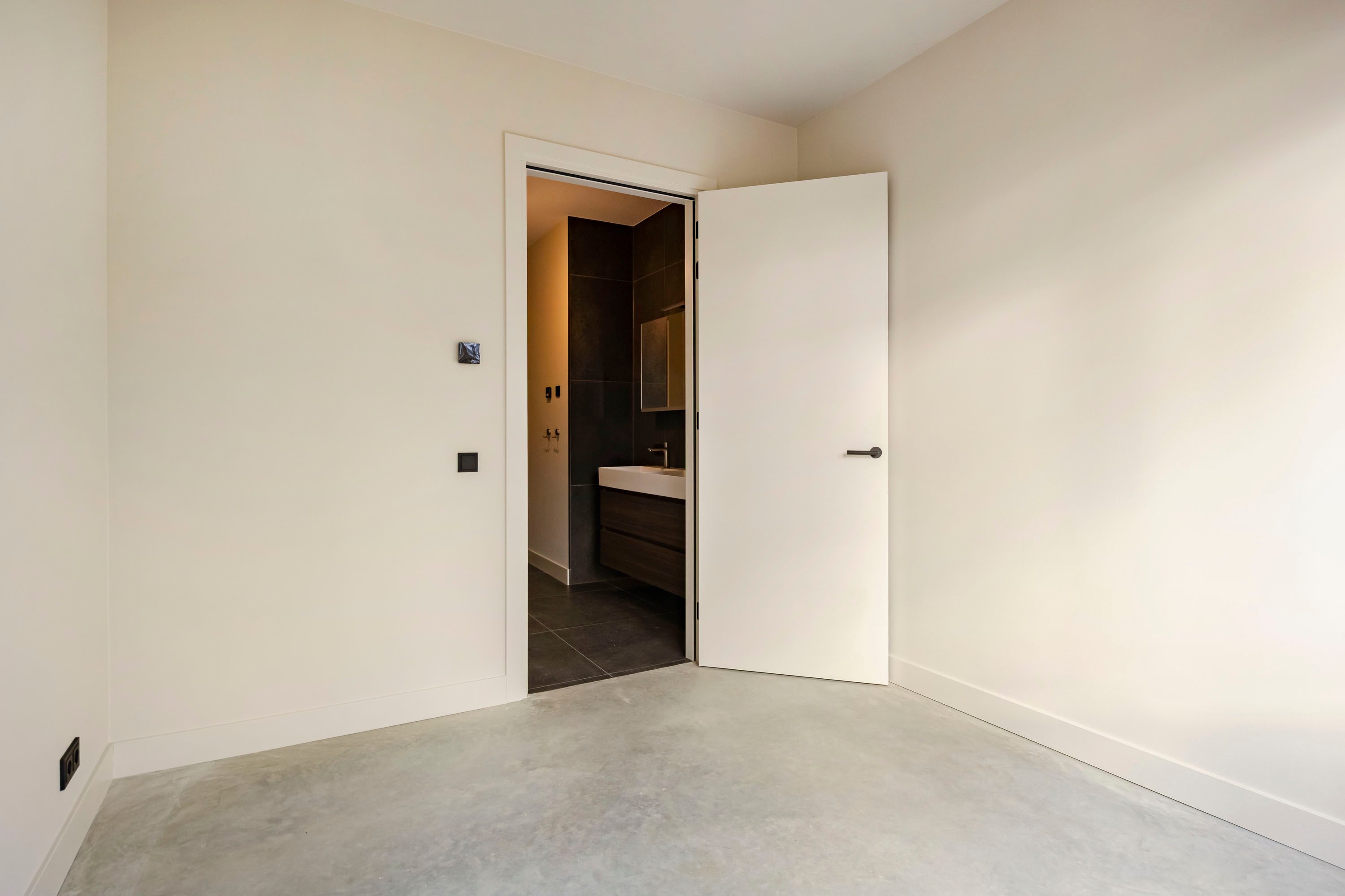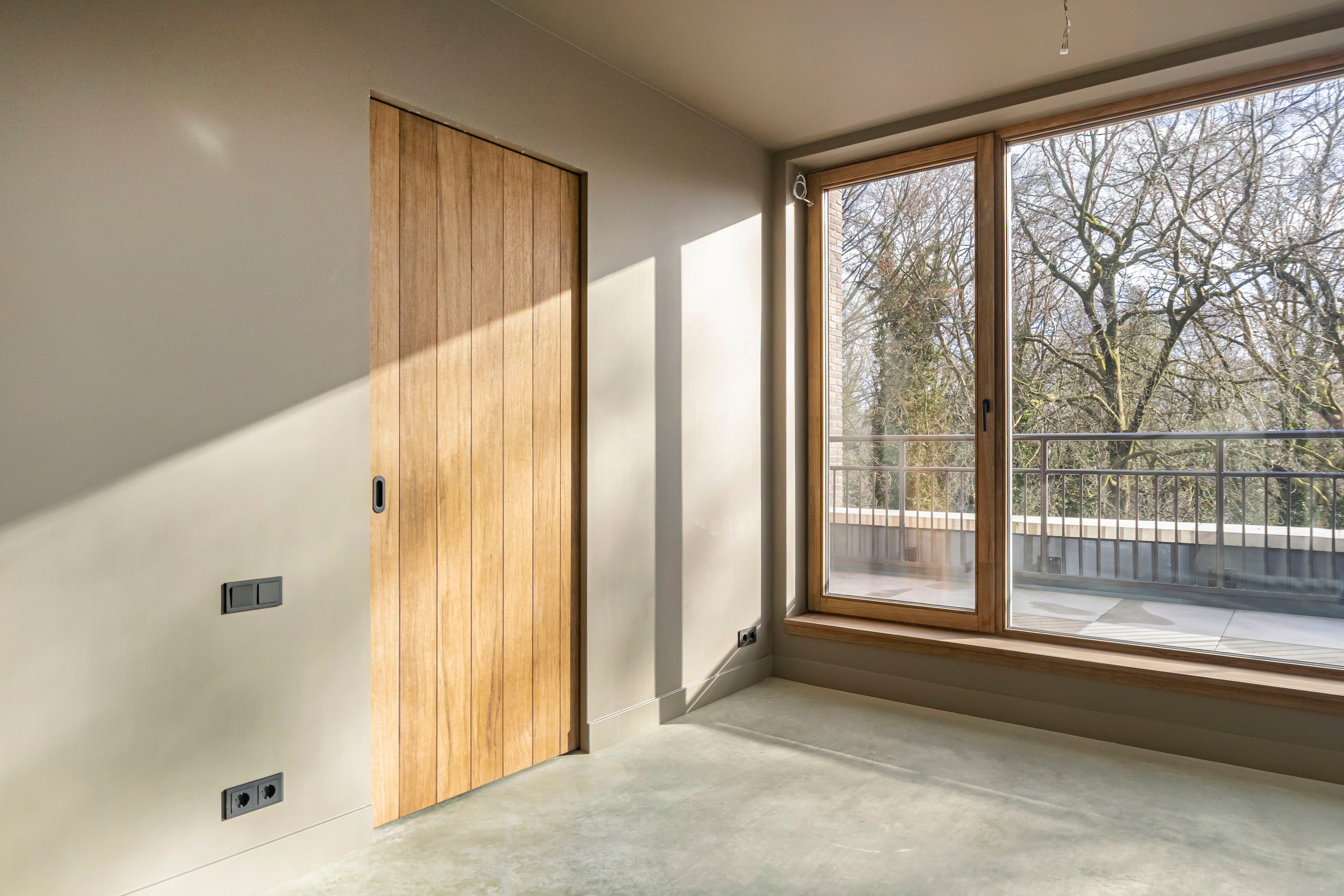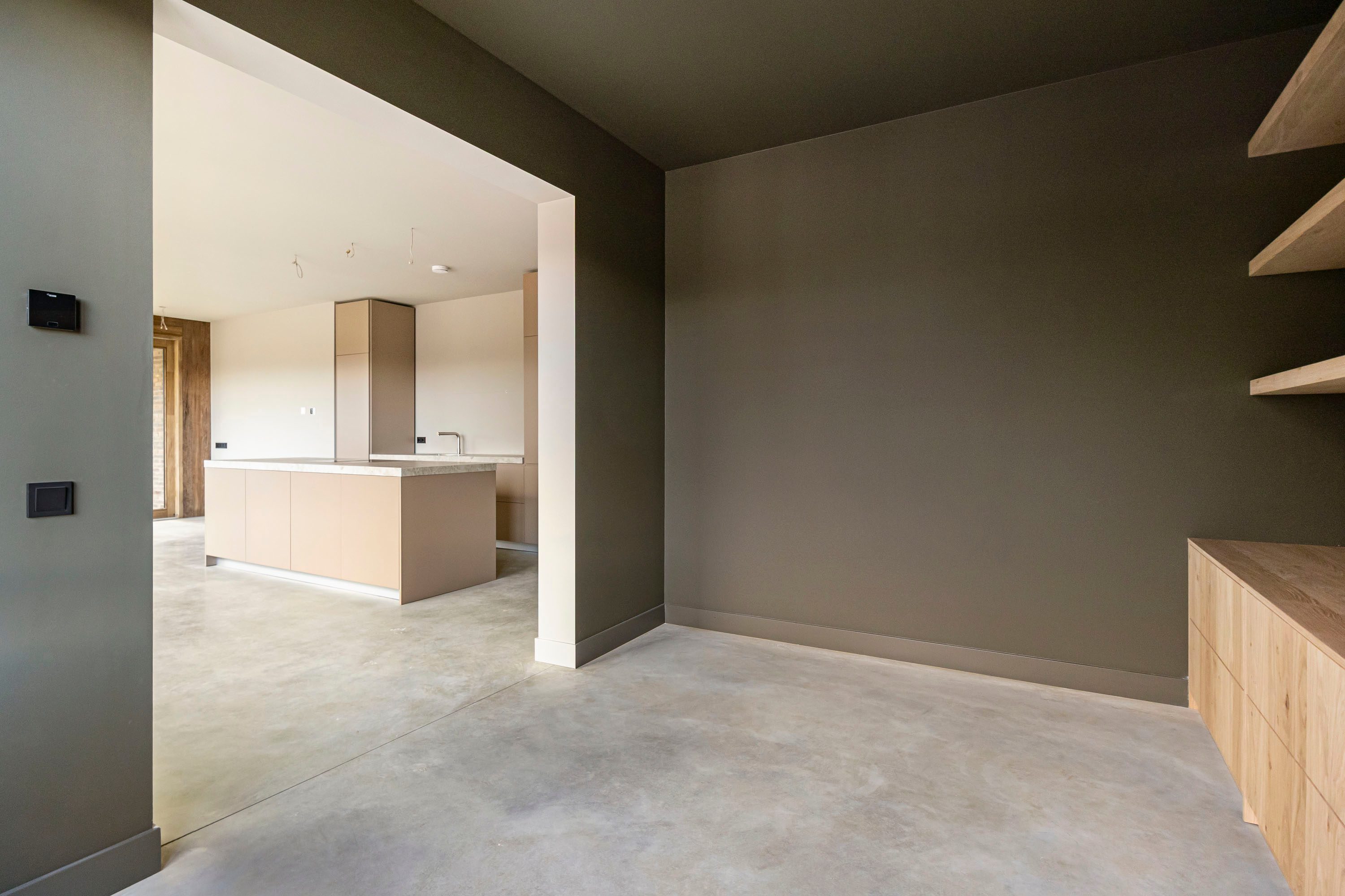 De vloer is afgewerkt middels een gevlinderde betonvloer, de kozijnen zijn van Fraké hout en voorzien van HR+++ beglazing.