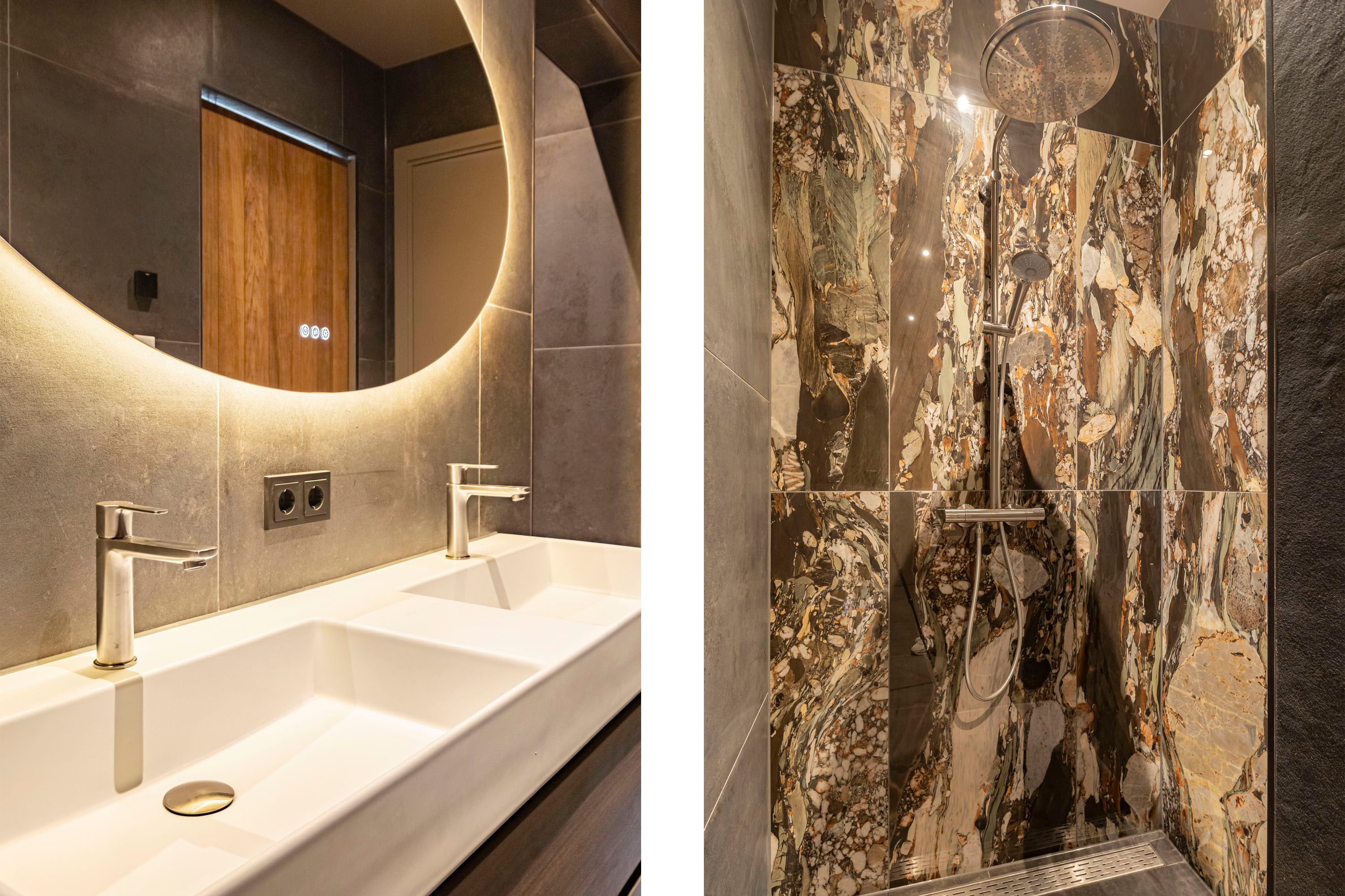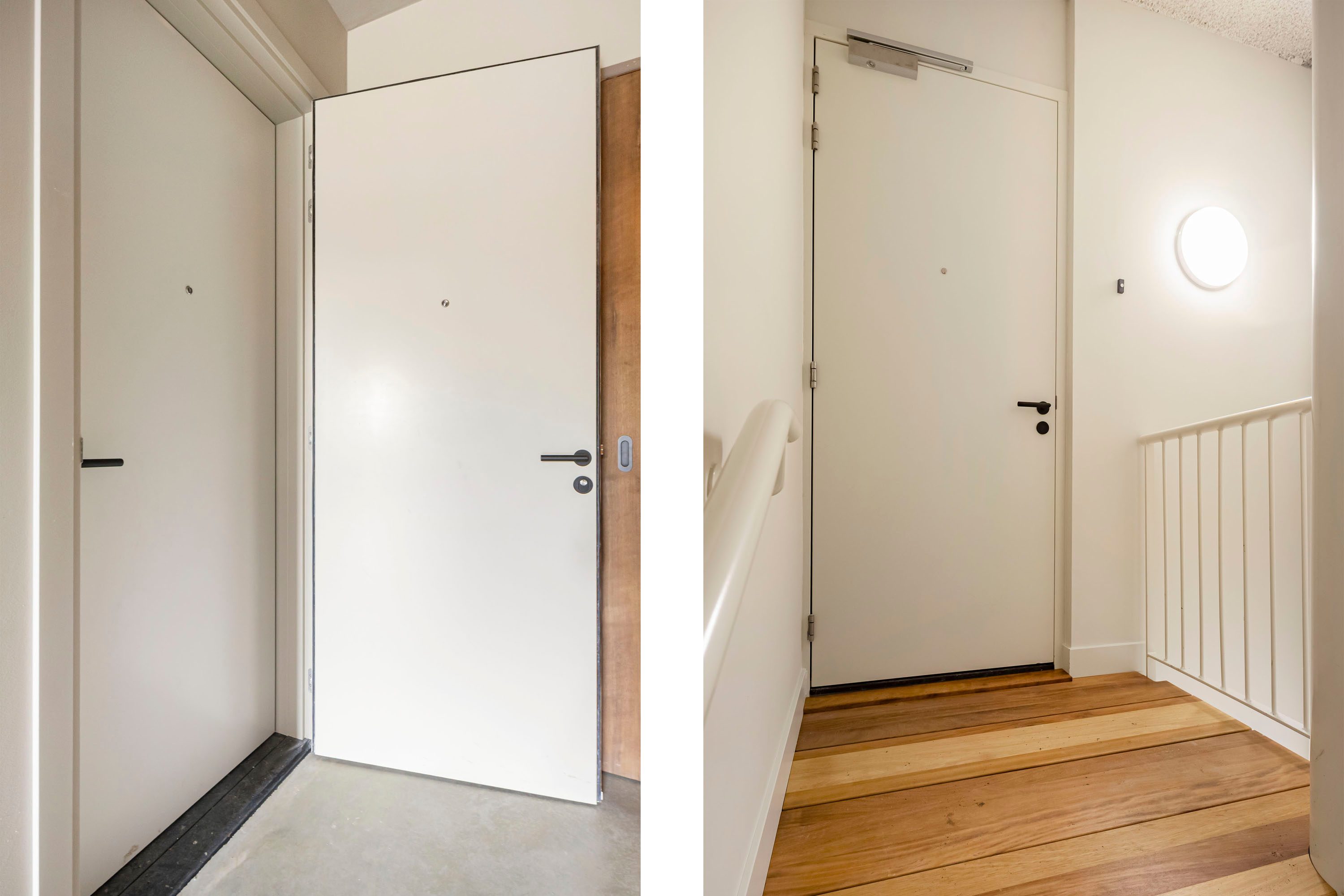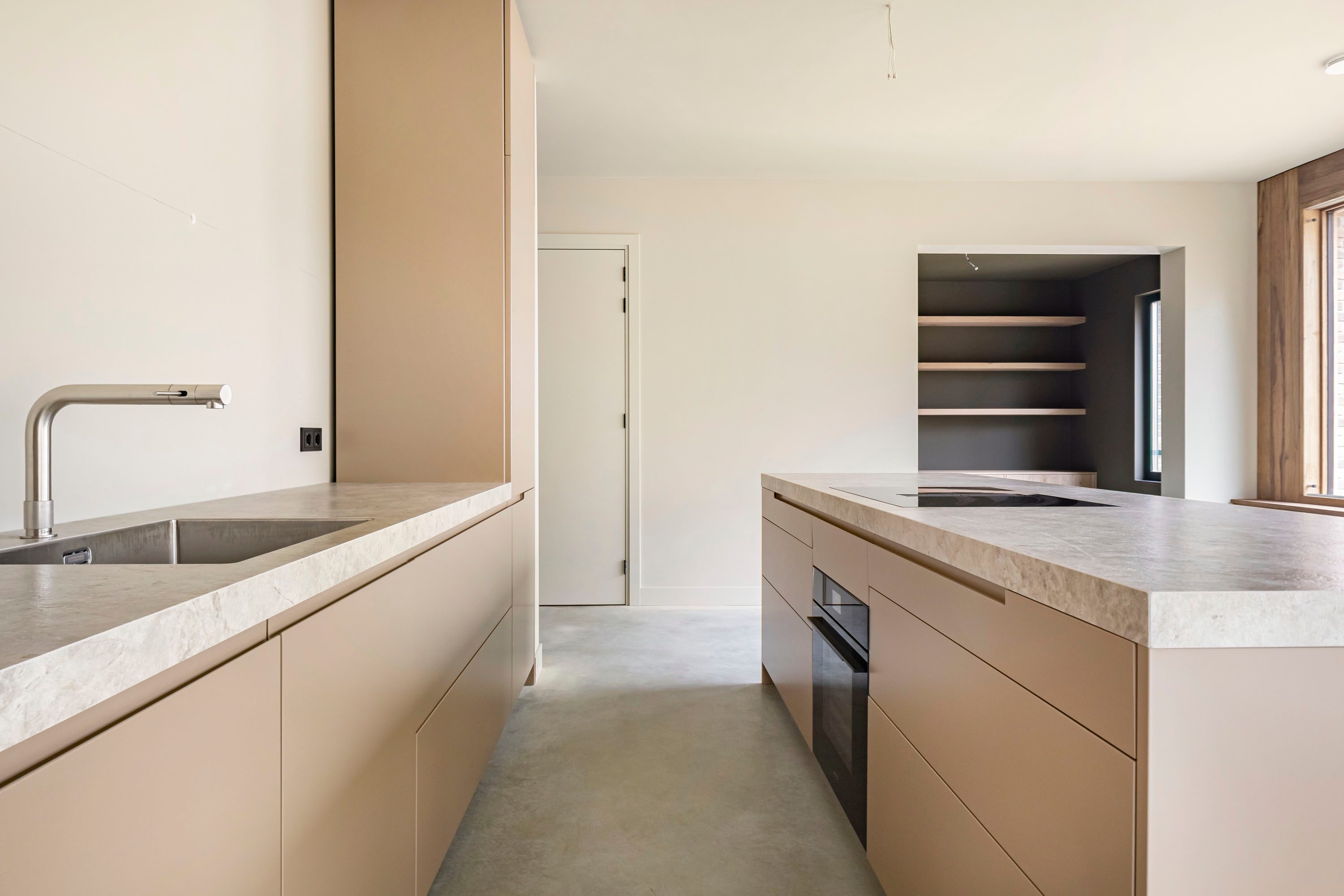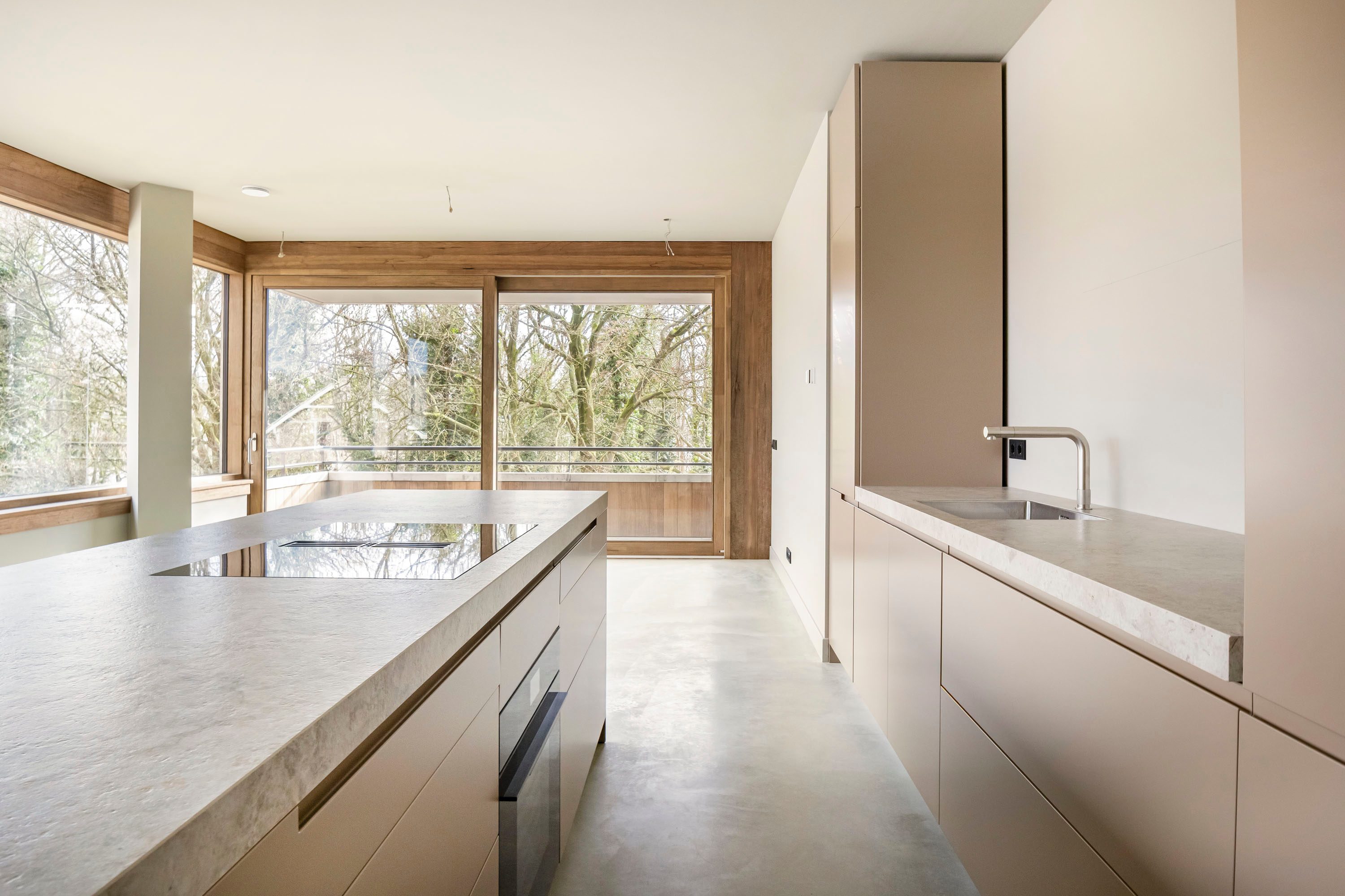 De vloer is afgewerkt middels een gevlinderde betonvloer, de kozijnen zijn van Fraké hout en voorzien van HR+++ beglazing.