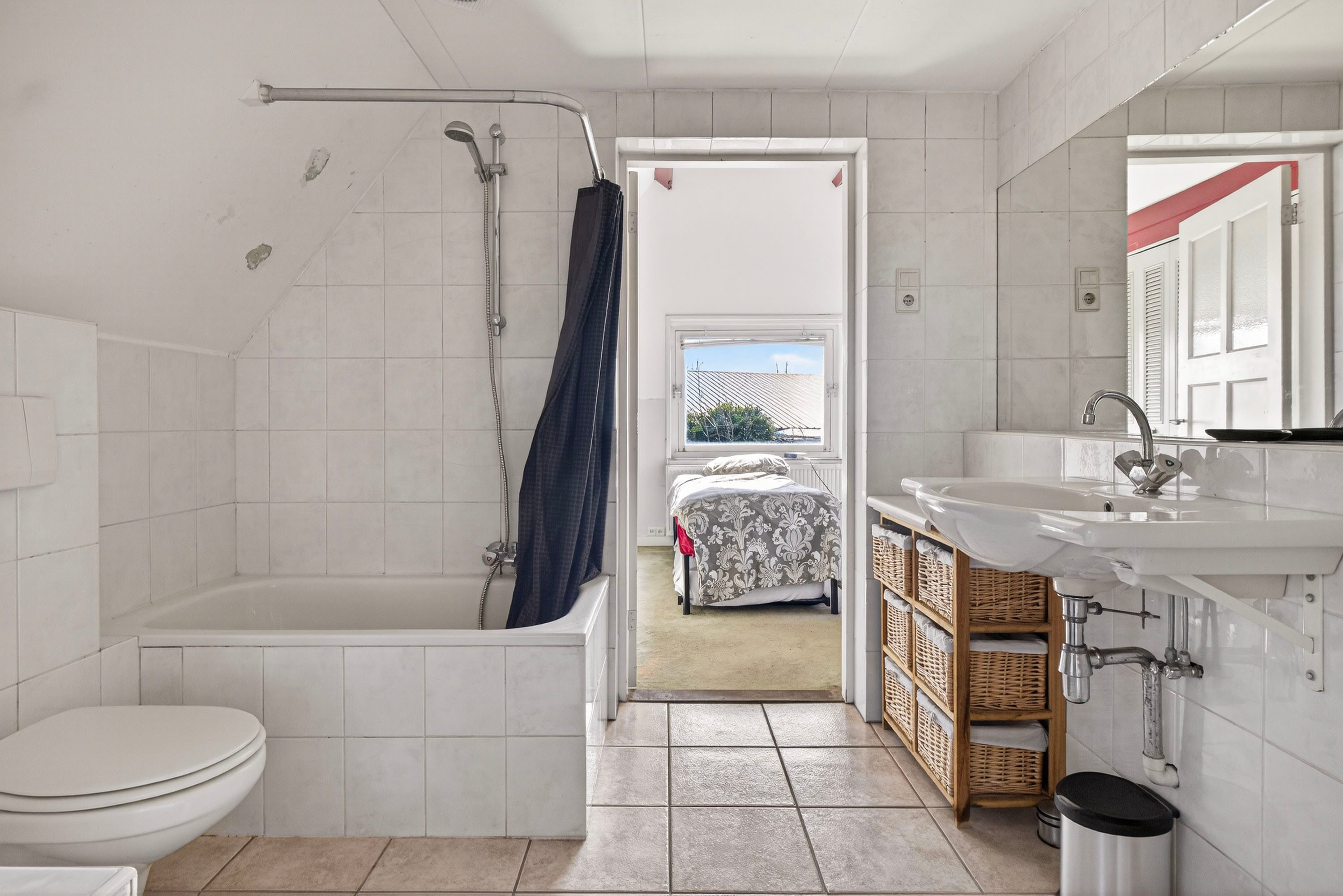 Hier bevindt zich eveneens een badkamer met douche en wastafelmeubel.