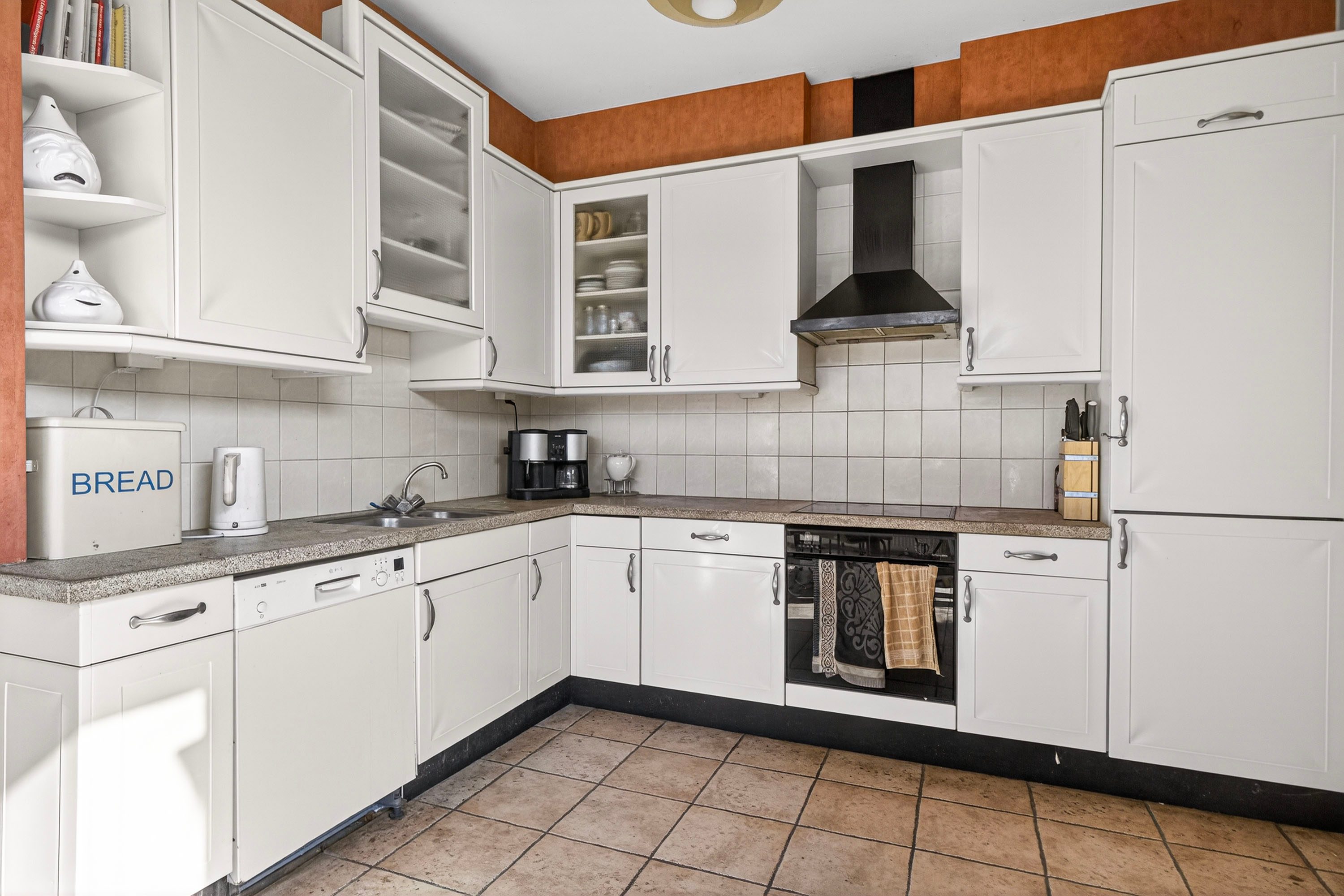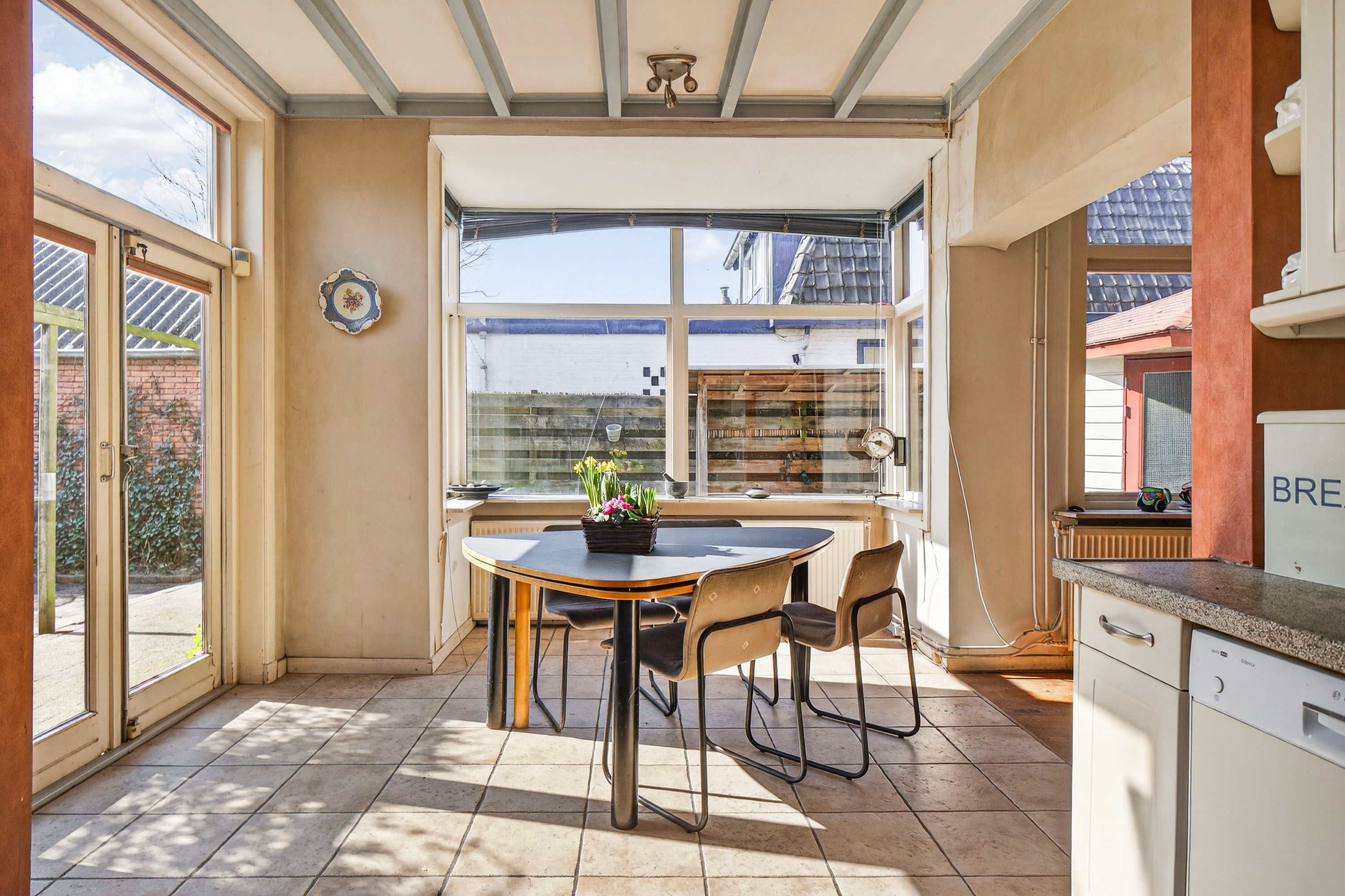 Aansluitend vind je de gezellige woonkeuken, waar je heerlijk kunt tafelen en direct contact hebt met degene die kookt. Via de openslaande deuren stap je zo de tuin in. De keuken is opgesteld in een L-vorm en voorzien van diverse inbouwapparatuur.