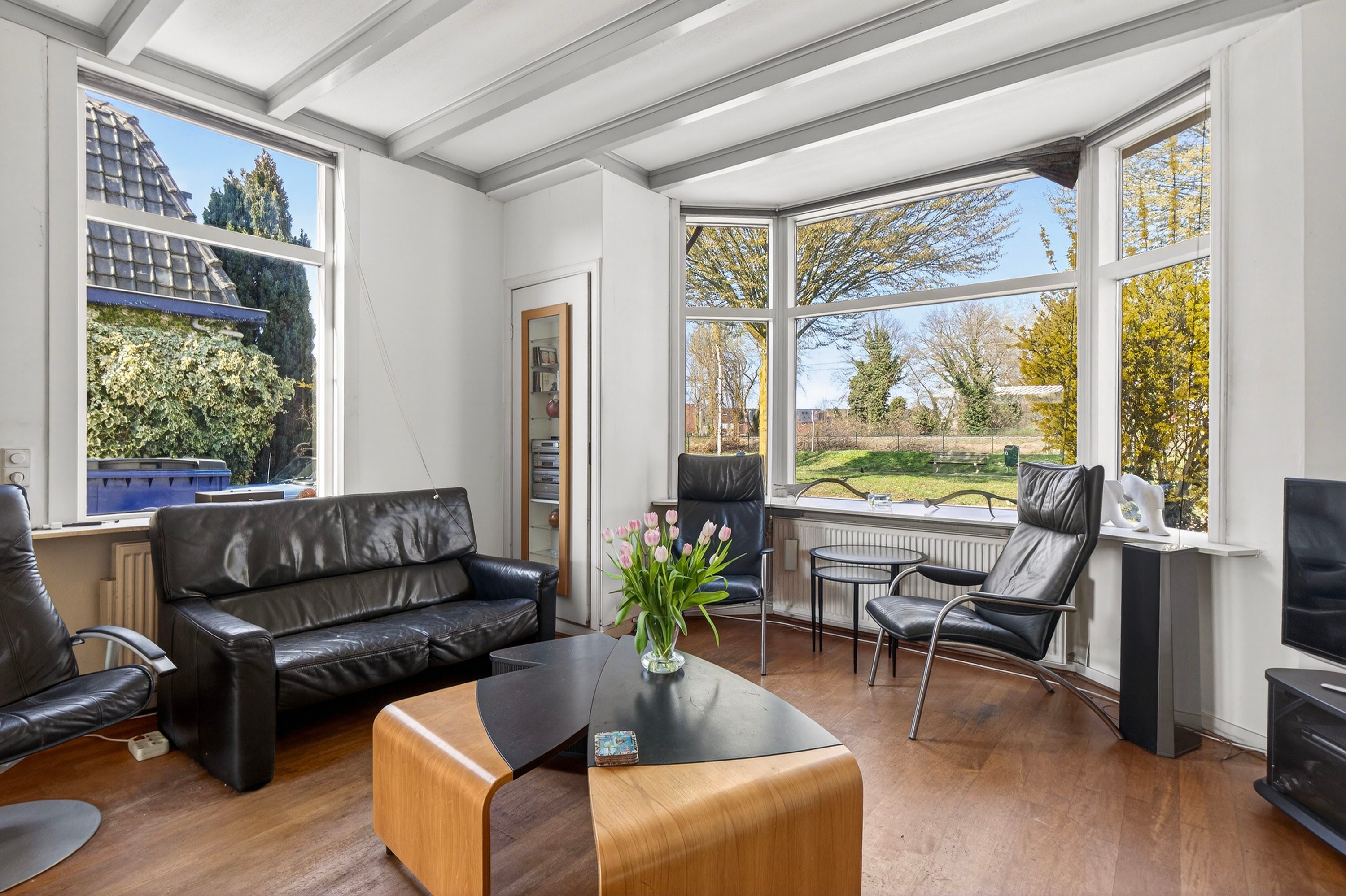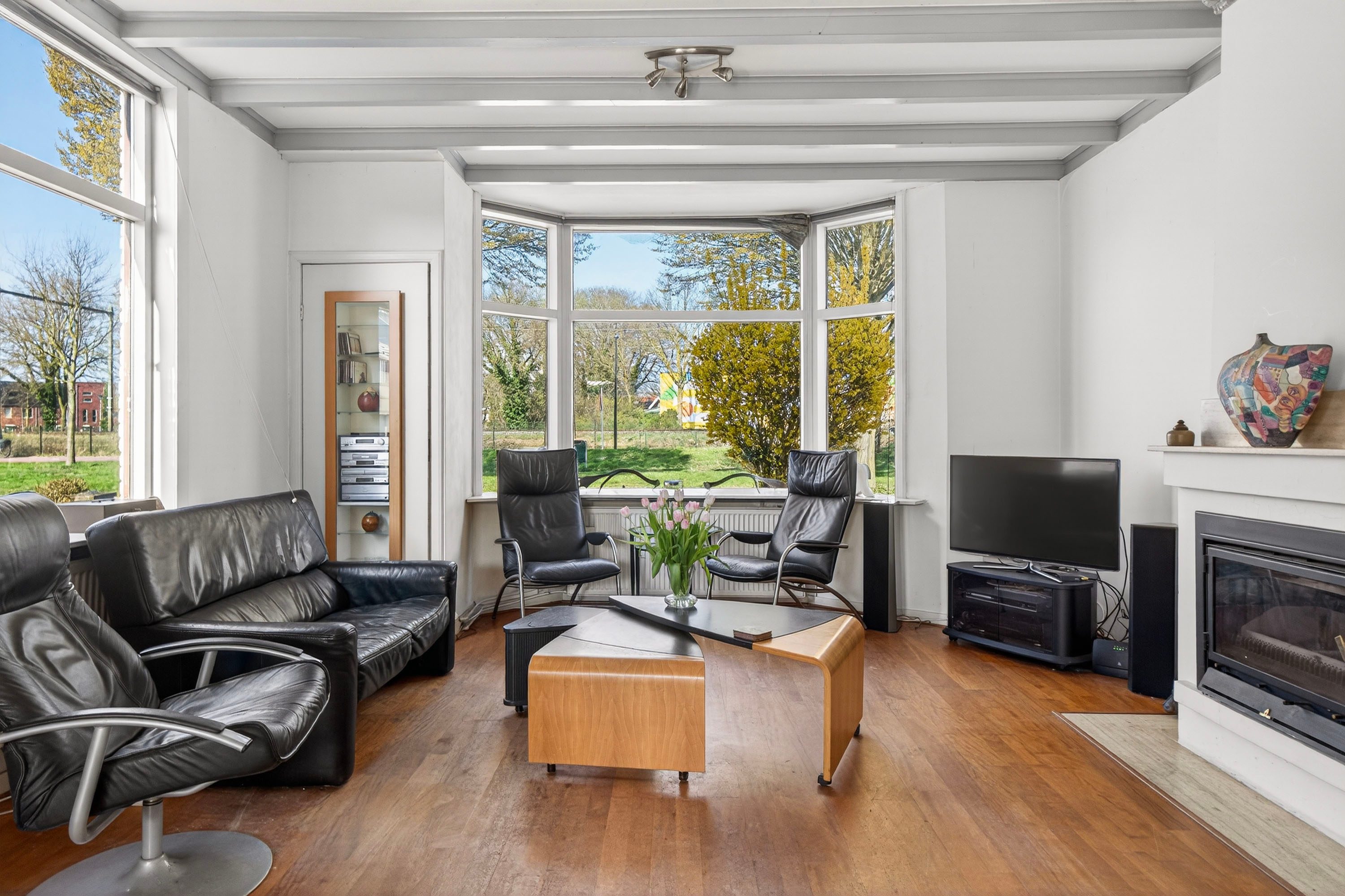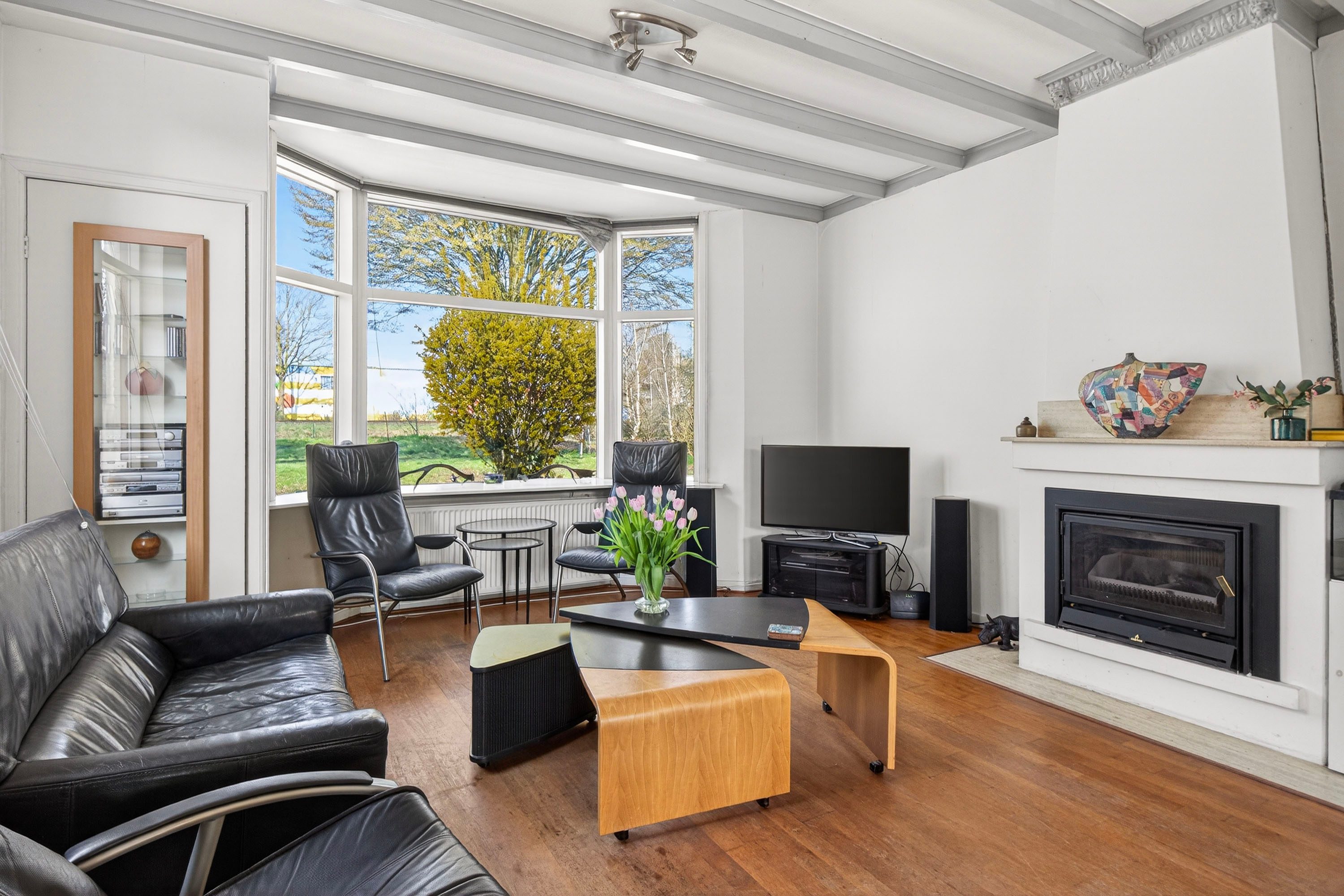 Vanuit de hal bereik je de lichte woonkamer met erker, die zorgt voor een prettige sfeer en een mooi uitzicht op de voortuin.