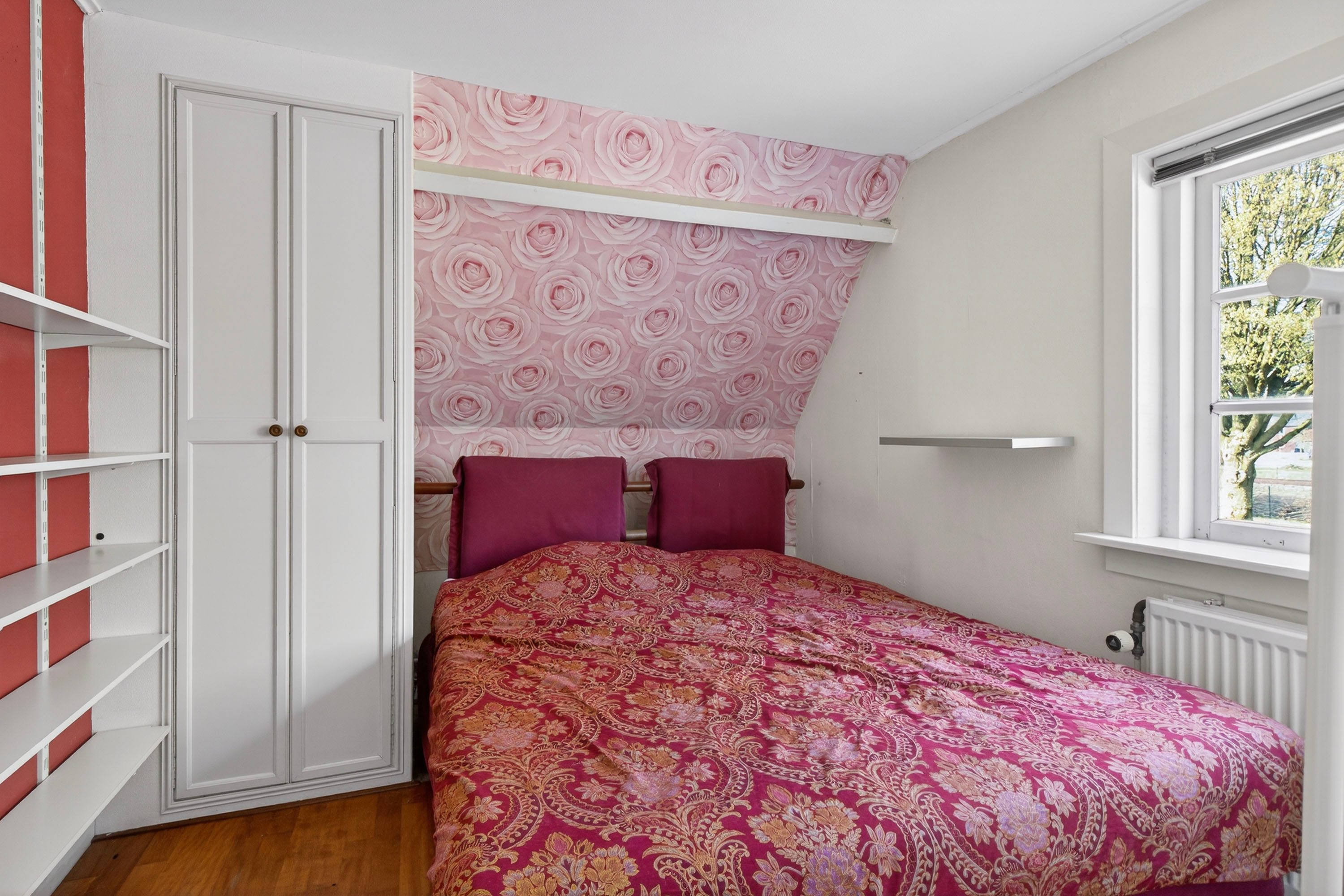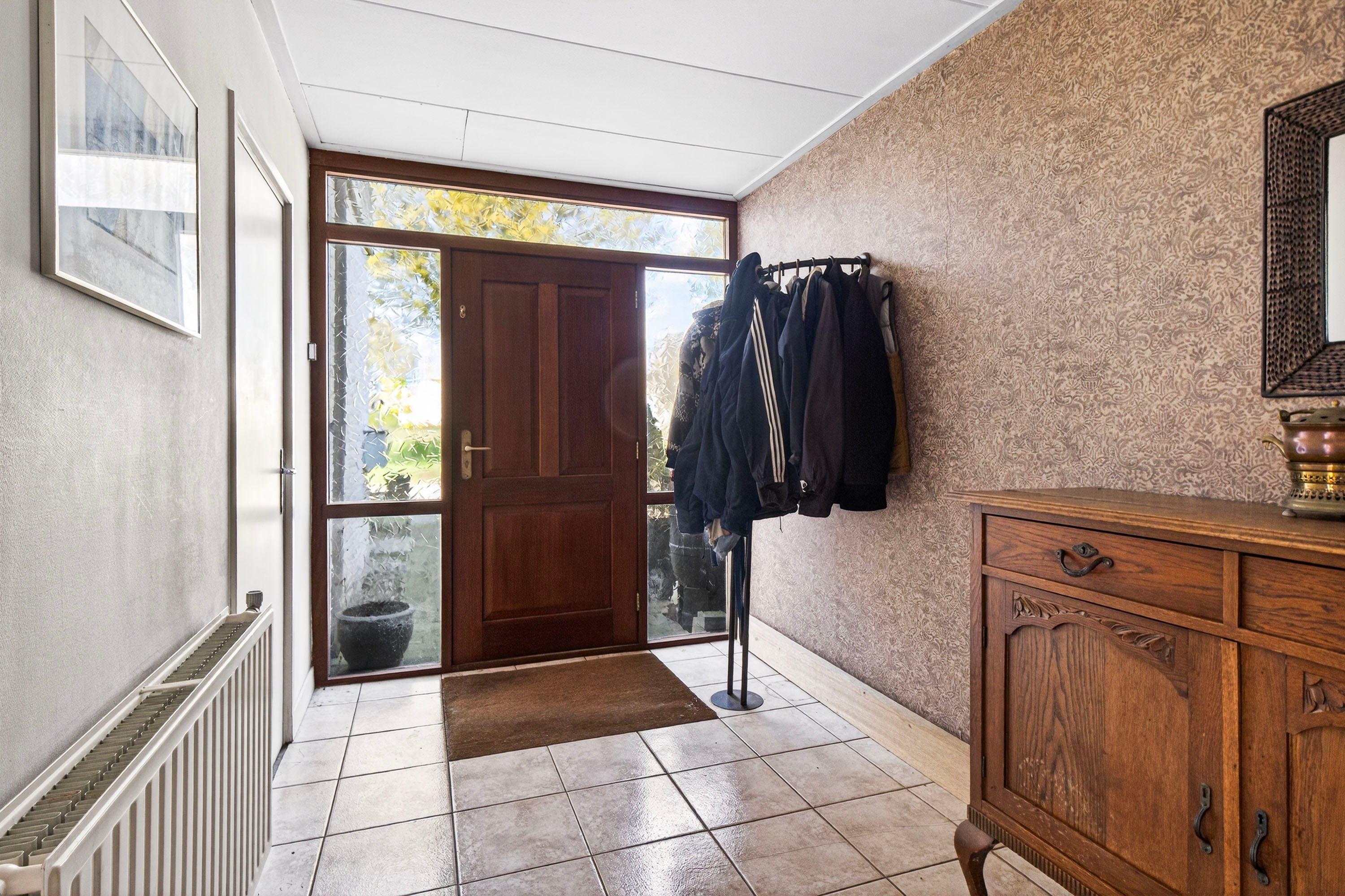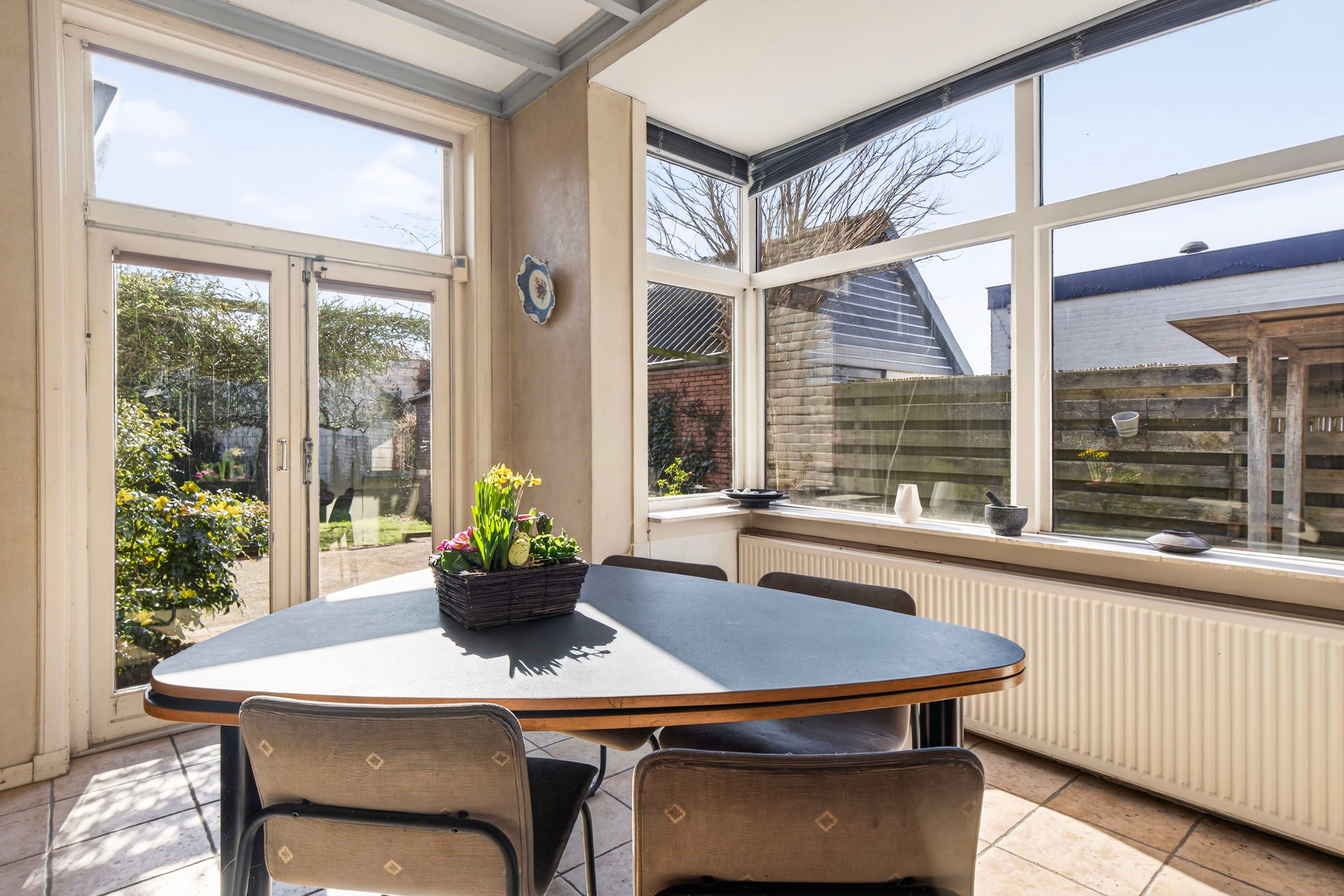 Vanuit de hal bereik je de lichte woonkamer met erker, die zorgt voor een prettige sfeer en een mooi uitzicht op de voortuin.