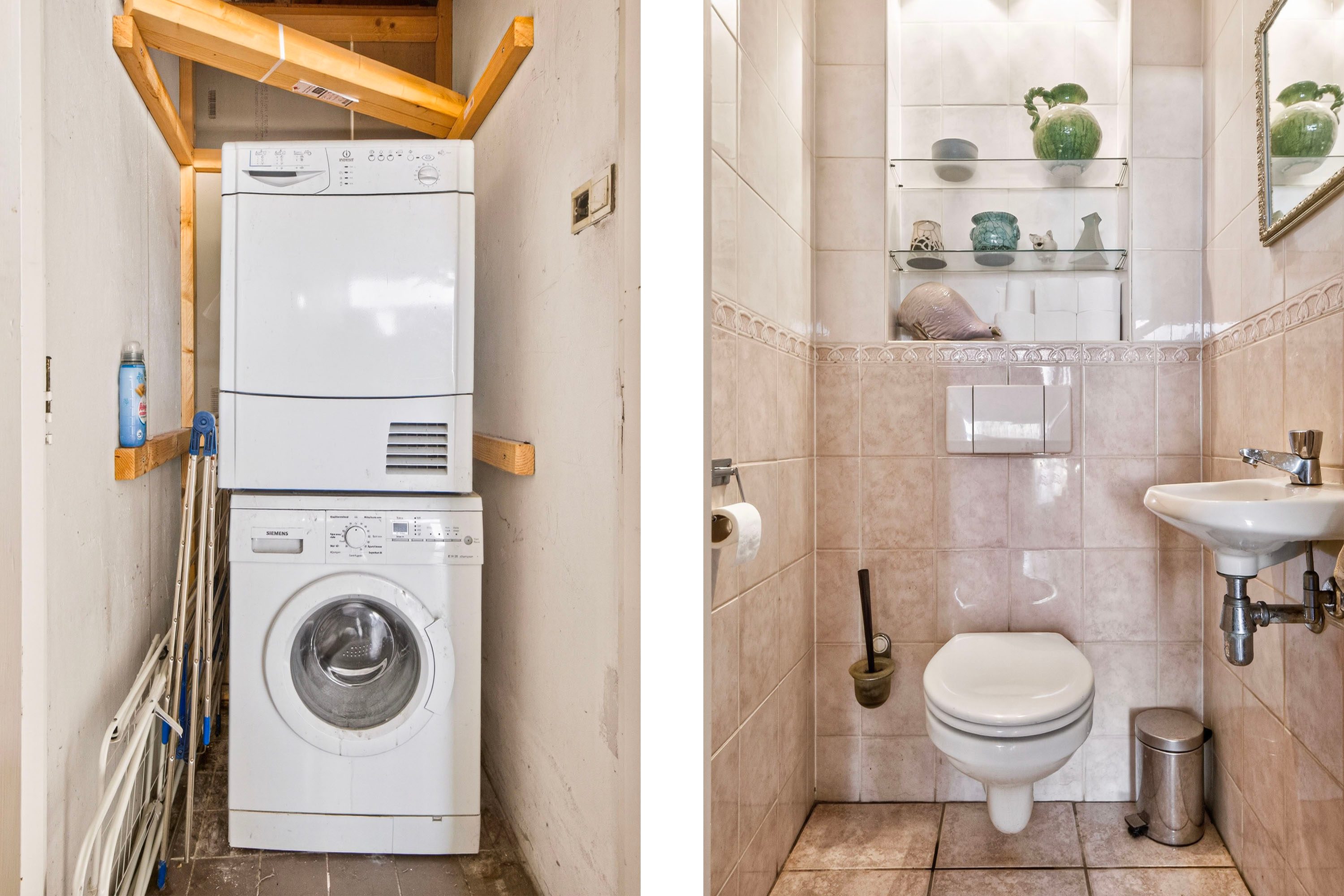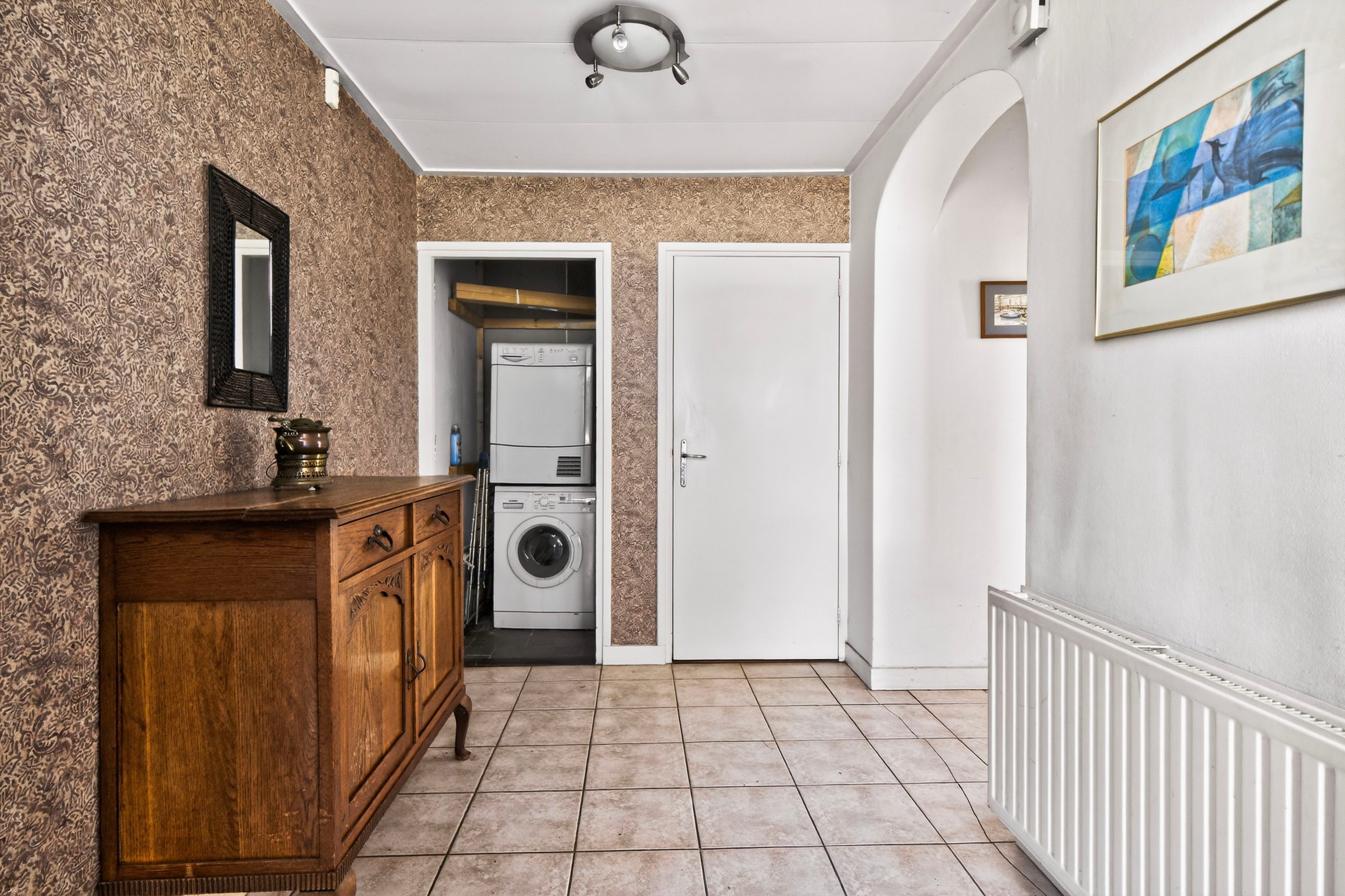 Binnenkomst in de ruime hal, waar tevens de aansluitingen voor de wasmachine en droger zijn gesitueerd en een separaat toilet aanwezig is.