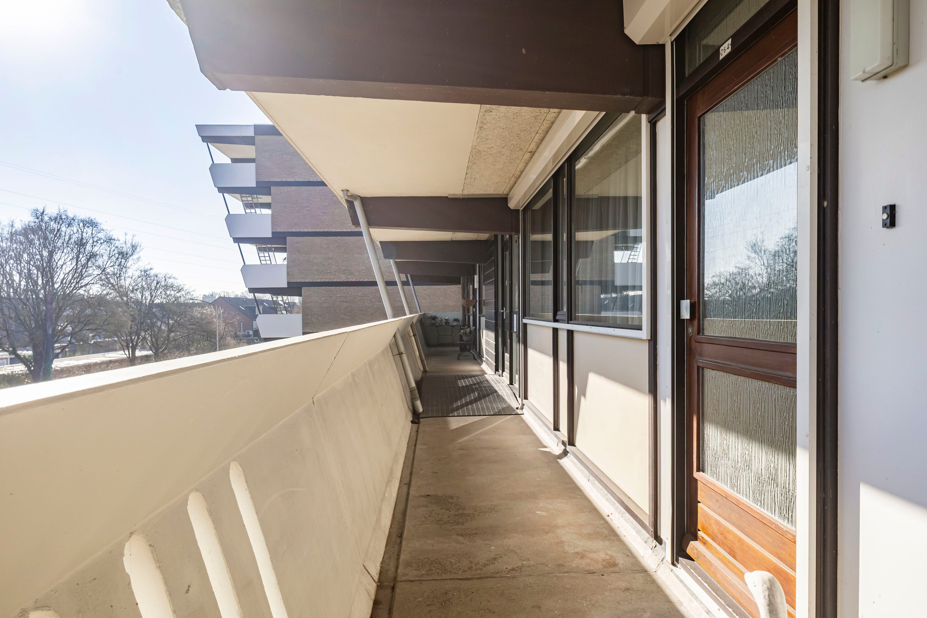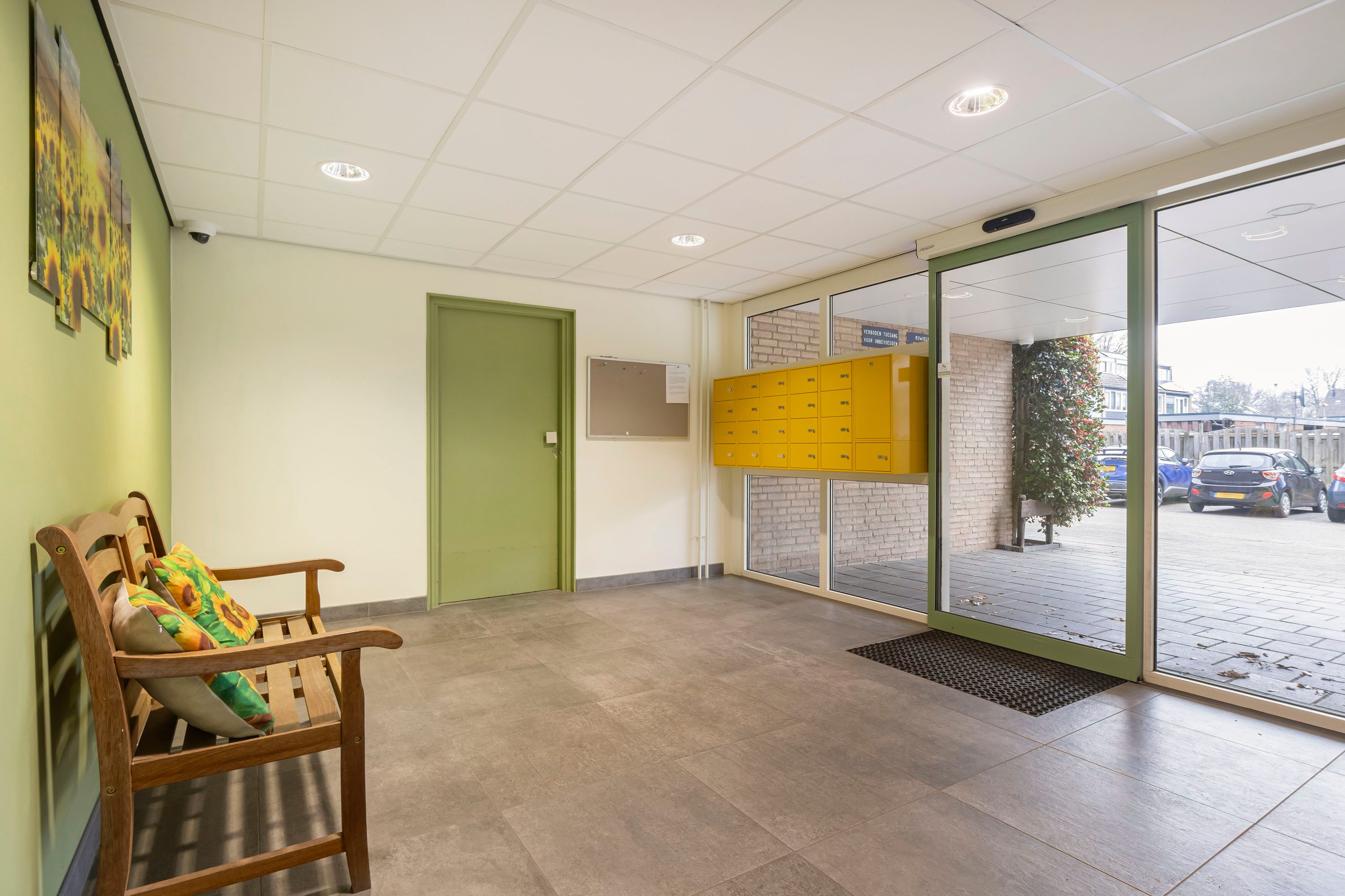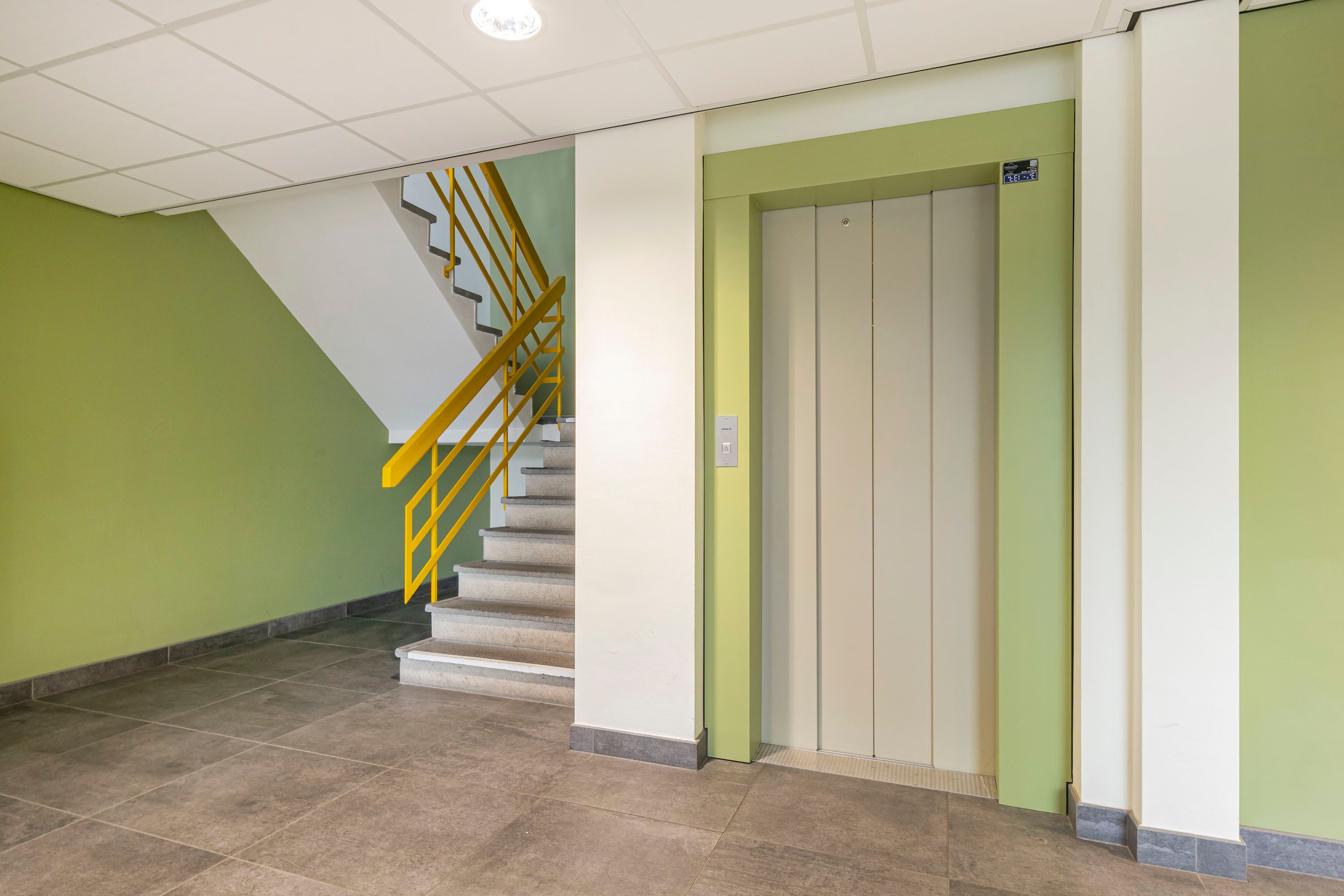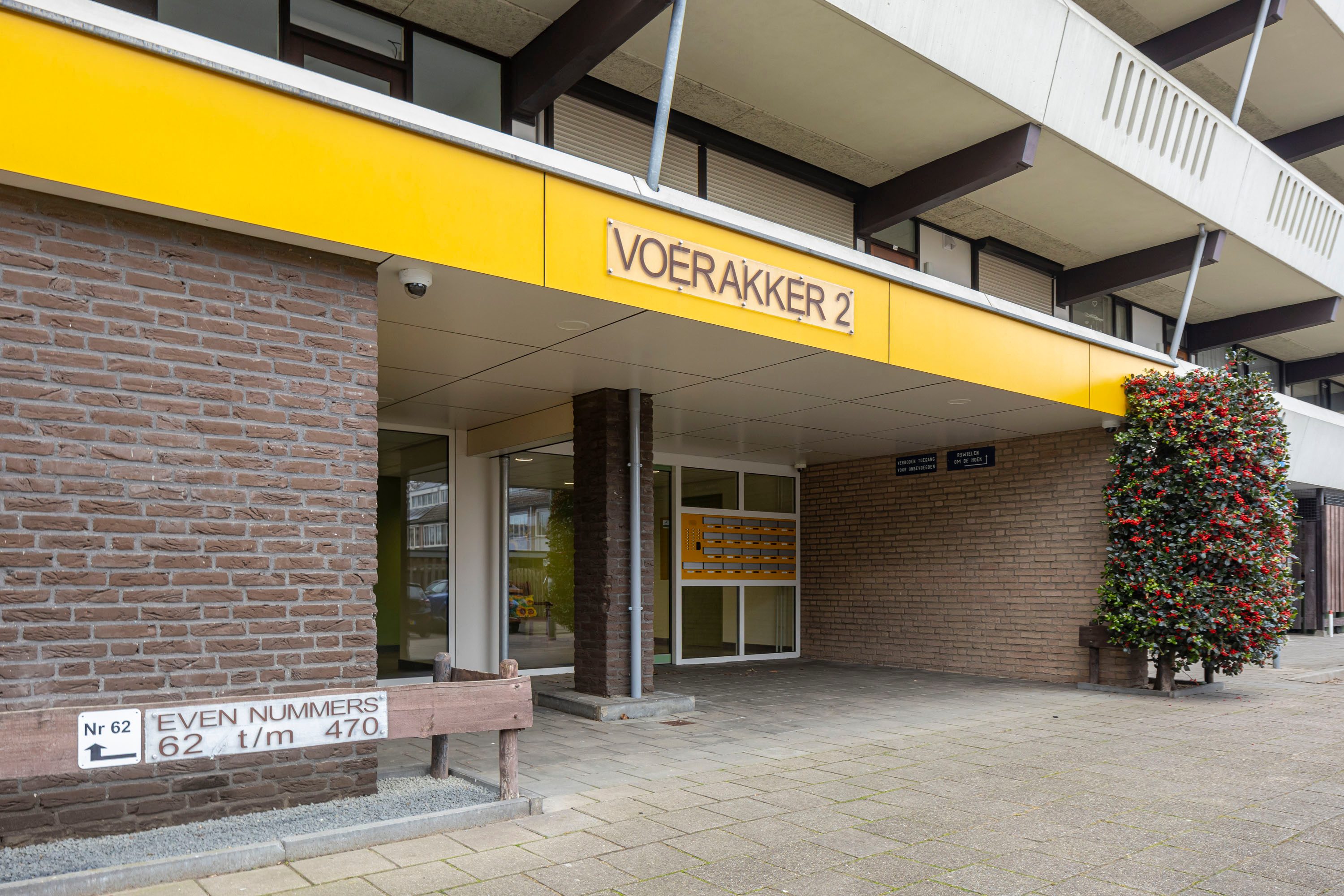 Het appartementencomplex beschikt over een centrale entree met brievenbussen en intercominstallatie. Vanuit hier bereik je via de trap of lift de open galerij en de entree van het appartement.