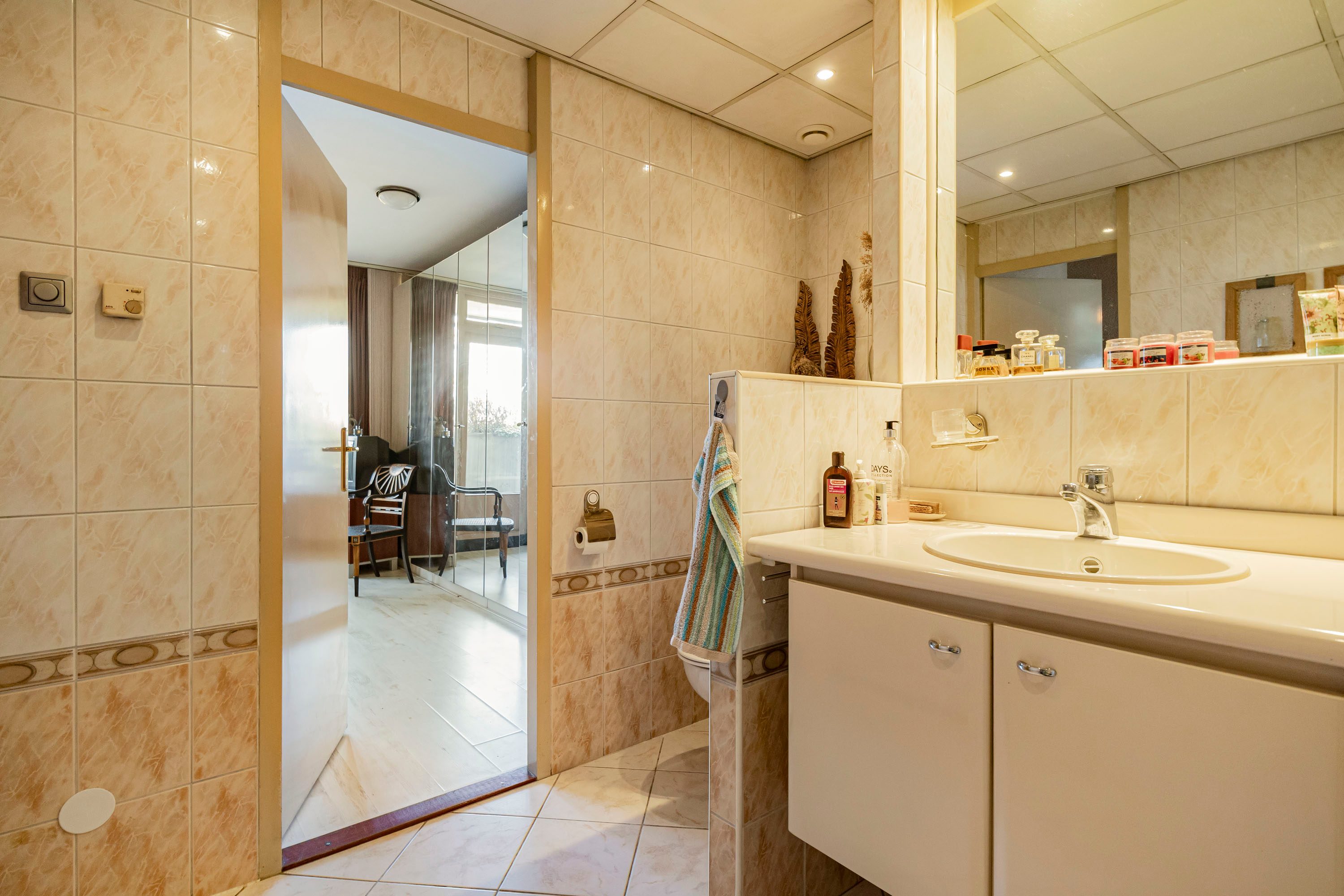 Het appartement beschikt over twee ruime slaapkamers van circa 19 m² en 13 m². Beide slaapkamers hebben directe toegang tot de balkons, waardoor je hier geniet van veel daglicht en een prettige verbinding met buiten. De badkamer van circa 7 m² is voorzien van vloerverwarming, keurig afgewerkt en uitgerust met een toilet, douche, spiegel en een royaal wastafelmeubel met volop opbergruimte.