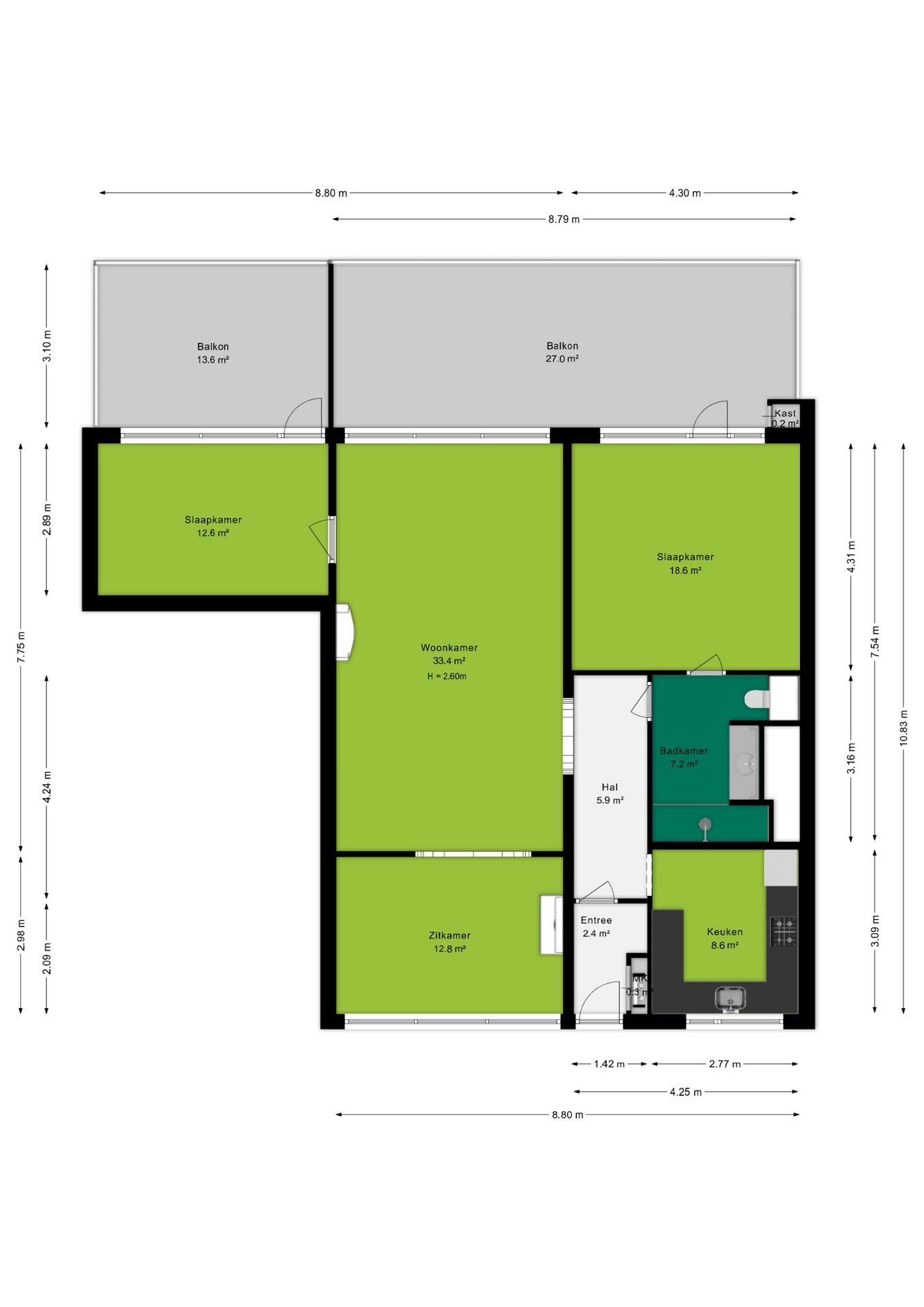Een bijzonder pluspunt zijn de twee balkons met een totale oppervlakte van respectievelijke 27 m² en 14 m², waar je heerlijk kunt genieten van de buitenlucht en de middag- en avondzon. In combinatie met de ruime woonkamer en de praktische indeling zorgt dit voor een appartement met veel comfort en mogelijkheden.
