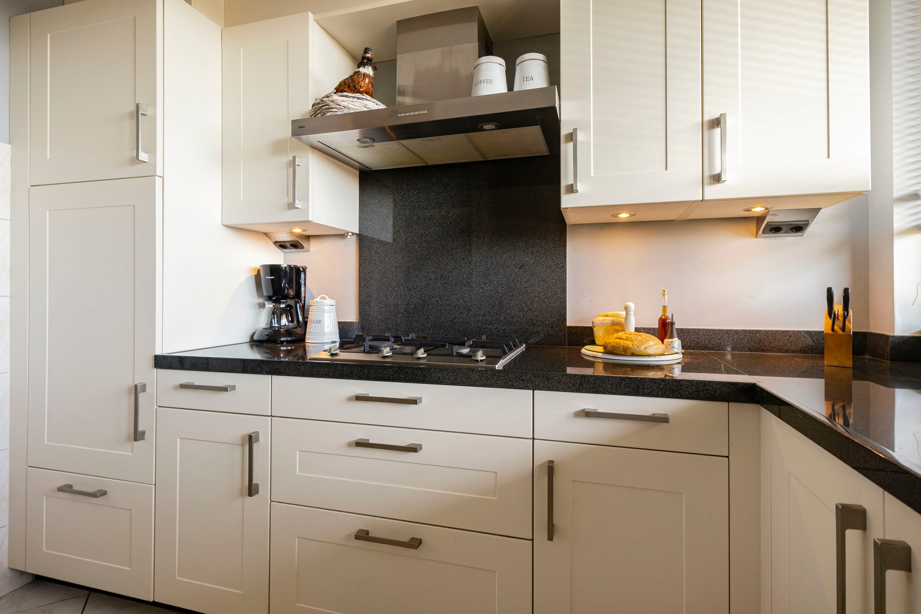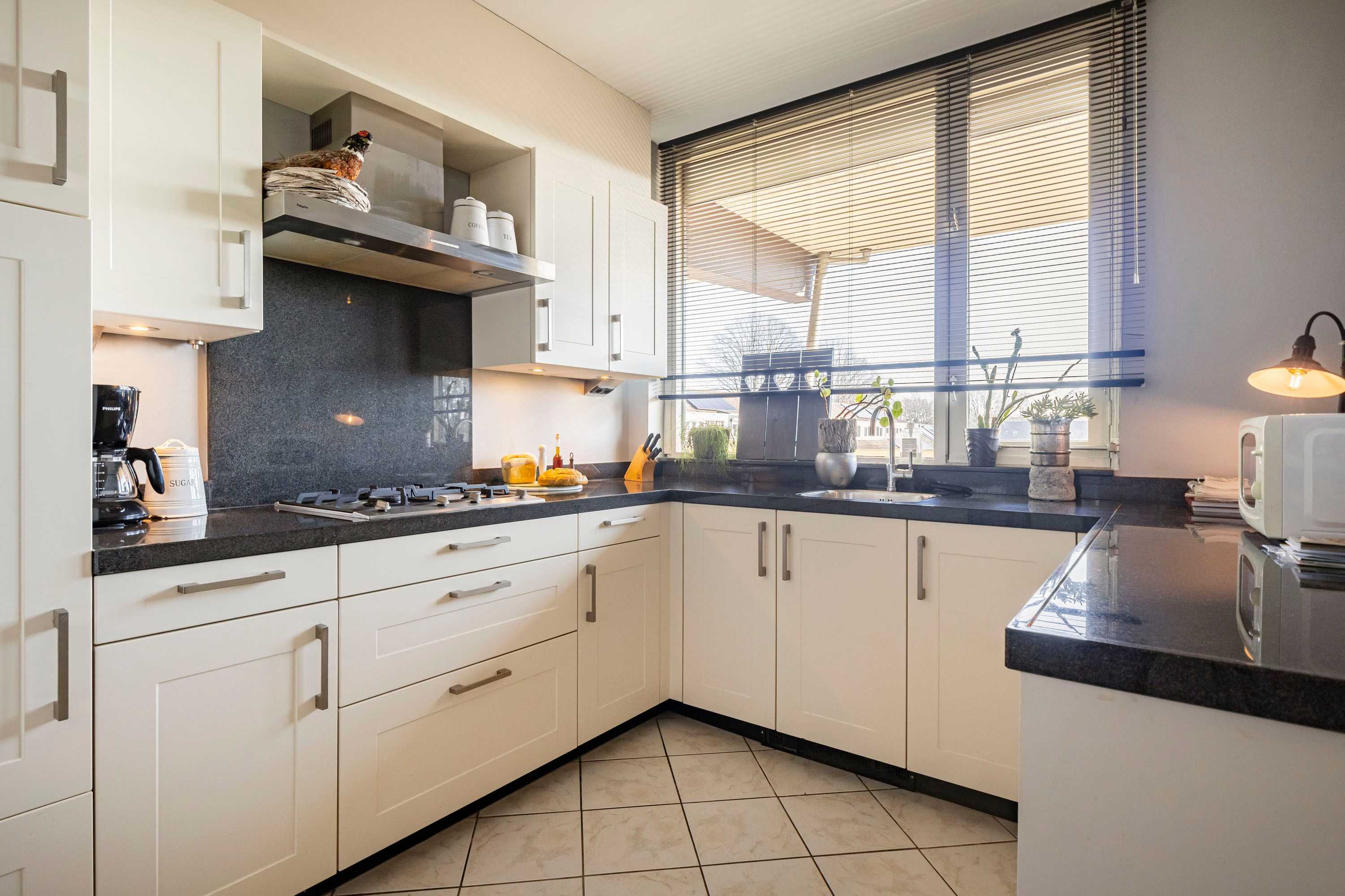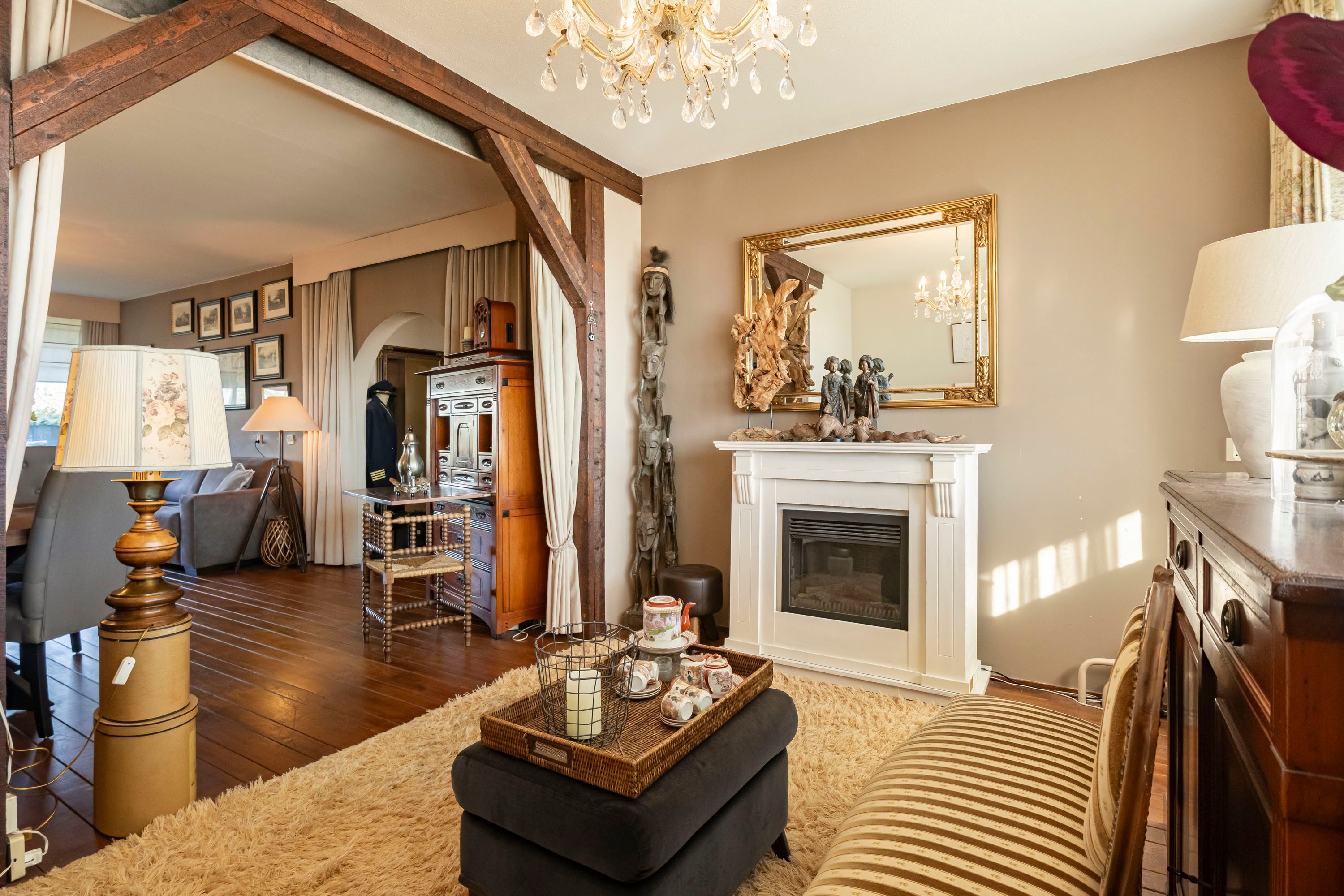 De keuken bevindt zich direct bij binnenkomst en is praktisch ingedeeld. De keuken is voorzien van een gasfornuis, koelkast en veel opbergruimte. De hal leidt naar de ruime woonkamer van circa 33 m². Dankzij de grote raampartijen is dit een lichte en aangename ruimte waar voldoende plek is voor een comfortabele zithoek en een eethoek. Aansluitend aan de woonkamer bevindt zich een extra zitkamer van circa 13 m². Deze ruimte kan uitstekend worden gebruikt als eetkamer, werkruimte of extra loungeplek.