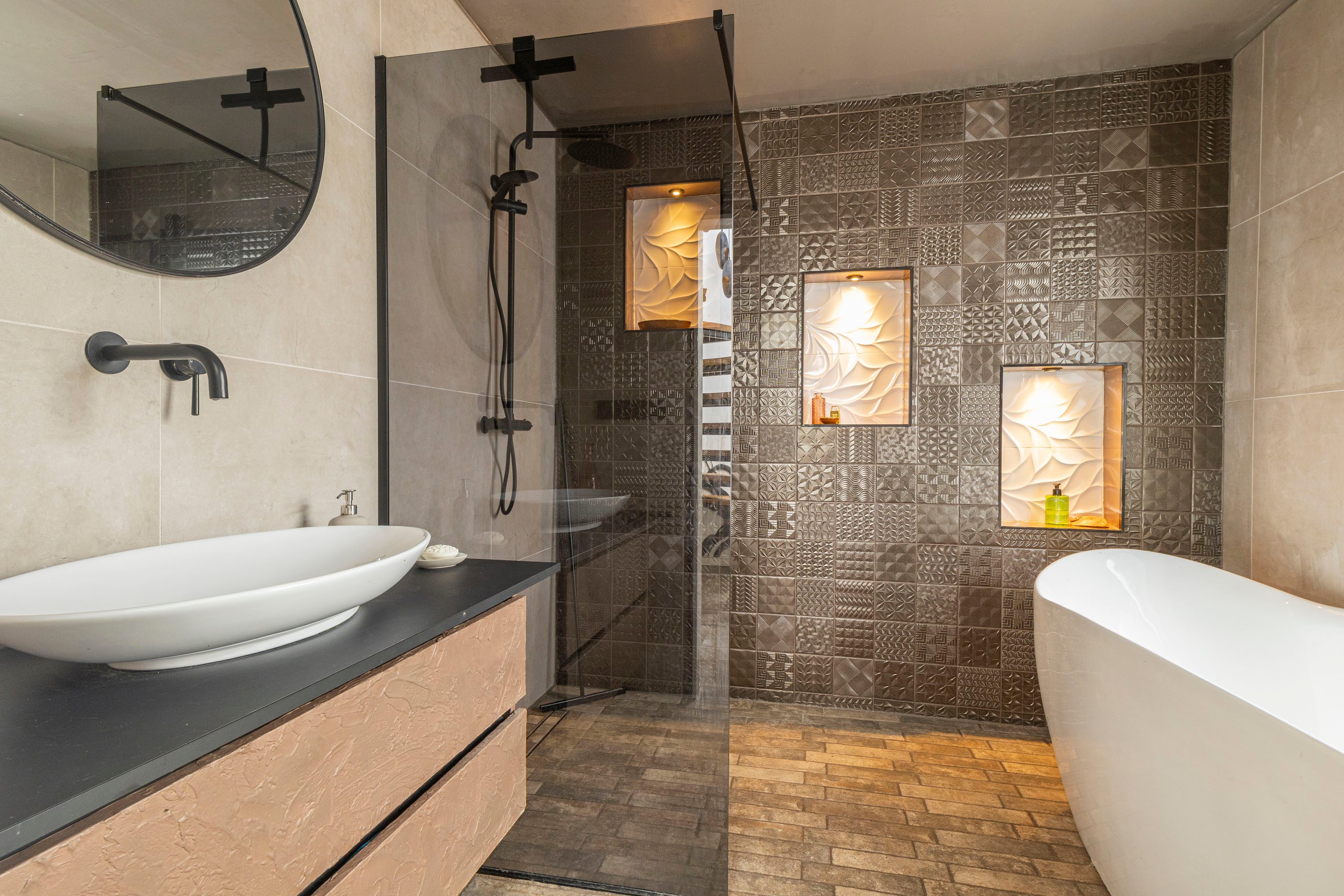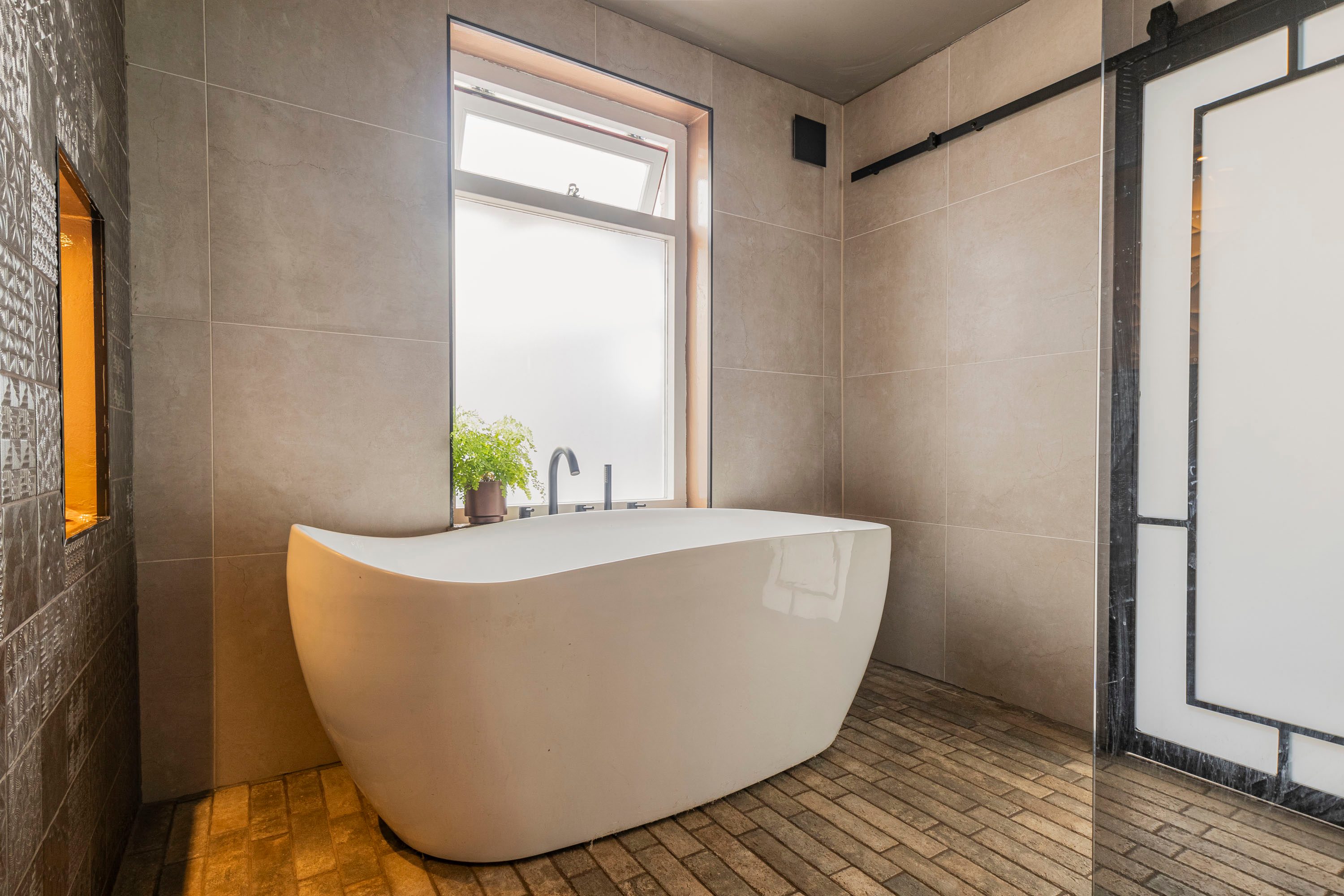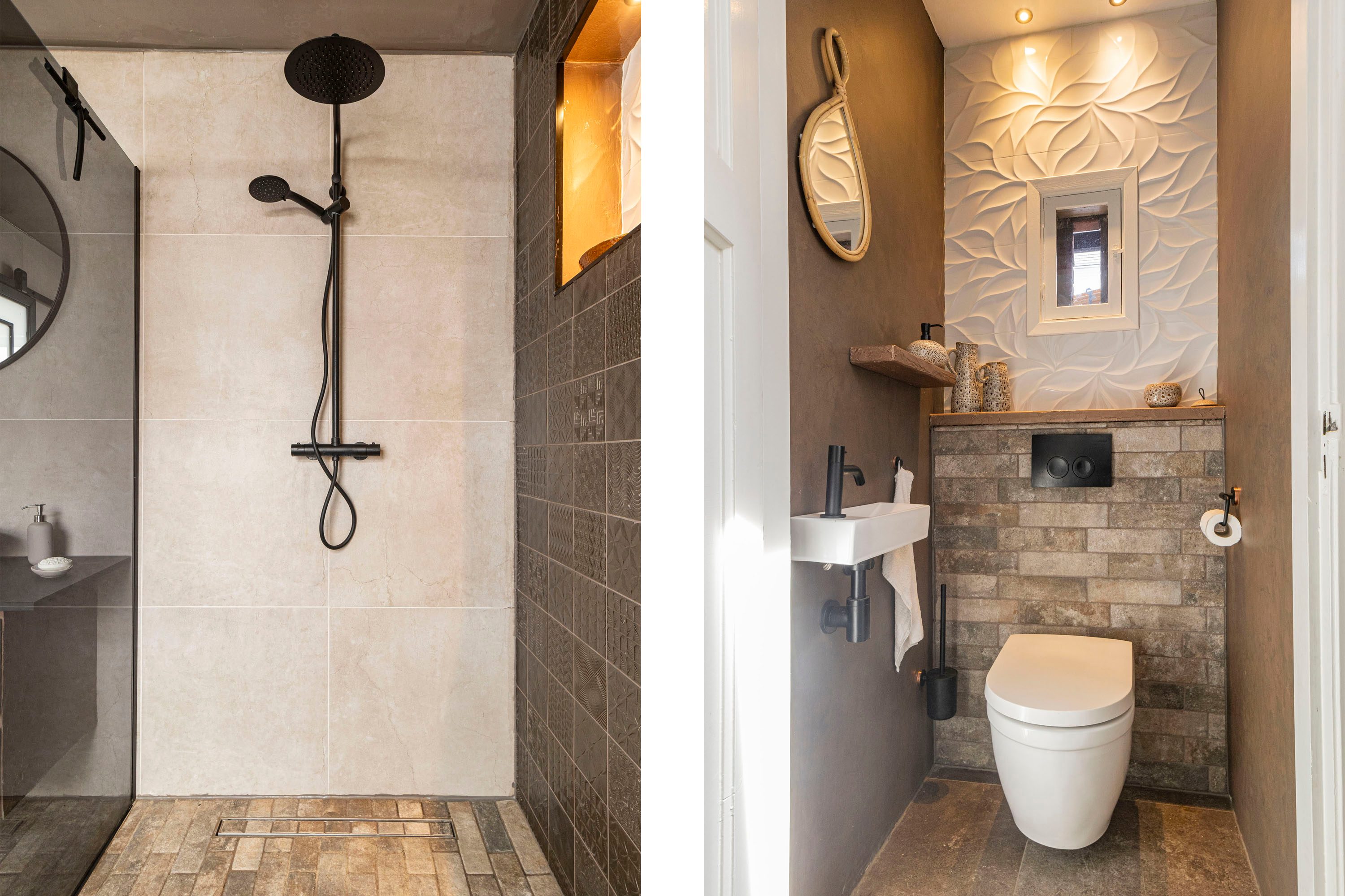Een luxe badkamer (2025) maakt de begane grond compleet. Bijna 7 m² groot en voorzien van een vrijstaand ligbad, een ruime inloopdouche, vloerverwarming en een groot wastafelmeubel met enkele wastafel.