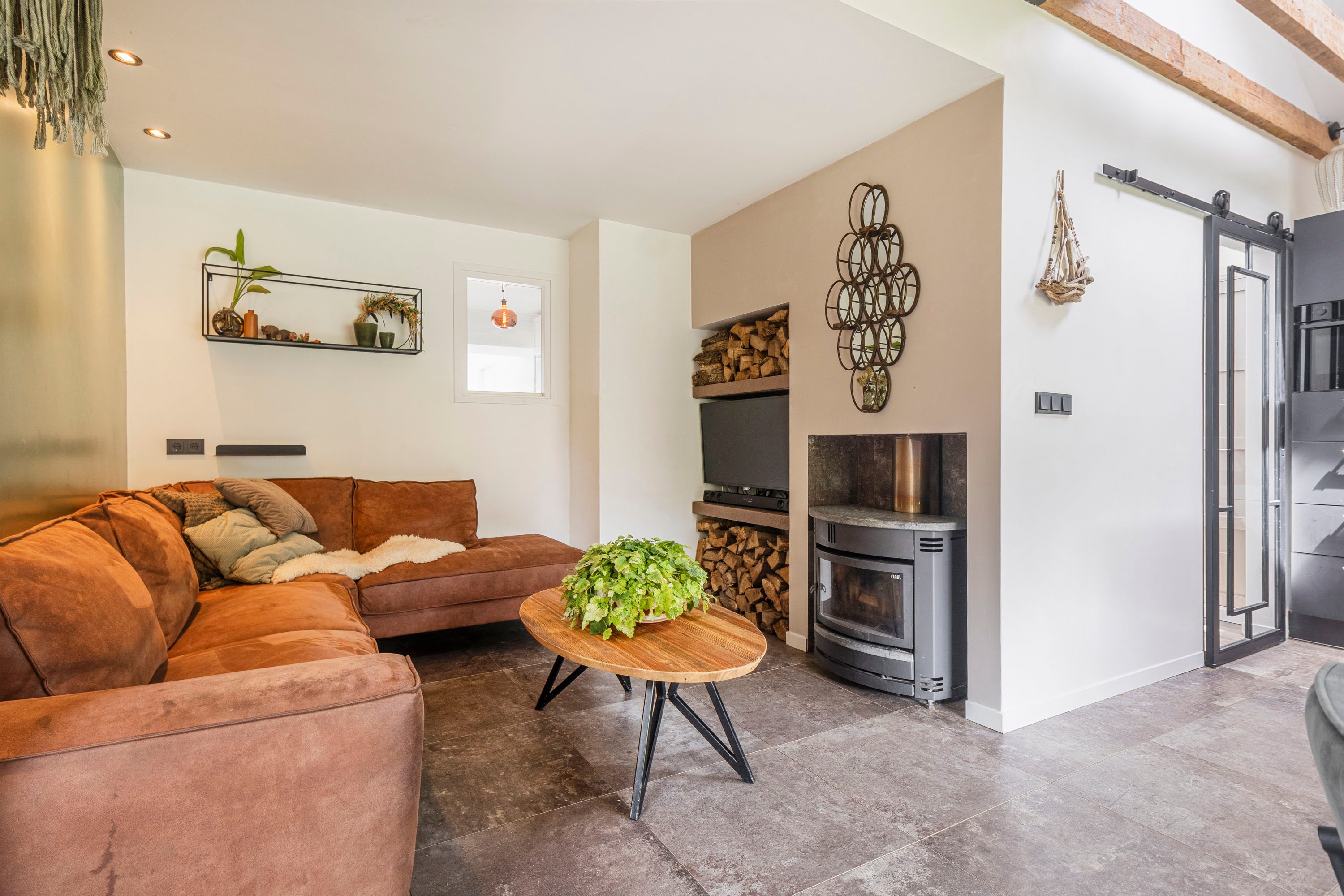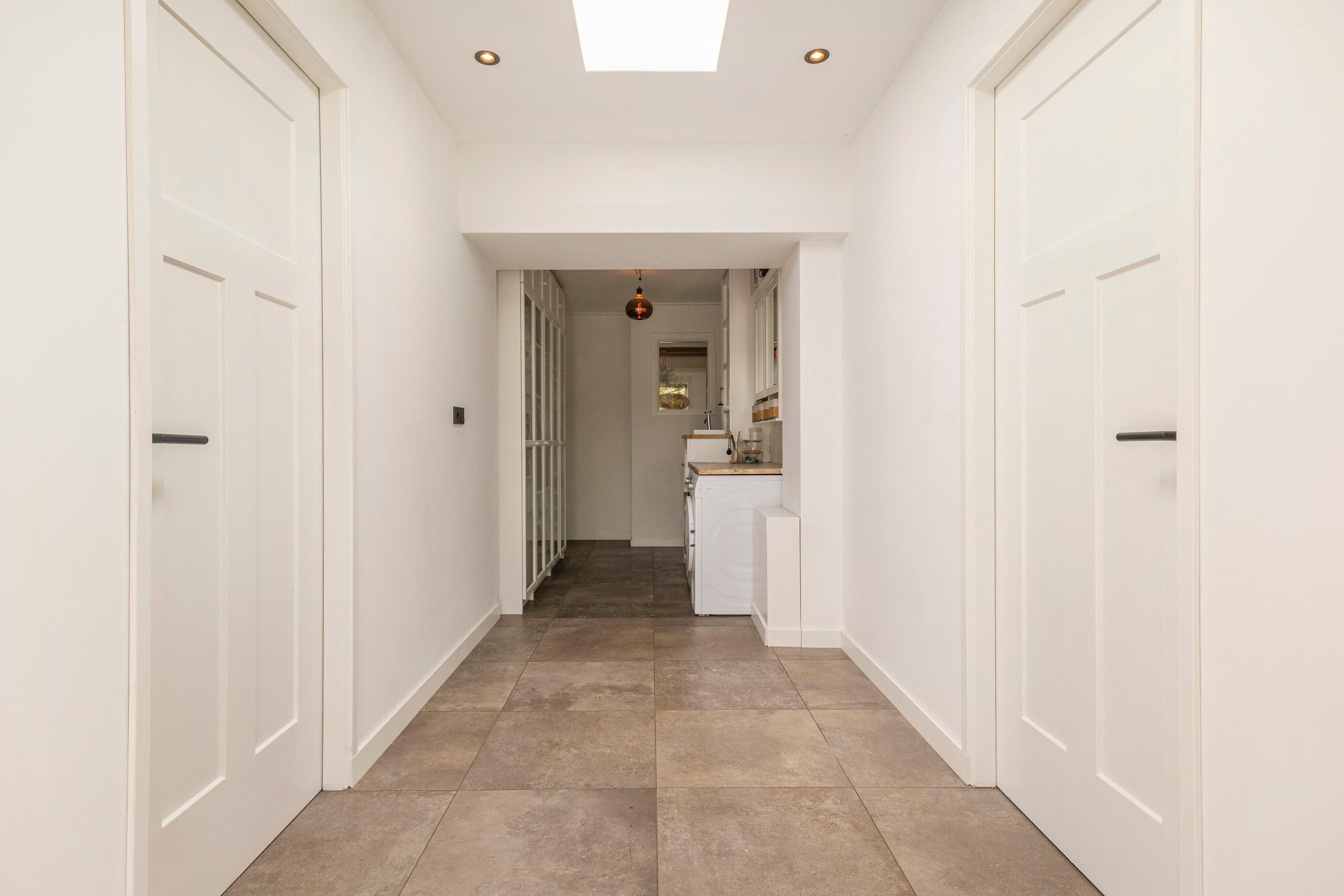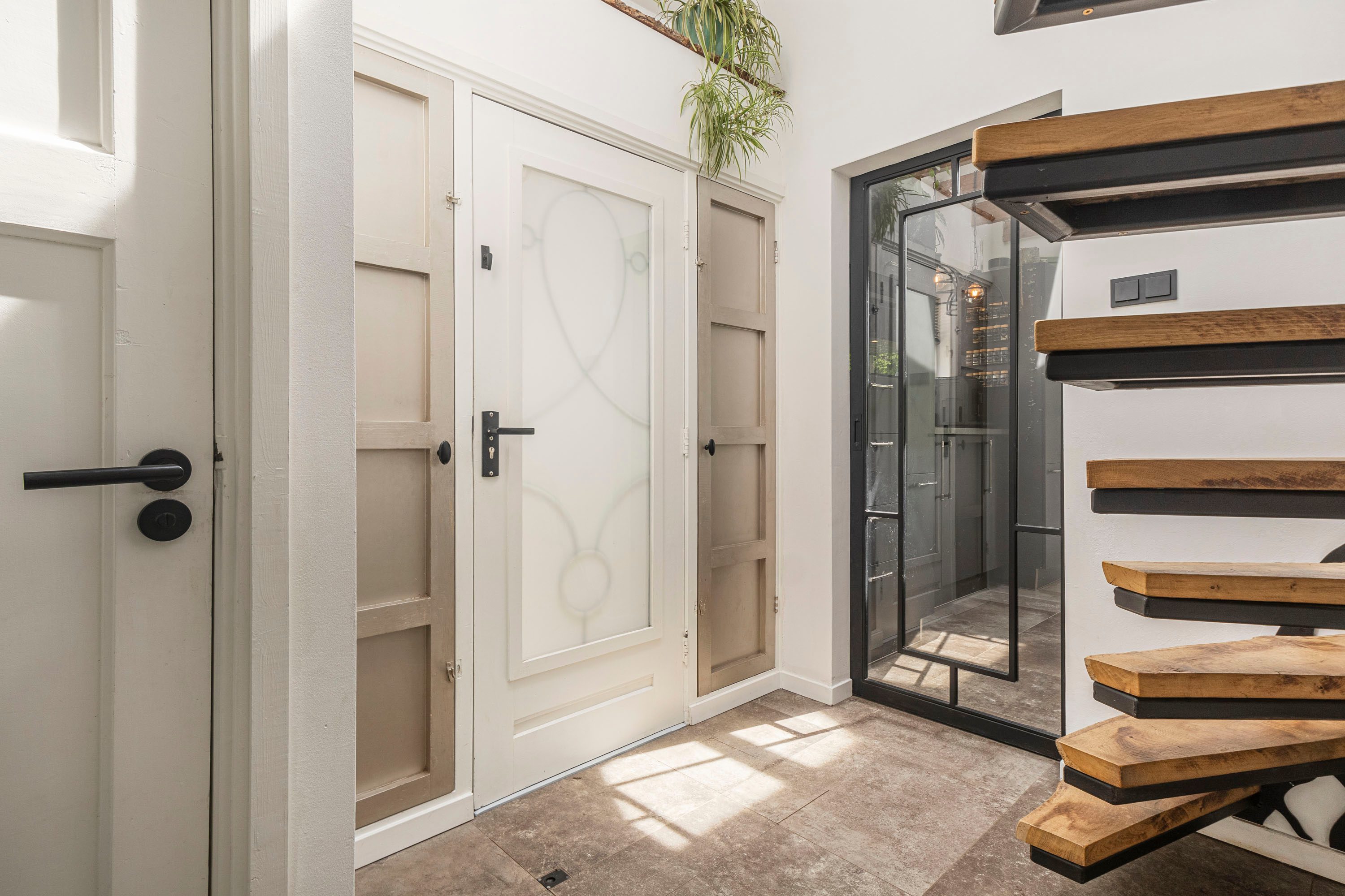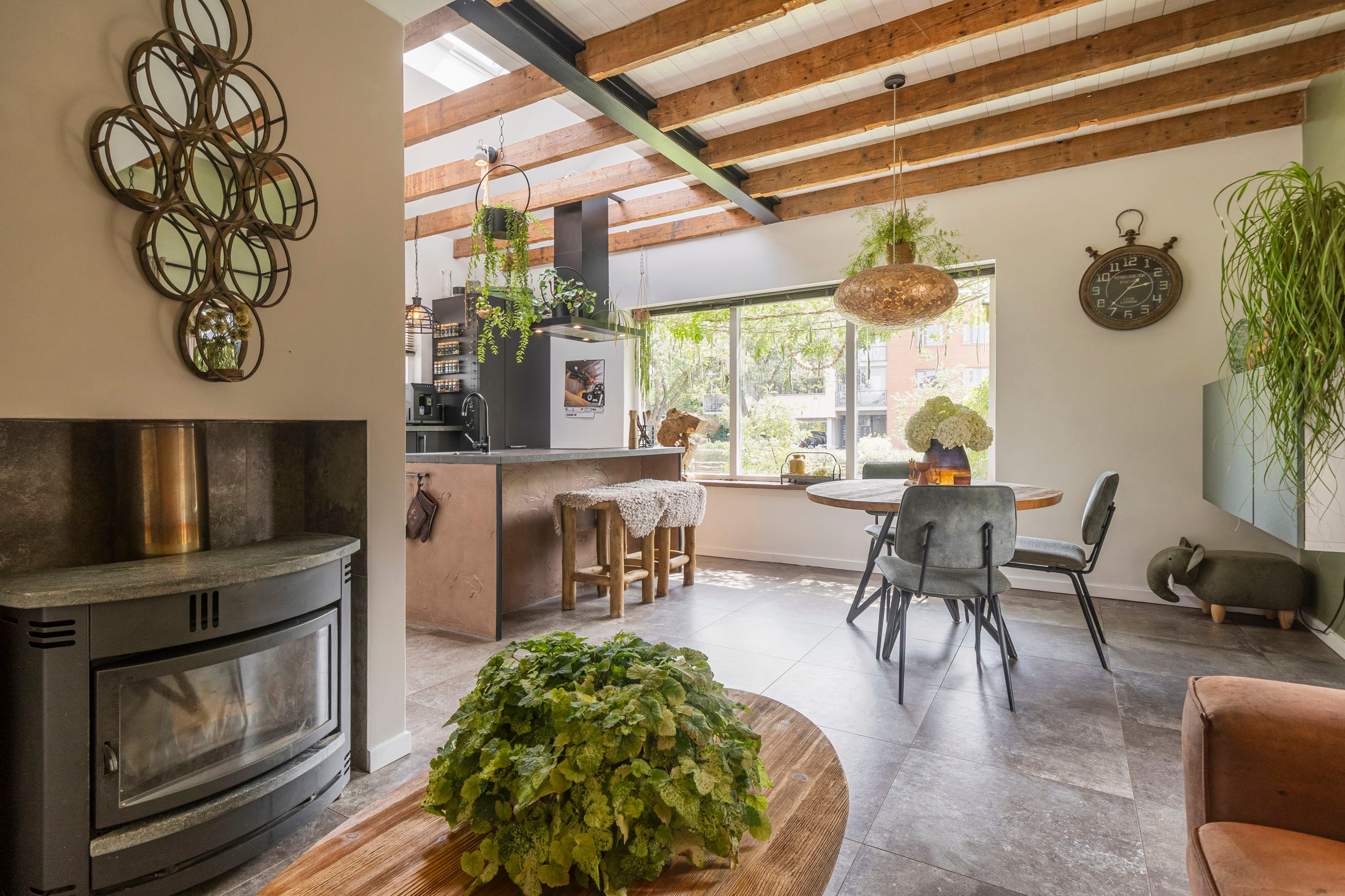 Bij binnenkomst valt meteen de ruime entree en het lichte en uitnodigende karakter van de woning op. Links een stalen schuifdeur die je naar de woon-/eetkamer brengt. De woonkamer is gezellig opgezet en geniet van veel daglicht via de vele raampartijen in de gevels en de dakramen. De openslaande deuren verbinden de binnenruimte naadloos met de tuin, perfect om op zonnige dagen van het buitenleven te genieten.