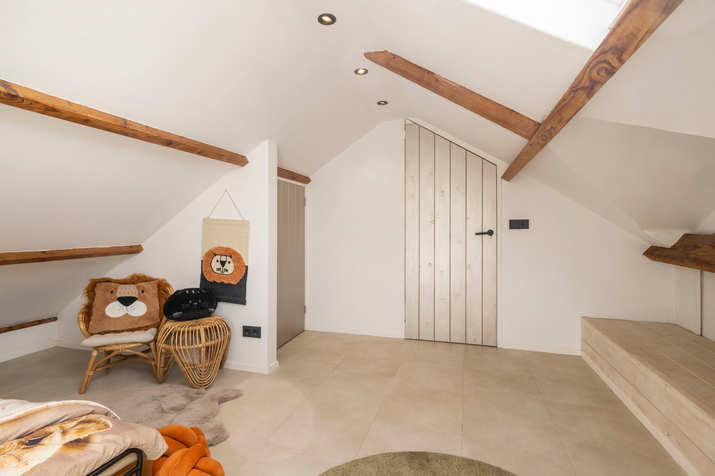 De eerste verdieping is bereikbaar via de stalen trap. Hier bevindt zich een 4e slaapkamer en bergruimte. Deze verdieping wordt tevens gekoeld en/of verwarmd door een airconditioning.