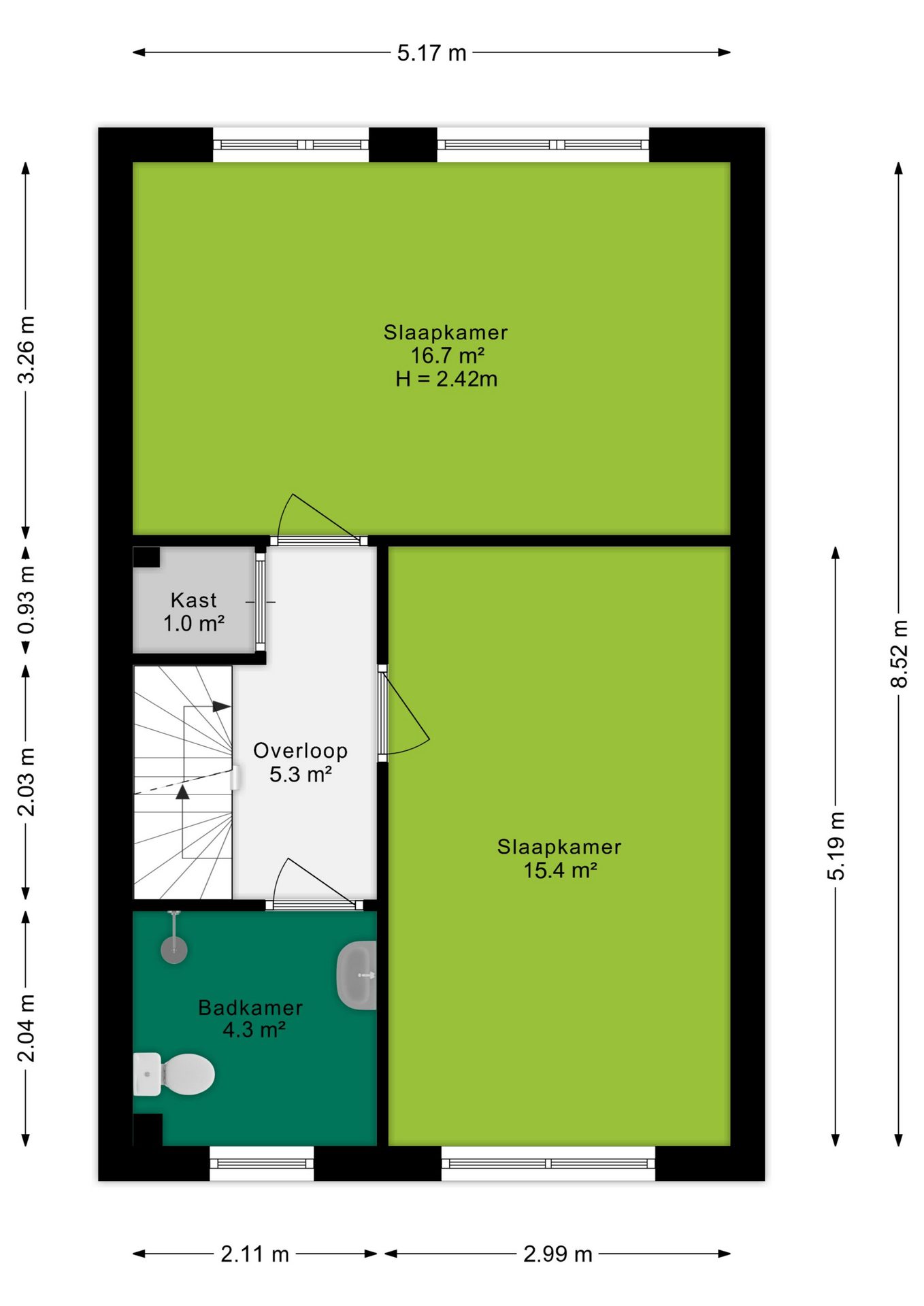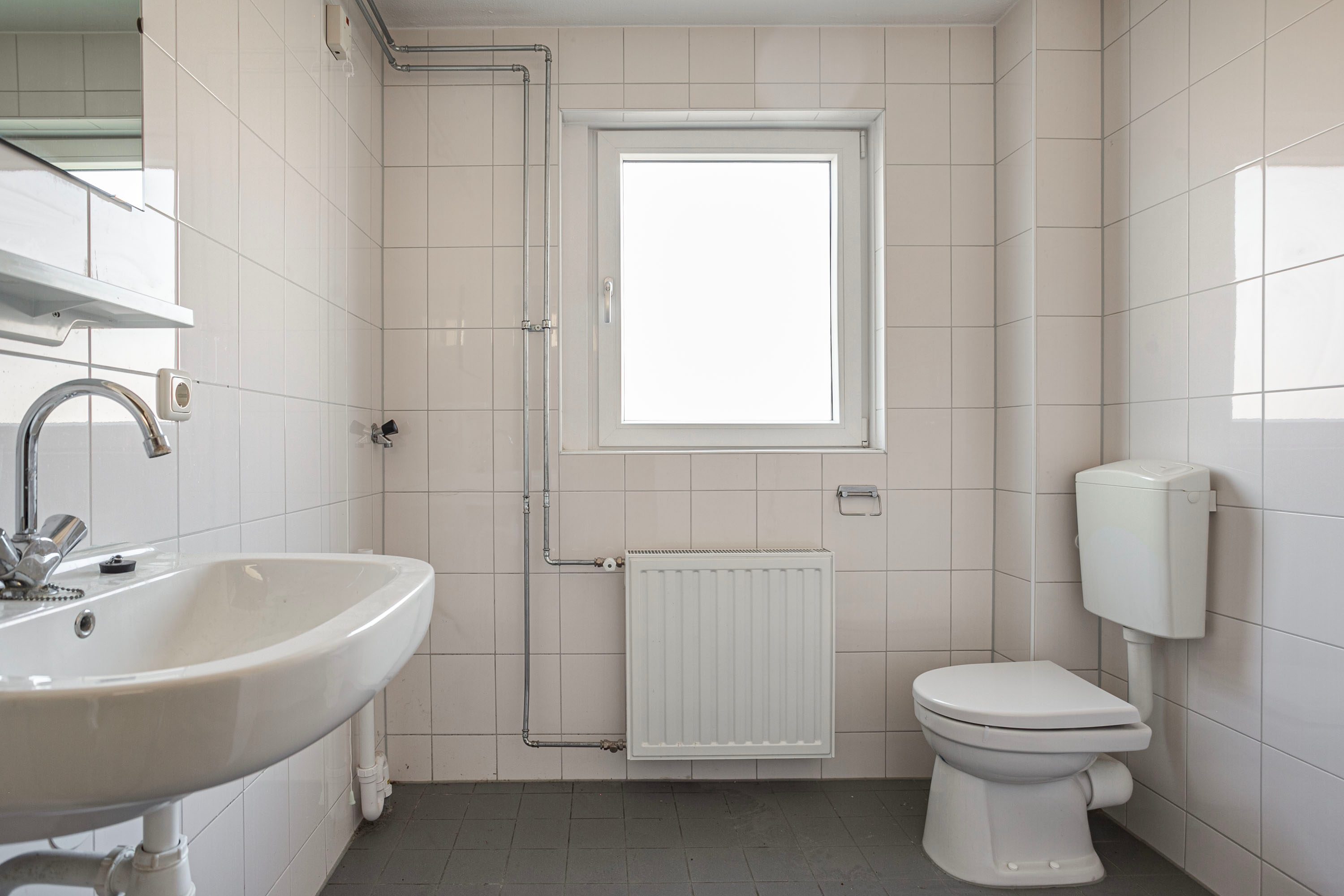 Via de vaste trap kom je bij de overloop met toegang tot 2 slaapkamers, de badkamer, bergkast en vaste trap naar de 2e verdieping. Aan de achterzijde is een slaapkamer over de volledige breedte van de woning, waarmee de slaapkamer van circa 17m² van een prettig formaat is. De andere slaapkamer is circa 15m² en daarmee ook ruim te noemen. De badkamer is in lichte kleurstelling en volledig betegeld, beschikt over een wastafel, douche, witgoedaansluiting en 2e toilet.