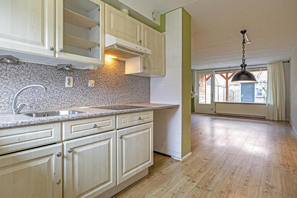 Entreehal met een toilet en trapopgang naar de eerste verdieping. Vanuit de hal heb je toegang tot de woonkamer met aan de voorzijde de open keuken. De open keuken is voorzien van L vormig keukenblok met kookplaat en afzuigkap. De woonkamer is gelegen aan de achterzijde van de woning en beschikt over een groot raam. De praktische trapkast biedt bergruimte voor voorraad. Via de woonkamer is er toegang naar de tuin middels de deur aan de achterzijde van de woning. De begane grond is voorzien van een laminaatvloer.