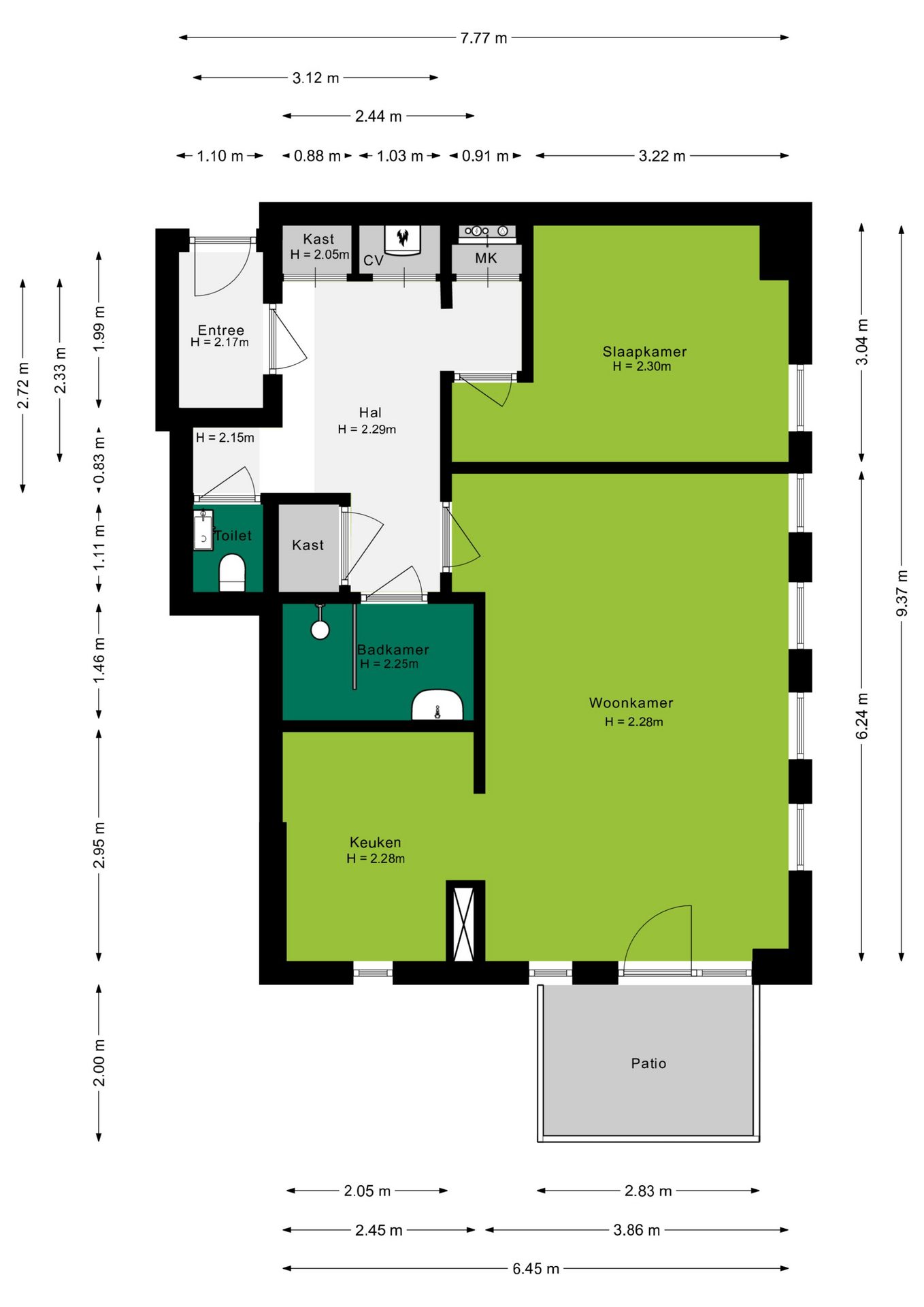 Bij binnenkomst is er toegang naar alle vertrekken van het appartement. In de hal tref je meerdere vaste kasten, met o.a. een meterkast, C.V.-opstelling en bergruimte. In de woonkamer beschik je over een ruimte van circa 24m² voor het plaatsen van een zithoek en een eethoek. De half open keuken is circa 6m² en biedt de mogelijkheid om een hoekkeuken te plaatsen. De slaapkamer is gelegen aan de achterzijde van het appartement. Bovendien beschik je over een moderne badkamer met inloopdouche, wastafel en handdoekradiator. Het aparte toilet zorgt ervoor dat visite niet in je badkamer hoeft te komen. De toiletruimte is voorzien van een zwevend toilet en een fontein. Met een kleine patio/atrium beschik je over een eigen buitenruimte gelegen op het zuidwesten.