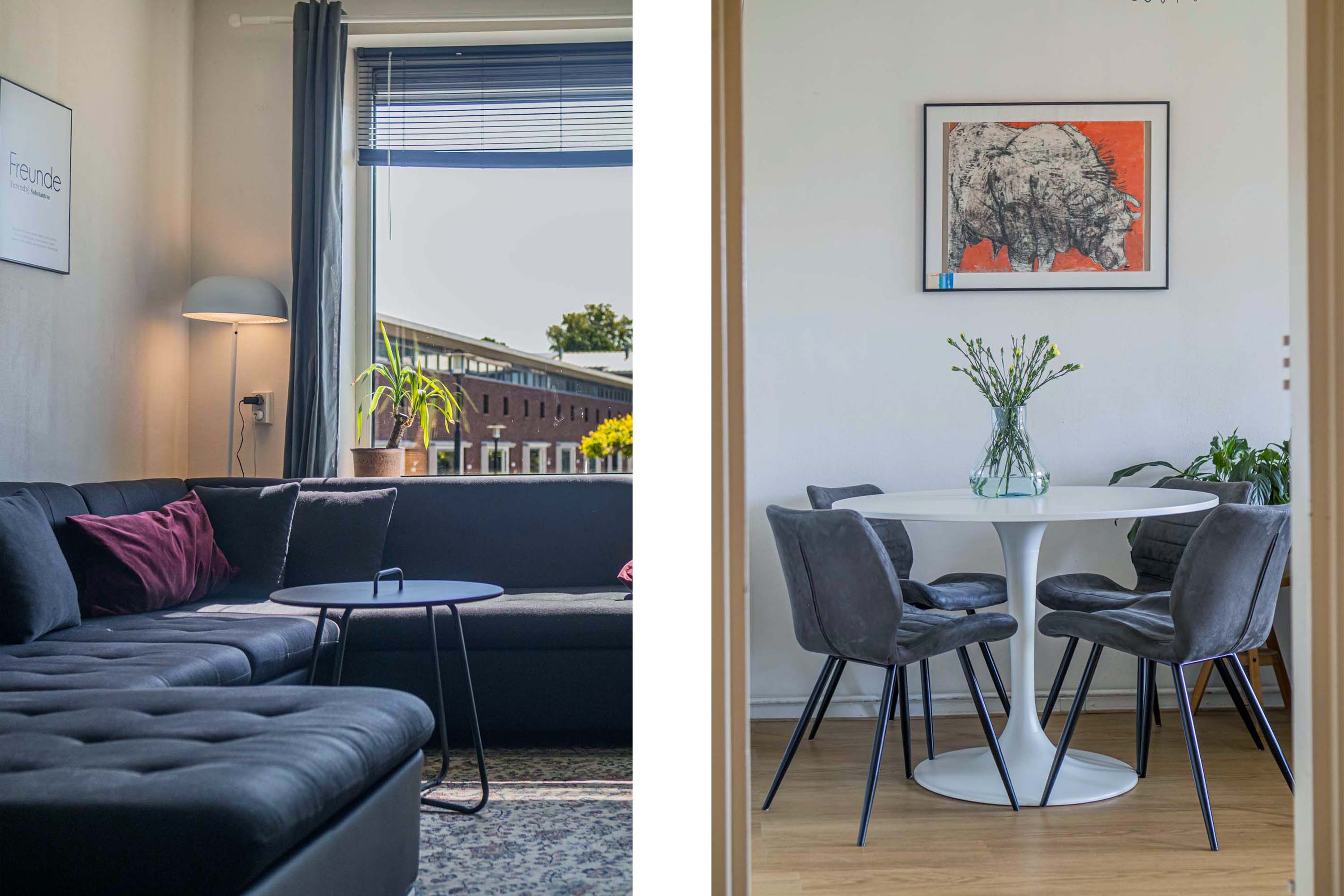 Wanneer je de leefruimte binnenstapt, valt direct het prachtige natuurlijke licht op. De ruimte is ingericht met een eettafel en een comfortabele bank. Vanuit deze fijne leefruimte zo het balkon op om heerlijk van het buitenleven te genieten.