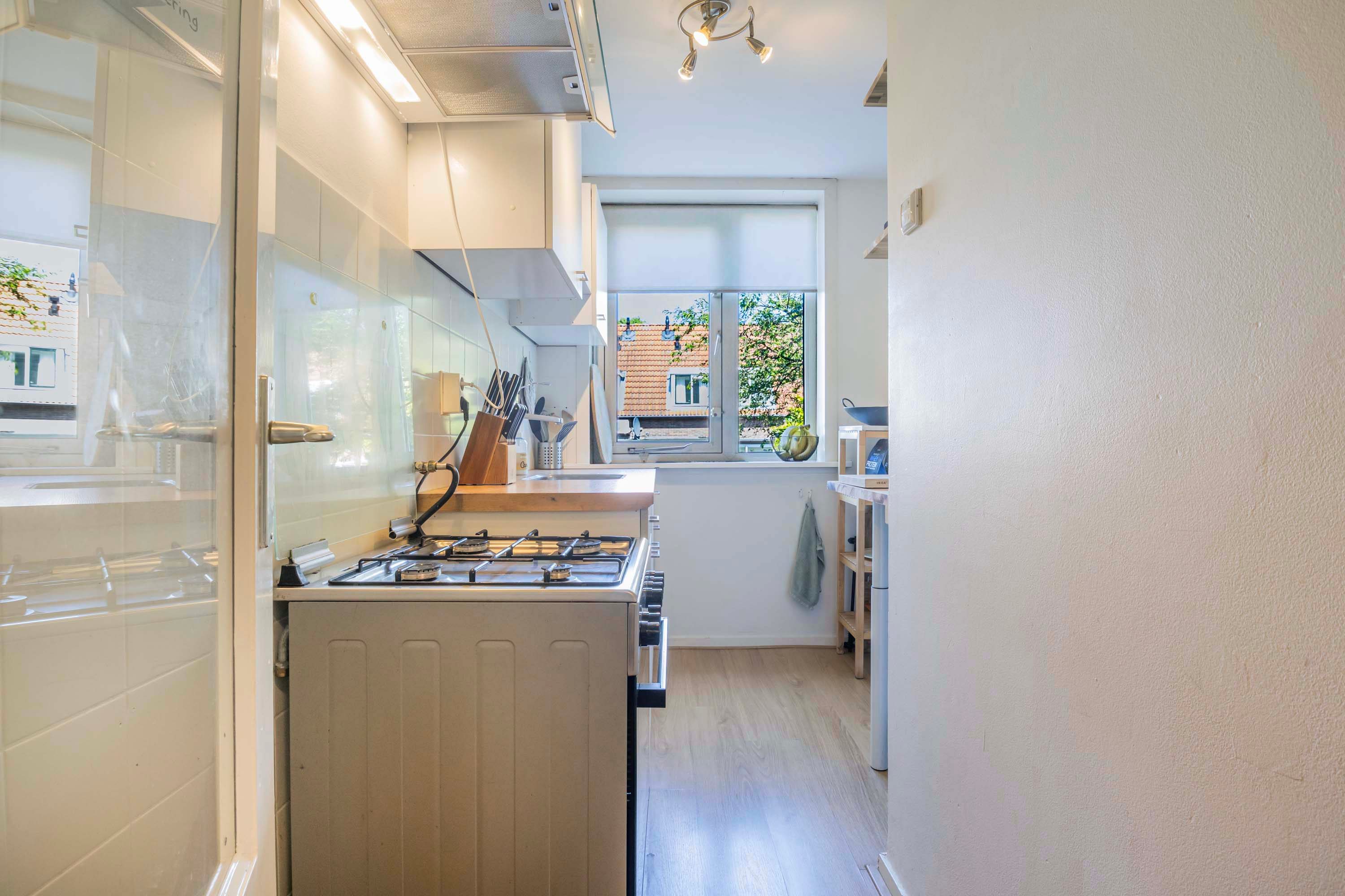 Via de gang bereik je de keuken, waar je een lichte en praktische opstelling vindt met voldoende opbergruimte dankzij de bovenkastjes. Ook is hier een wasmachineaansluiting aanwezig. Extra fijn: vanuit de keuken stap je zo het balkon op om even van de frisse buitenlucht te genieten!