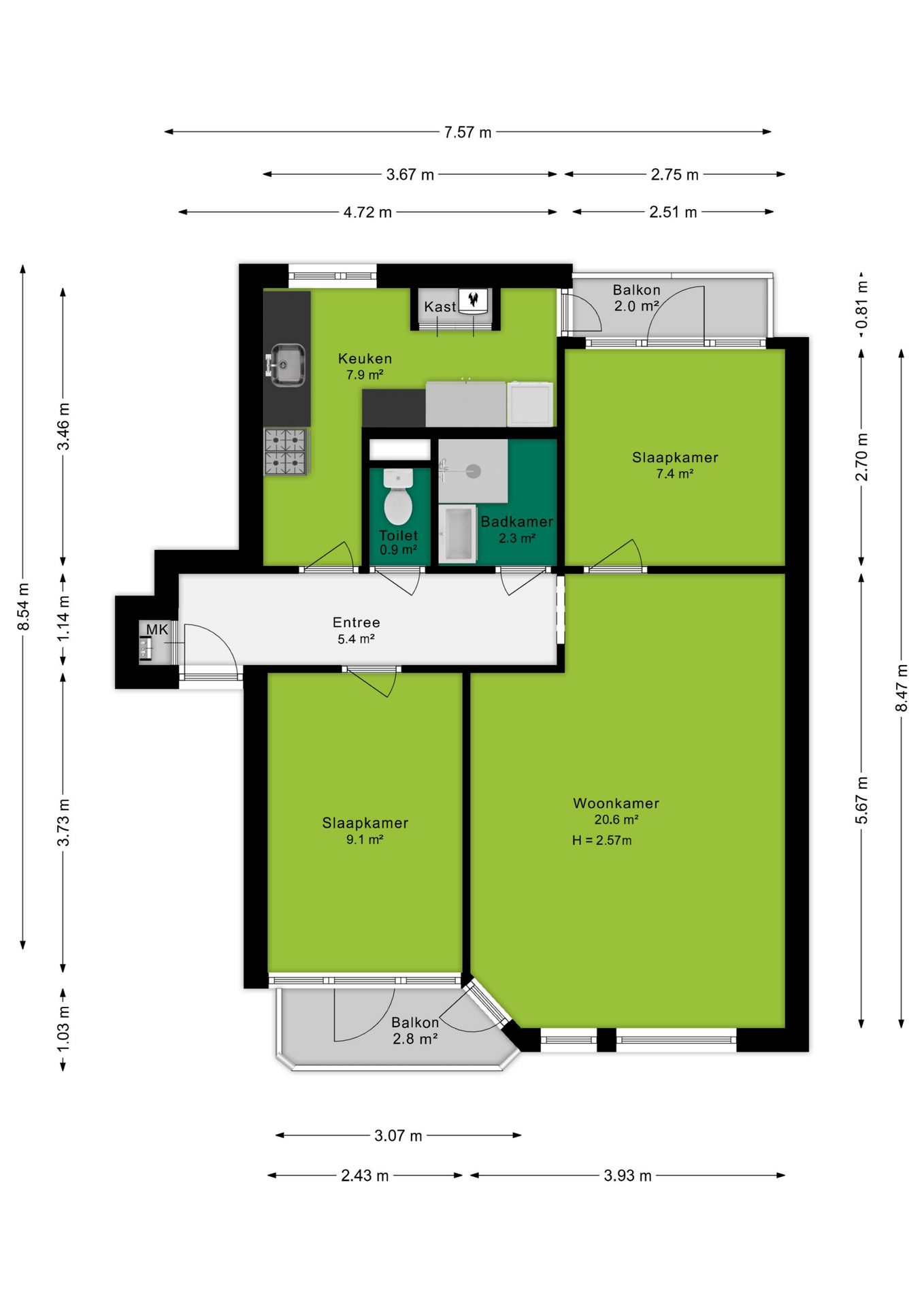 Het appartement beschikt over 2 fijne slaapkamers: een slaapkamer van 9m² aan de voorzijde en een slaapkamer van 7m² aan de achterzijde. Vanuit de slaapkamer(s) stap je zo vanuit bed het balkon op om even heerlijk van de buitenlucht te genieten.