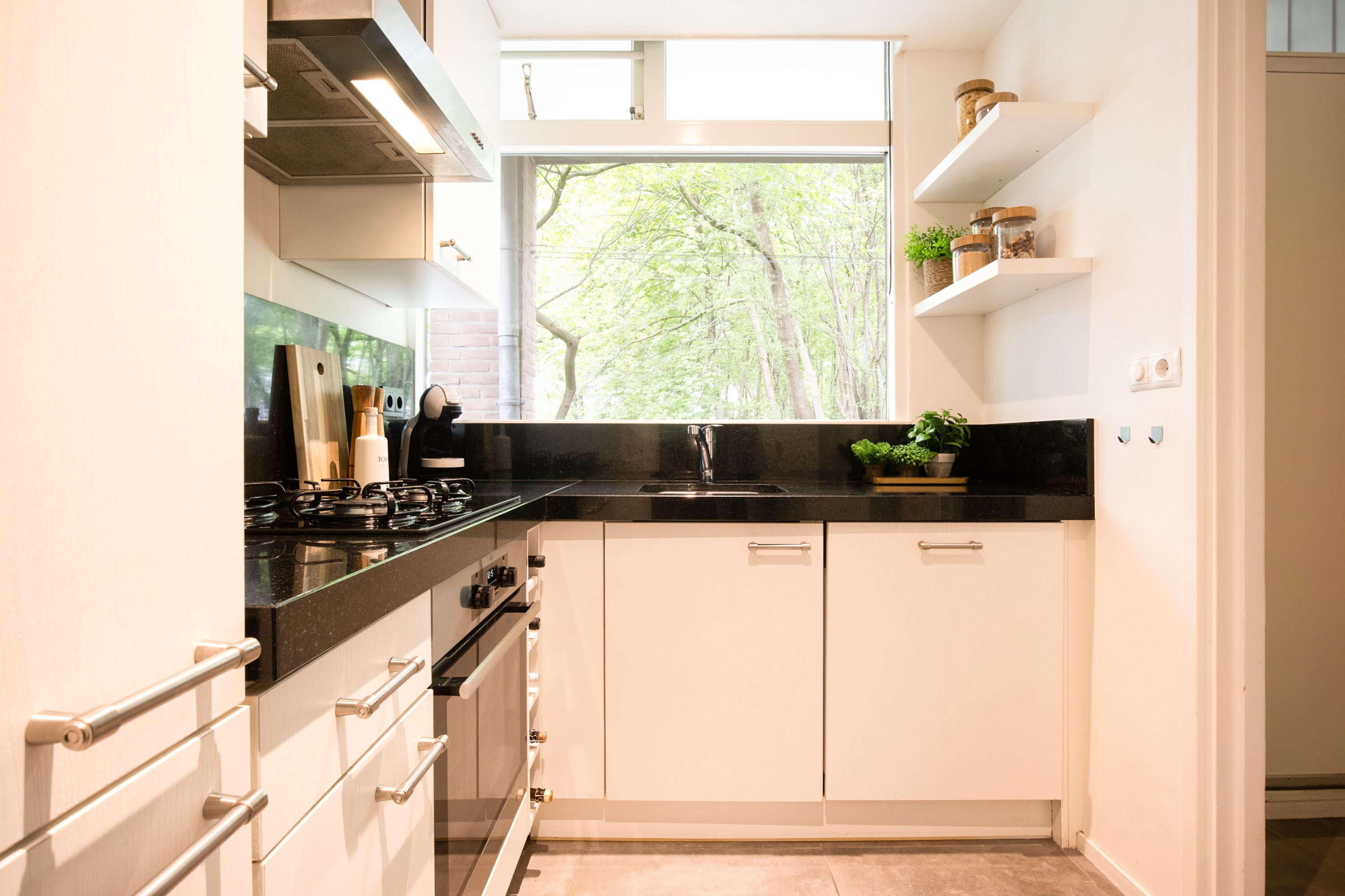 Vanuit de keuken heb je ook weer een mooi uitzicht naar buiten toe. De ramen aan de achterzijde zijn voorzien van dubbele beglazing en houten kozijnen.