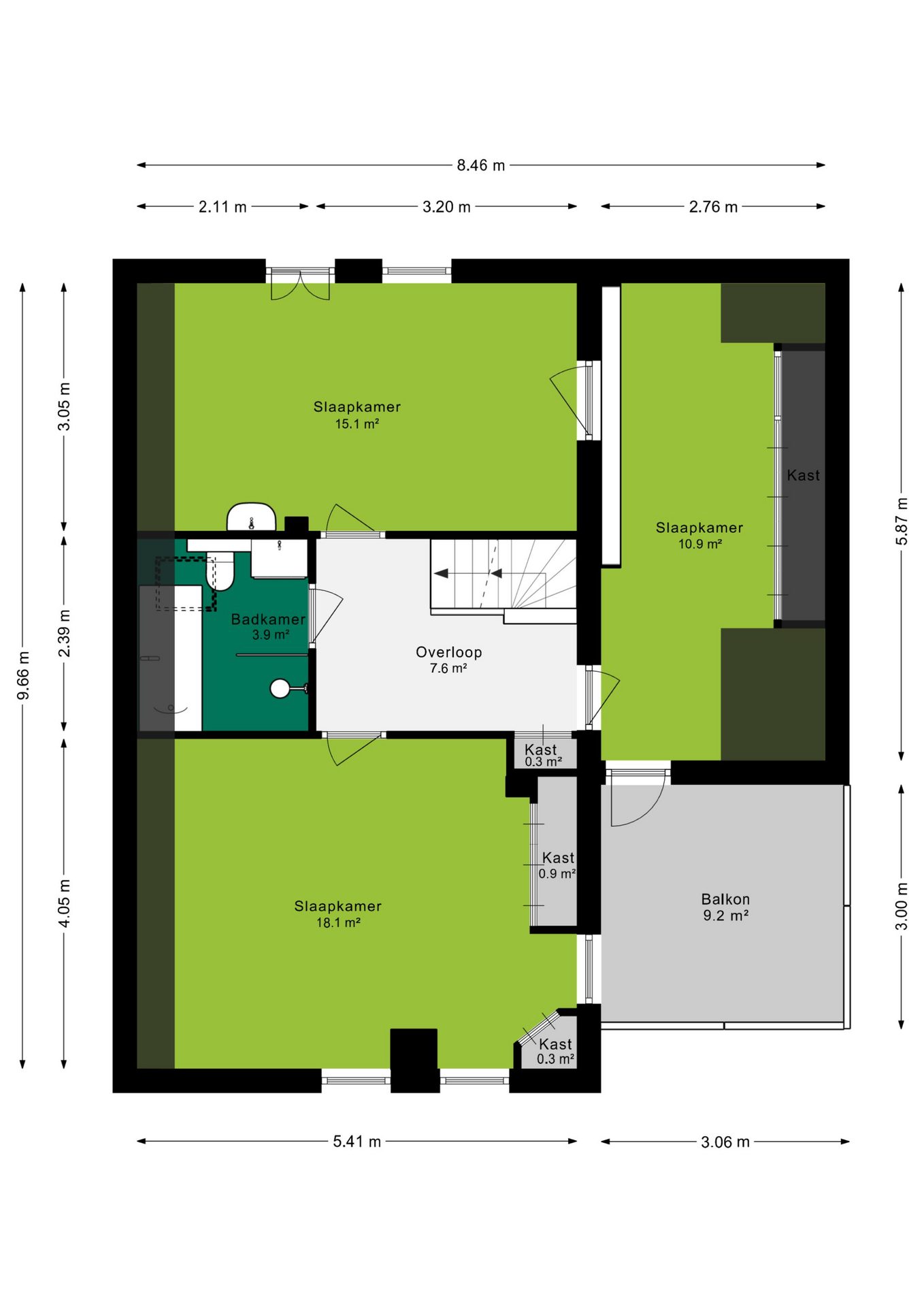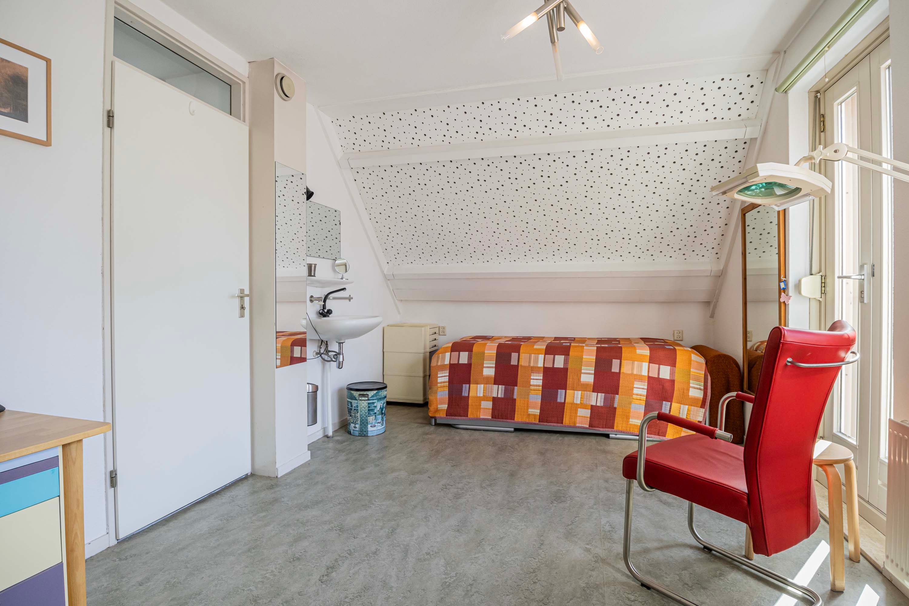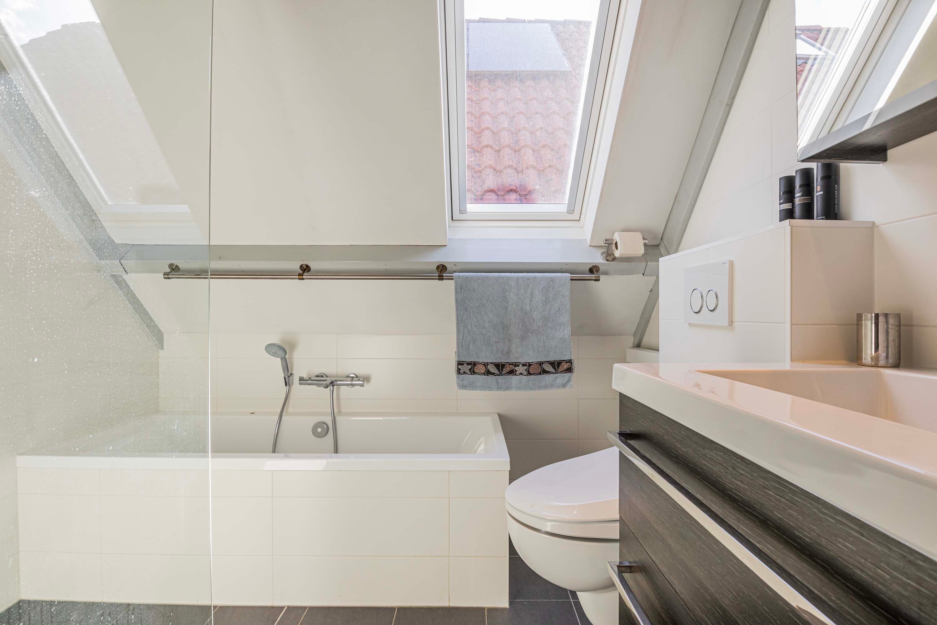 Eenmaal op de eerste verdieping vind je drie ruime slaapkamers. De slaapkamer aan de voorzijde van de woning is 18m² groot en is voorzien van een vaste kast, ideaal voor al jouw spullen. De tweede slaapkamer, met een oppervlakte van 11m², biedt directe toegang tot het balkon en laat zo het daglicht binnenstromen. De derde slaapkamer, gelegen aan de achterzijde, heeft een eigen wastafel voor extra gemak. De stijlvolle badkamer laat niets te wensen over: hier vind je een ontspannend ligbad, een praktische inloopdouche met sunshower, een modern wastafelmeubel en een wc.