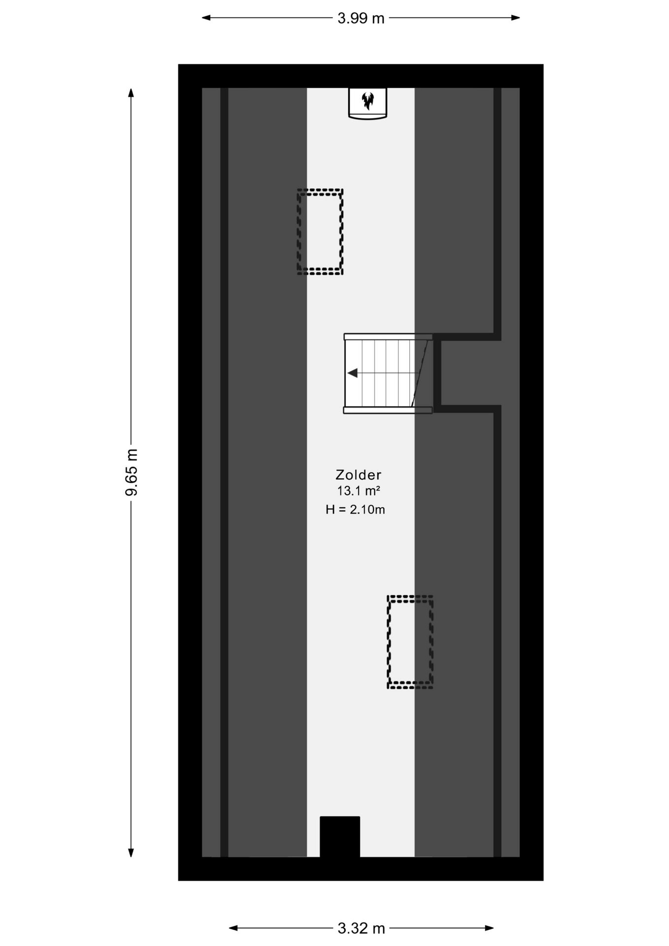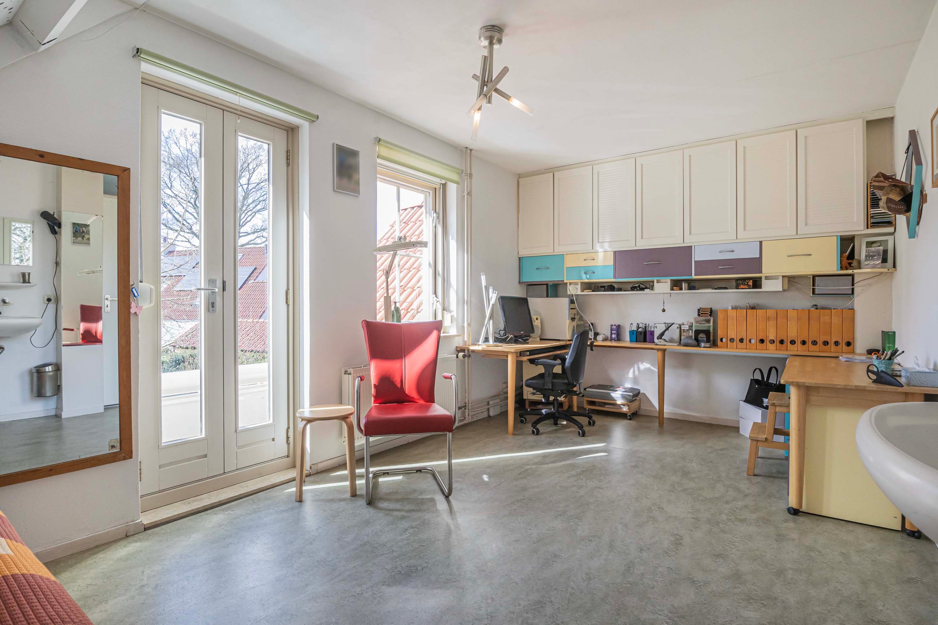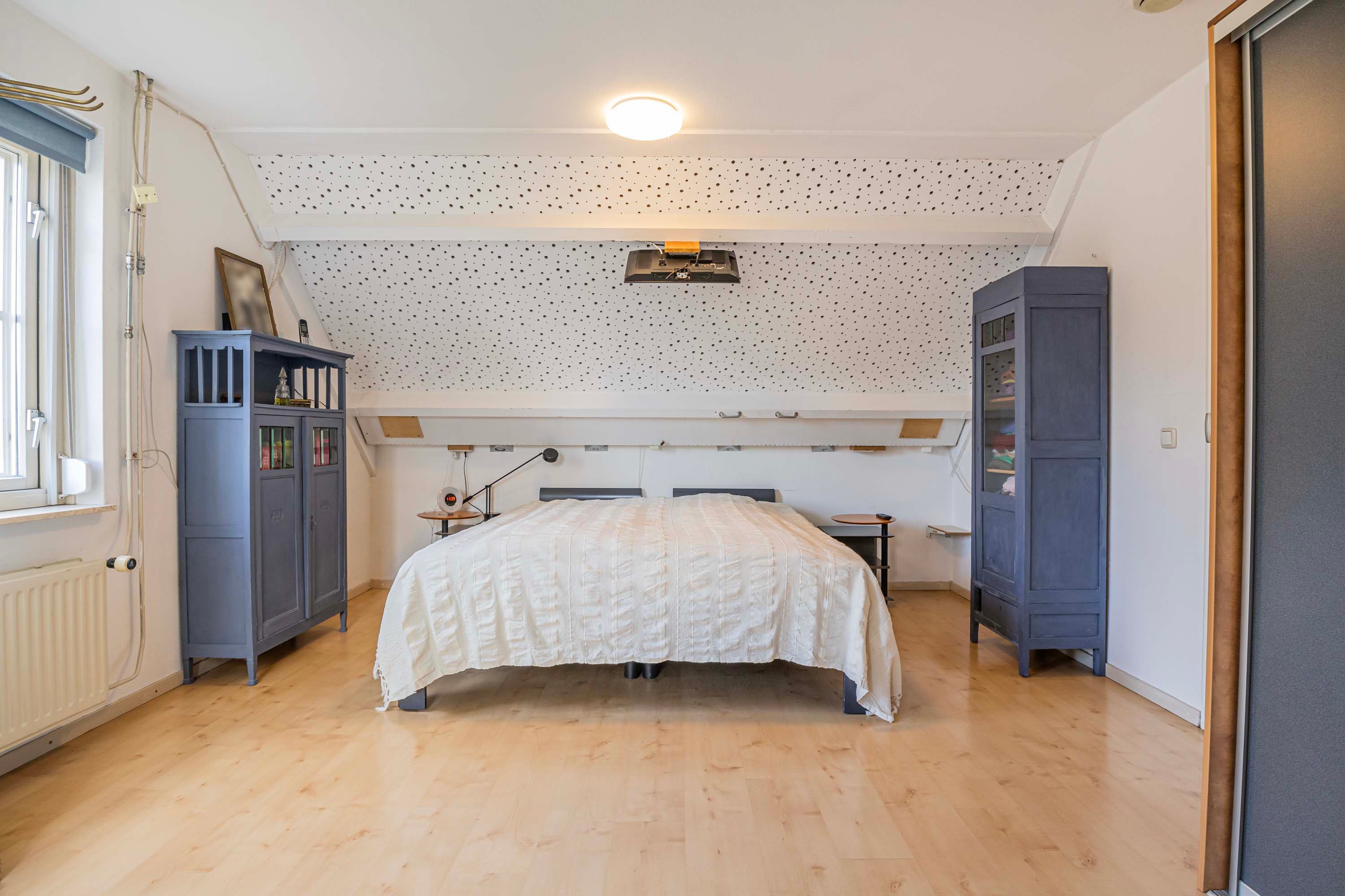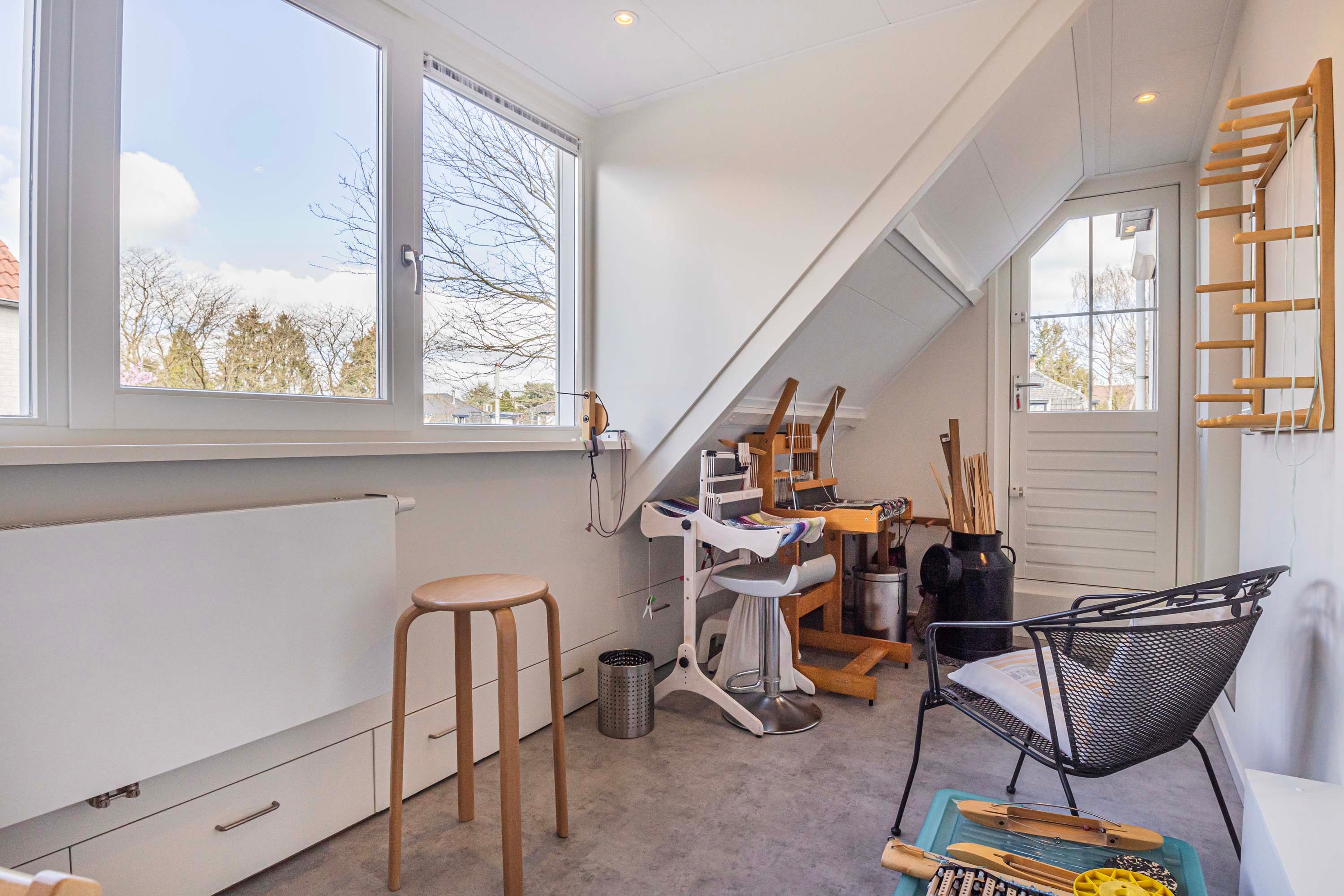 Via een vaste trap bereik je de tweede verdieping, waar één grote open ruimte volop mogelijkheden biedt. Of je het nu inricht als opslagruimte voor al je spullen of als een creatieve atelier, je kunt deze ruimte op diverse manier benutten.