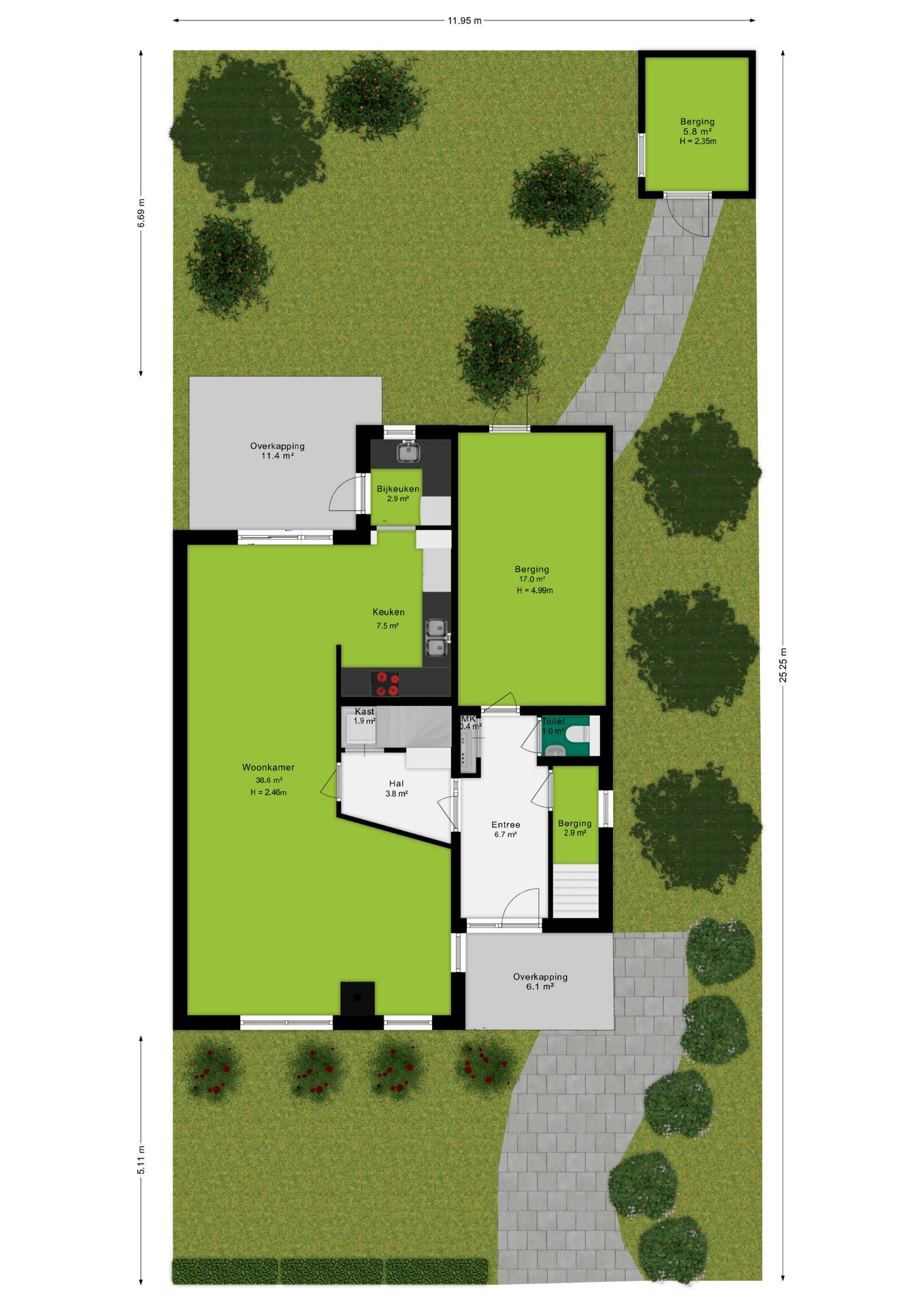 Verderop in de tuin staat een stenen berging van 6 m², ideaal voor je opslagbehoeften of als extra plek voor tuingereedschap.