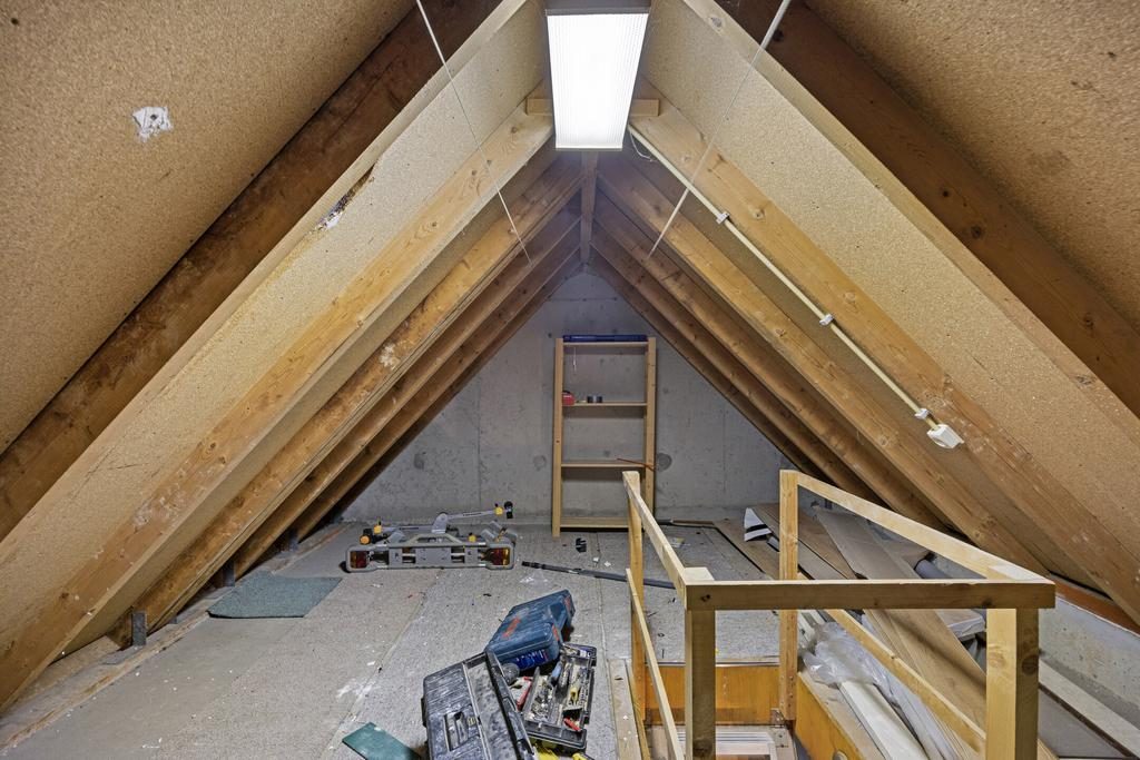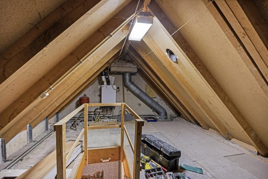 Via een vlizotrap bereik je de bergzolder. Hier vind je de cv-installatie (HR-ketel Intergas HRE, 2016) en volop bergruimte op de stevige betonnen vloer.