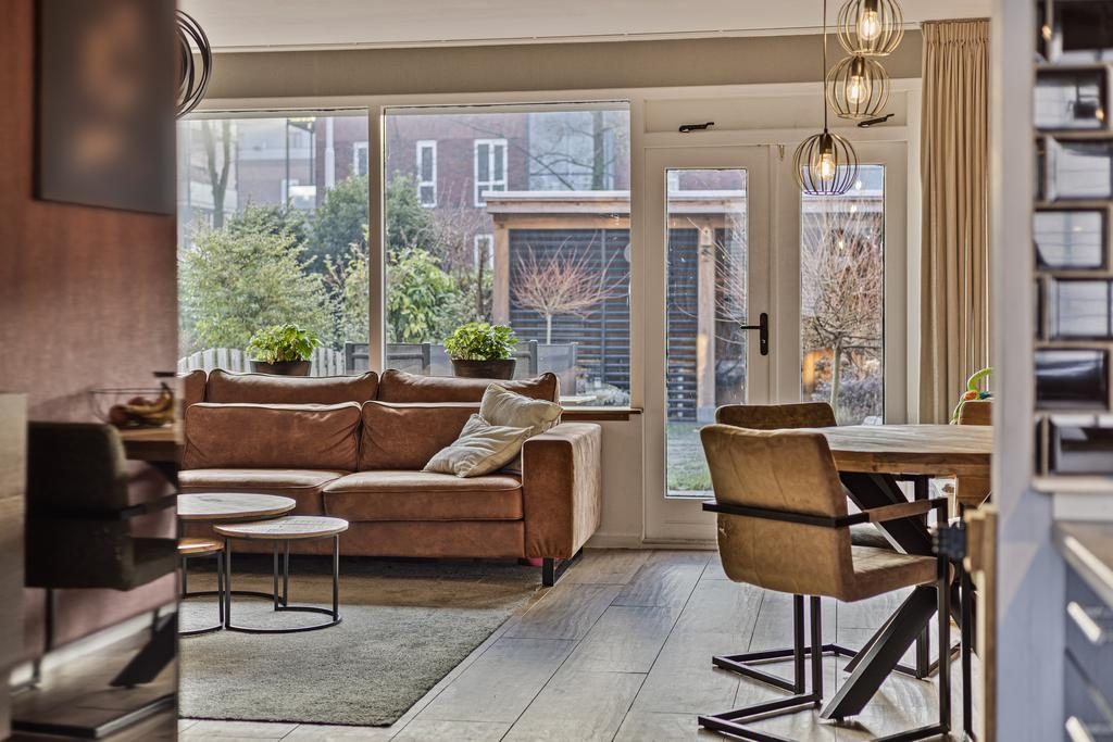 De woonkamer is een fijne, tuingerichte ruimte met grote ramen (zuid) en openslaande deuren naar de zonnige achtertuin. De vloer op de begane grond is afgewerkt met een hoogwaardige keramisch parketvloer – een luxe plavuizen vloer met een stijlvolle uitstraling – en voorzien van comfortabele vloerverwarming.