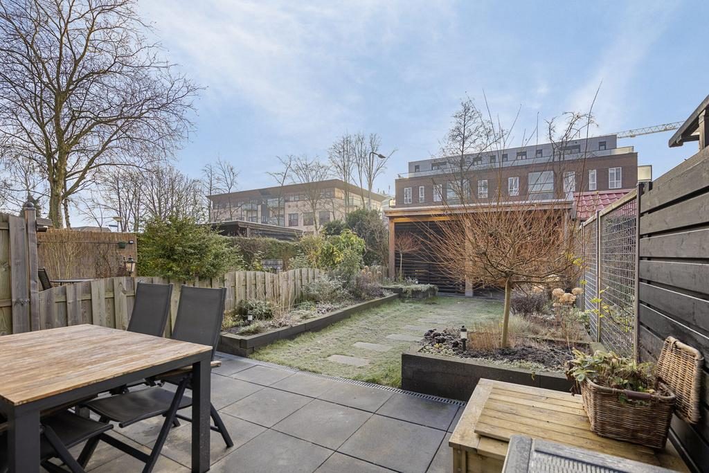 De tuin is deels bestraat, voorzien van nette erfafscheidingen en mooie plantenbakken.