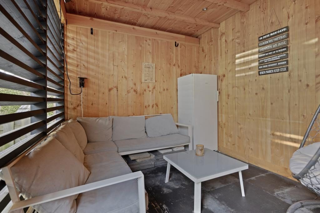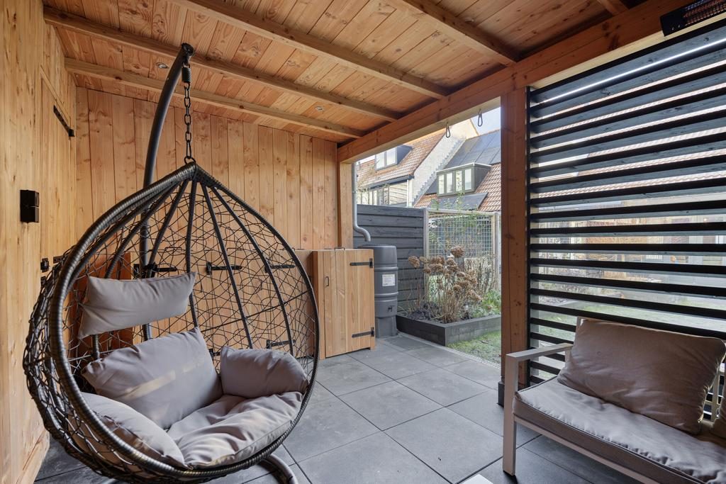 Achterin de tuin staat een robuuste Douglashouten veranda, een heerlijke plek om te ontspannen in de zomer.