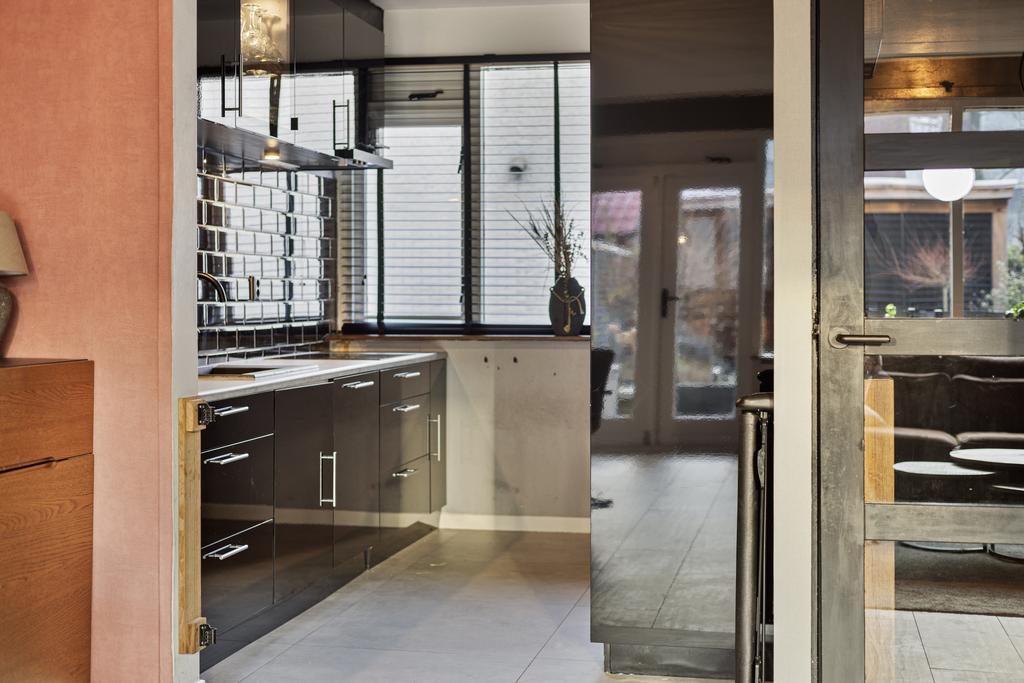 Aan de voorzijde van de woning bevindt zich een moderne, zwarte inbouwkeuken (2022) met alle gemakken: een keramische kookplaat, afzuigkap, koelkast, vriezer, vaatwasser, oven en magnetron. Deze keuken combineert functionaliteit met een strakke, eigentijdse uitstraling.